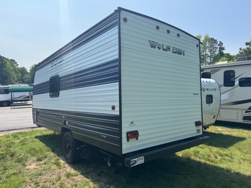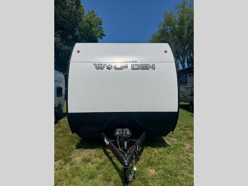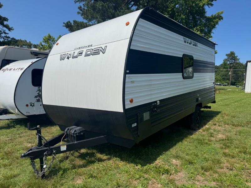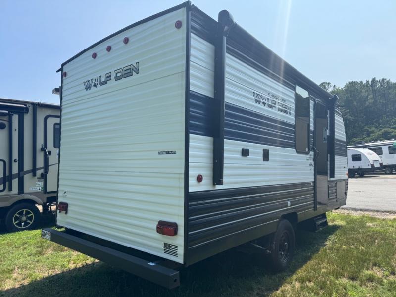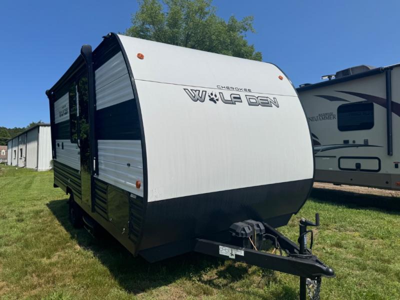 The Cherokee Wolf Den travel trailers by Forest River are lightweight for easy towing, while still including the camping essentials you're looking for! There are a variety of floorplans to choose from, including bunkhouse models, couple's units, and even all-electric floorplans! You'll find a tub/shower in each travel trailer, a comfortable queen bed, seating spaces to relax on, and kitchen amenities that will make your space feel more like home. There are storage spaces inside for your belongings plus outdoor storage for fishing gear, camp chairs, tools, and more! Start a new adventure today in a Cherokee Wolf Den travel trailer today!