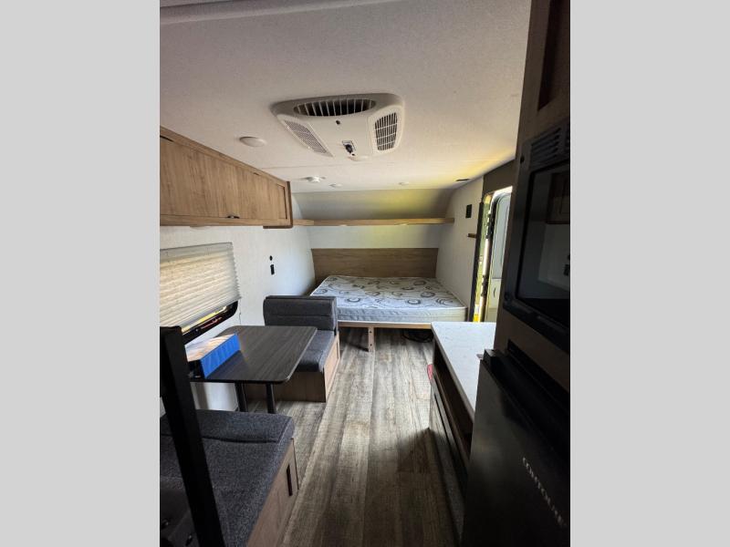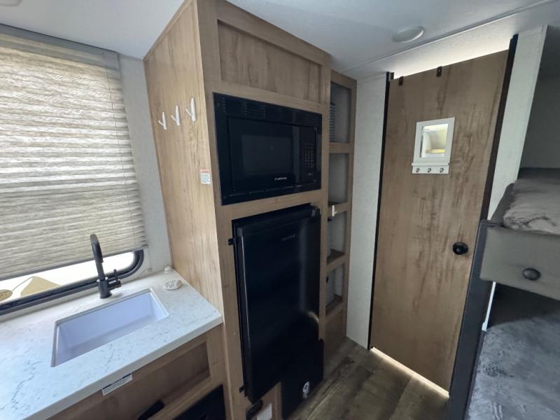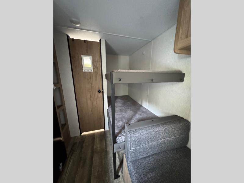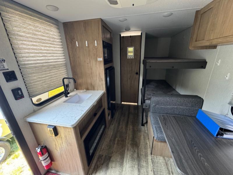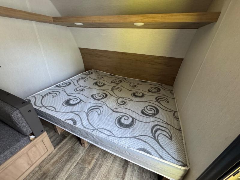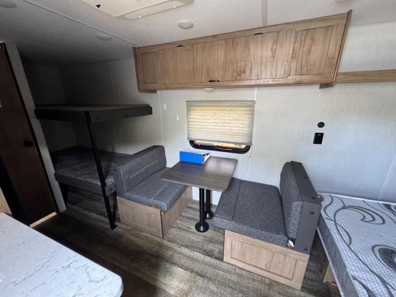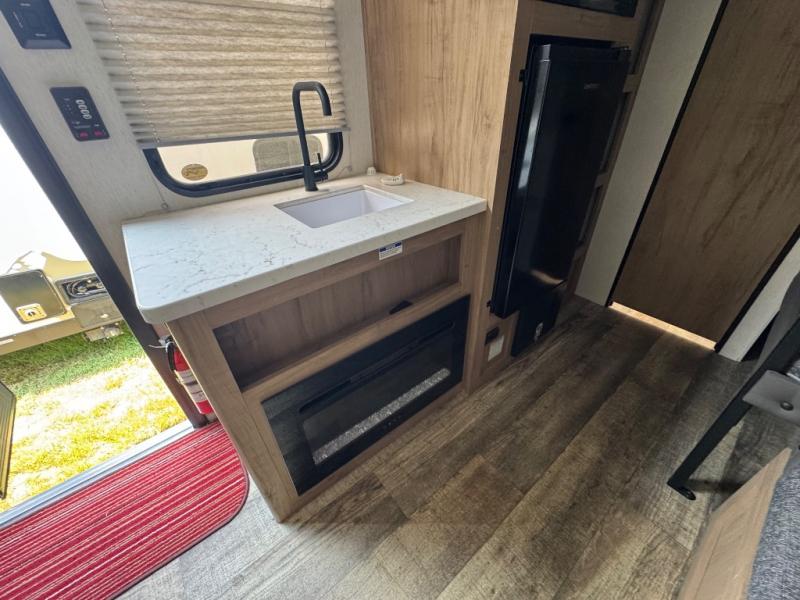 Enjoy family adventures in this all-electric bunk model which features sleeping for four or six depending on size with a queen bed up front, oversized bunks in the rear roadside corner, and you could even convert the booth dinette to sleep more. Inside, you will find ample storage with overhead cabinets and a large shelf above the queen bed, plus four shelves next to the refrigerator and microwave/air fryer that feature decorative storage bins for your things. Use this space for pantry items, towels, or clothing storage. There is even a 5,000 BTU electric fireplace below the counter and sink to bring you a bit of heat on those chilly nights, and you will find TV prep both inside and out if you wish to add TVs for more entertainment. On the outside, you will also find a 12' awning and plenty of outside storage for your camping gear, plus more!