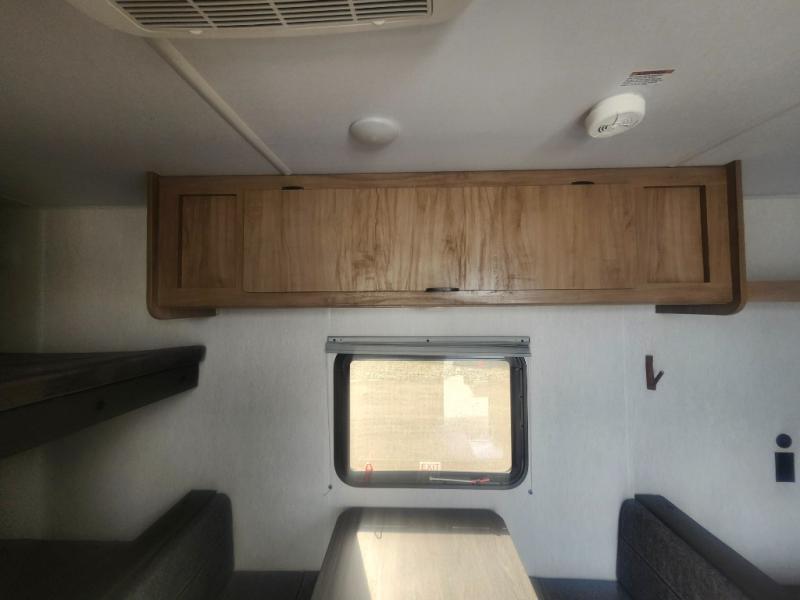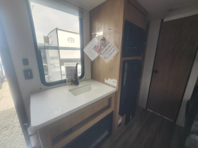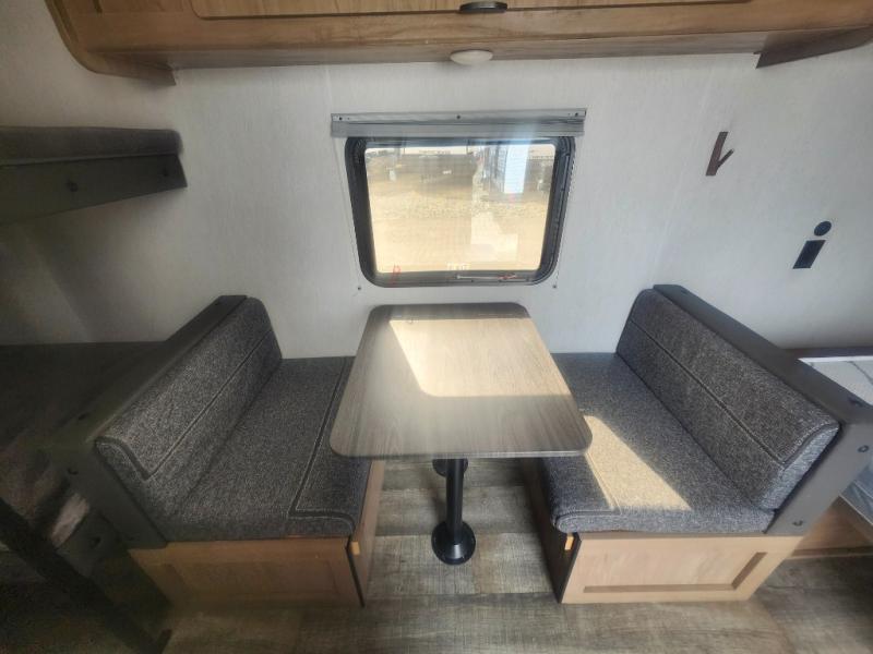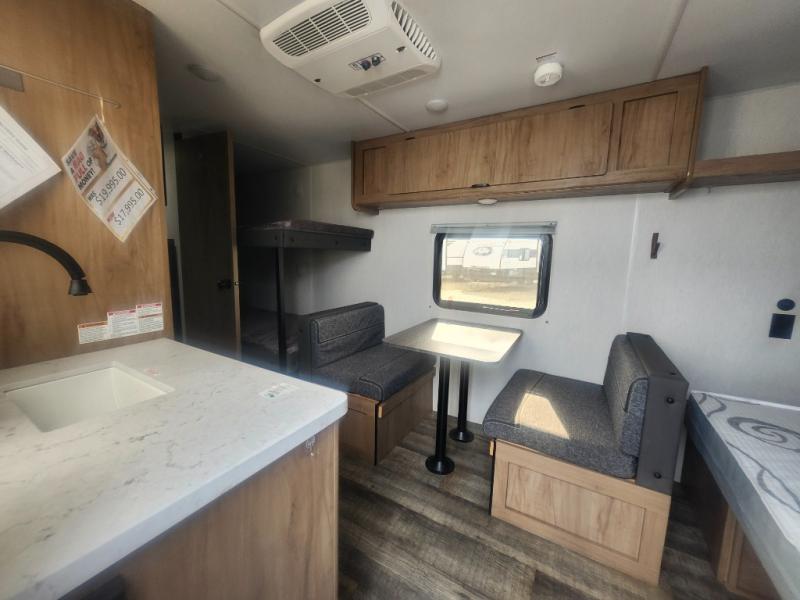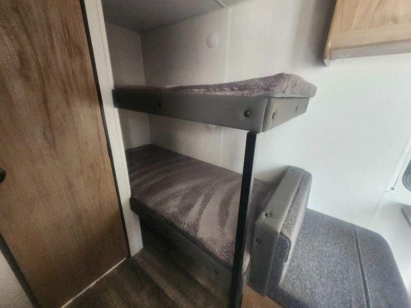 Enjoy family adventures in this all-electric bunk model which features sleeping for four or six depending on size with a queen bed up front, oversized bunks in the rear roadside corner, and you could even convert the booth dinette to sleep more. Inside, you will find ample storage with overhead cabinets and a large shelf above the queen bed, plus four shelves next to the refrigerator and microwave/air fryer that feature decorative storage bins for your things. Use this space for pantry items, towels, or clothing storage. There is even a 5,000 BTU electric fireplace below the counter and sink to bring you a bit of heat on those chilly nights, and you will find TV prep both inside and out if you wish to add TVs for more entertainment. On the outside, you will also find a 12' awning and plenty of outside storage for your camping gear, plus more!