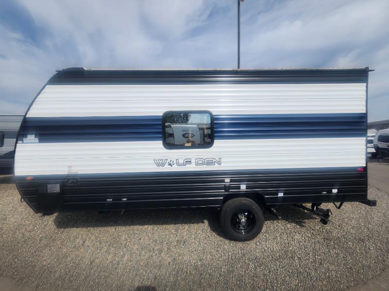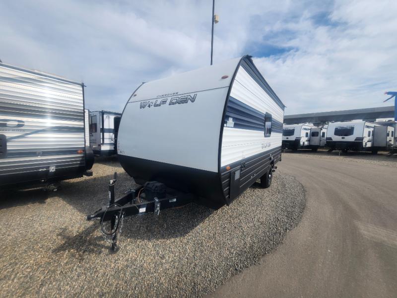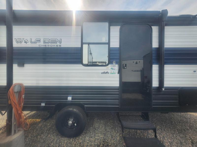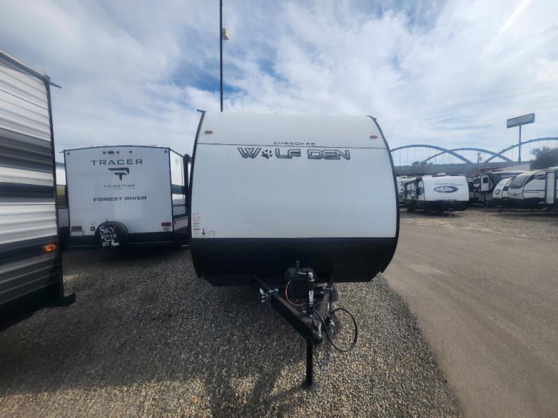The Cherokee Wolf Den travel trailers by Forest River are lightweight for easy towing, while still including the camping essentials you're looking for! There are a variety of floorplans to choose from, including bunkhouse models, couple's units, and even all-electric floorplans! You'll find a tub/shower in each travel trailer, a comfortable queen bed, seating spaces to relax on, and kitchen amenities that will make your space feel more like home. There are storage spaces inside for your belongings plus outdoor storage for fishing gear, camp chairs, tools, and more! Start a new adventure today in a Cherokee Wolf Den travel trailer today!