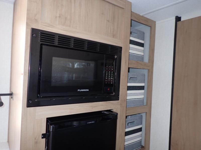 Enjoy family adventures in this all-electric bunk model which features sleeping for four or six depending on size with a queen bed up front, oversized bunks in the rear roadside corner, and you could even convert the booth dinette to sleep more. Inside, you will find ample storage with overhead cabinets and a large shelf above the queen bed, plus four shelves next to the refrigerator and microwave/air fryer that feature decorative storage bins for your things. Use this space for pantry items, towels, or clothing storage. There is even a 5,000 BTU electric fireplace below the counter and sink to bring you a bit of heat on those chilly nights, and you will find TV prep both inside and out if you wish to add TVs for more entertainment. On the outside, you will also find a 12' awning and plenty of outside storage for your camping gear, plus more!
