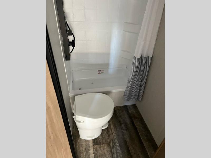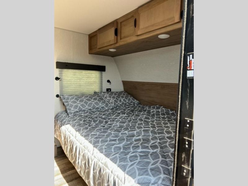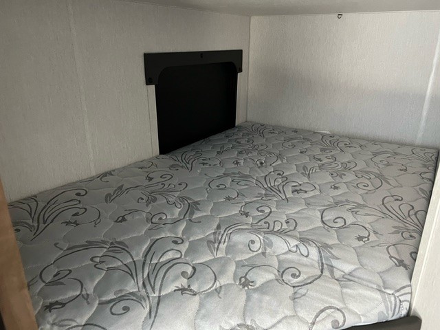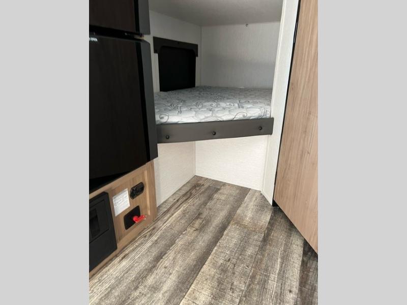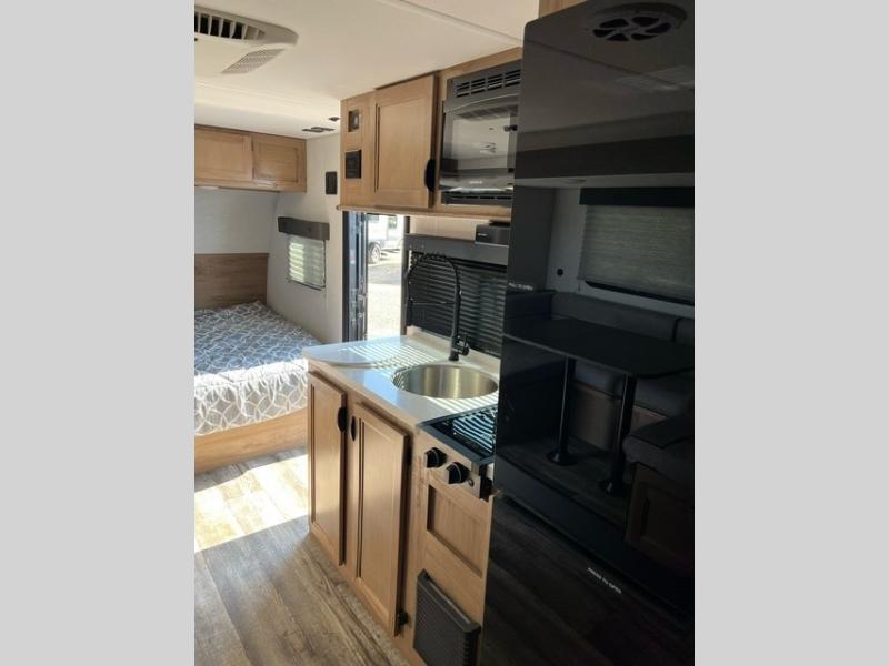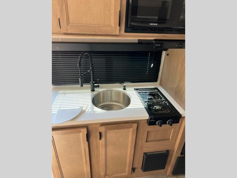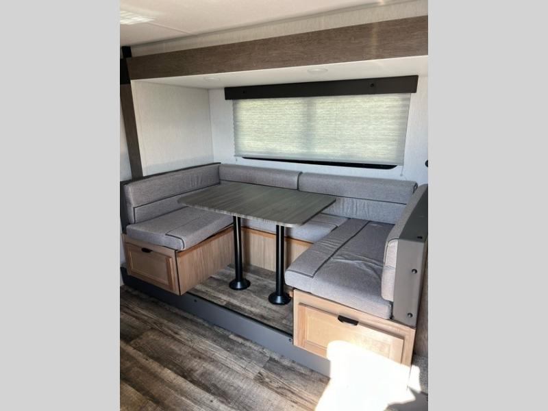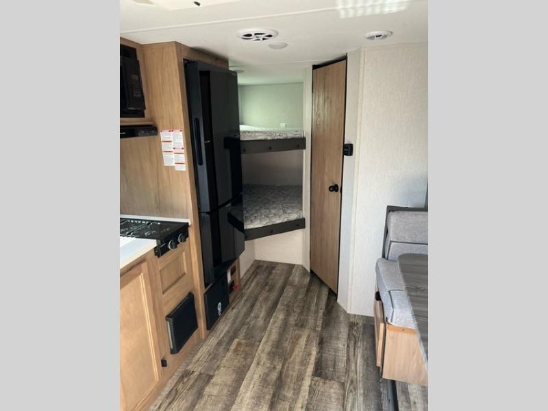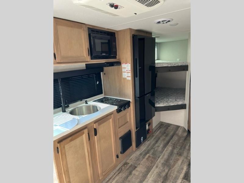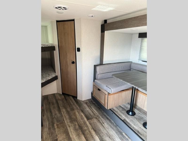 This family travel trailer is ready to head to the campground whenever you are! The kiddos can sleep on the set of double-size bed bunks and you can sleep on the front queen bed, plus the U-shaped dinette slide can also transform into an extra sleeping space when you aren't using it to enjoy a meal. You can prepare your delicious meals on the flushmount range or at the outside mini kitchen and stay protected by the power awning. The exterior not only has outside storage and an outside TV mount, but also features an outside storage plus door for access to the storage space underneath the bottom bunk bed. The rear corner bath allows everyone to stay clean and refreshed while you camp.