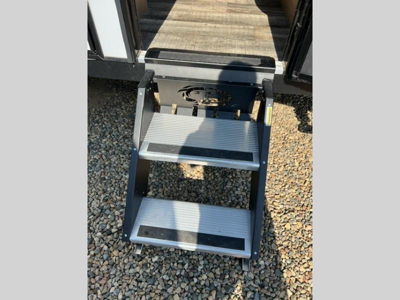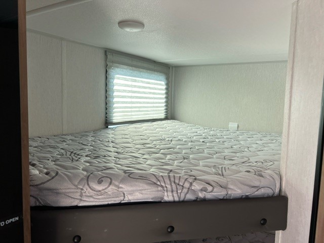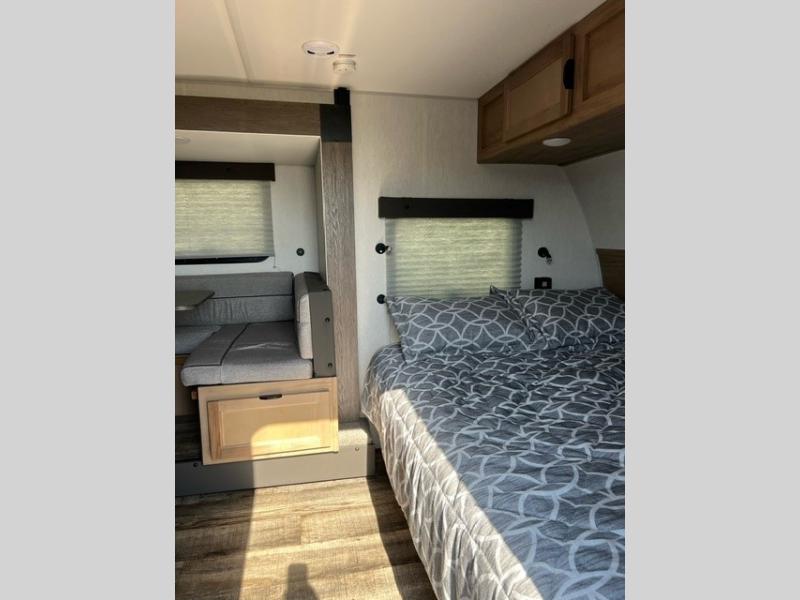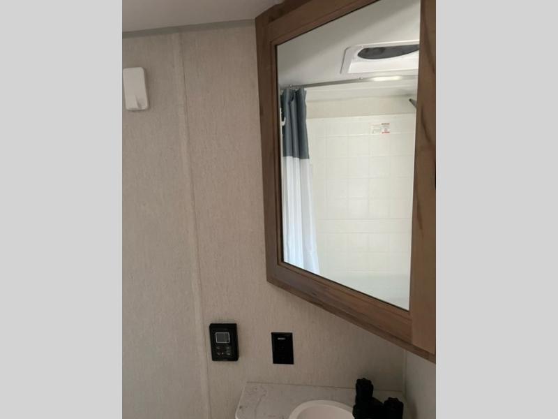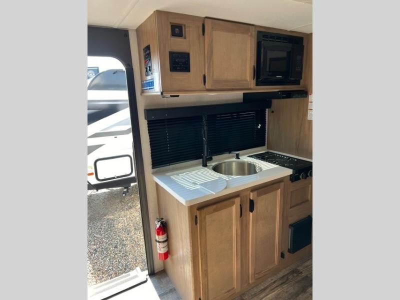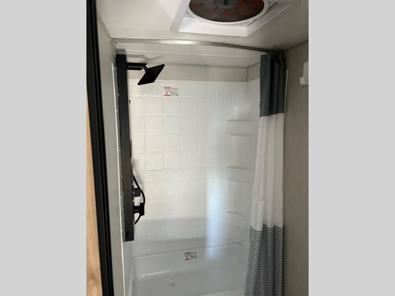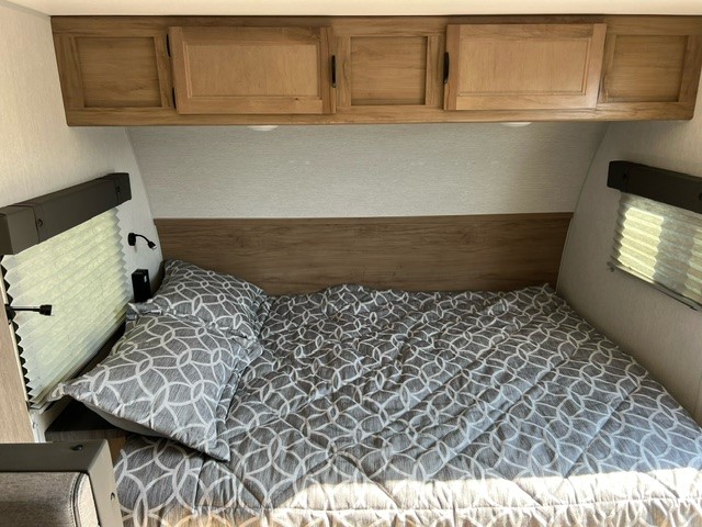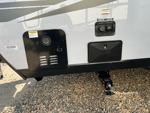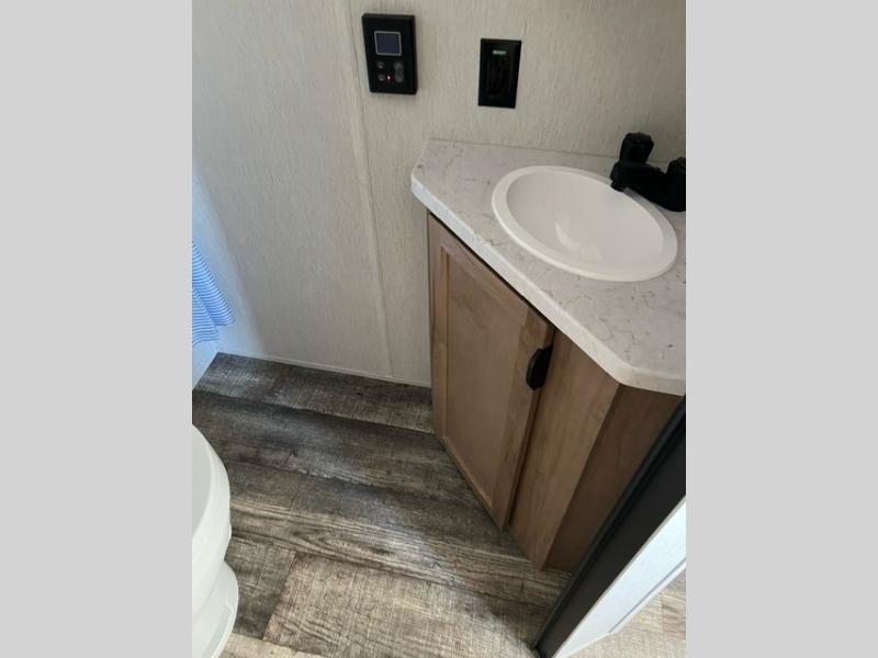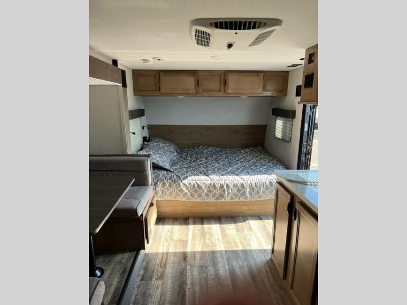 This family travel trailer is ready to head to the campground whenever you are! The kiddos can sleep on the set of double-size bed bunks and you can sleep on the front queen bed, plus the U-shaped dinette slide can also transform into an extra sleeping space when you aren't using it to enjoy a meal. You can prepare your delicious meals on the flushmount range or at the outside mini kitchen and stay protected by the power awning. The exterior not only has outside storage and an outside TV mount, but also features an outside storage plus door for access to the storage space underneath the bottom bunk bed. The rear corner bath allows everyone to stay clean and refreshed while you camp.