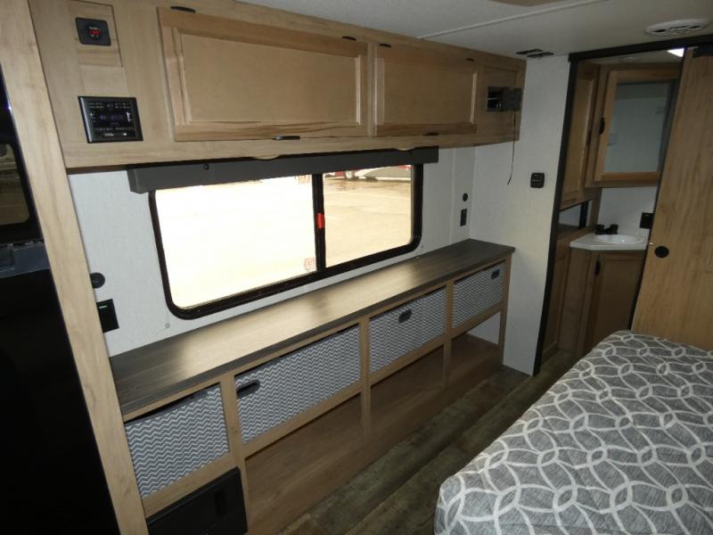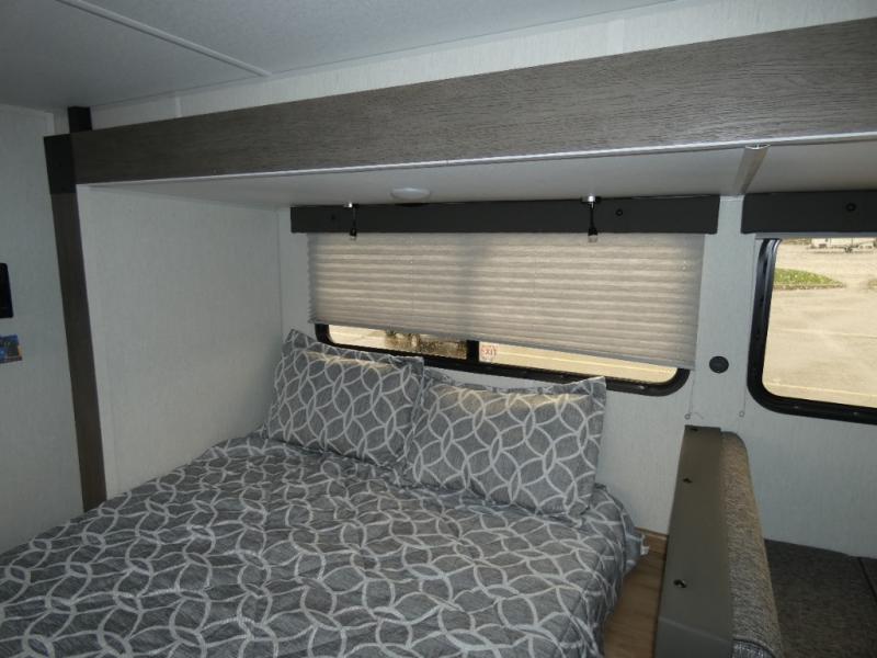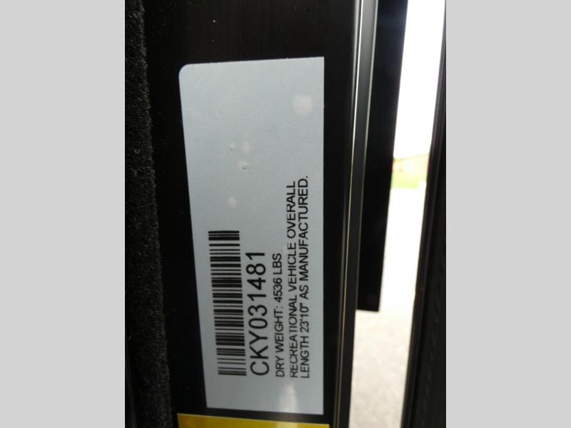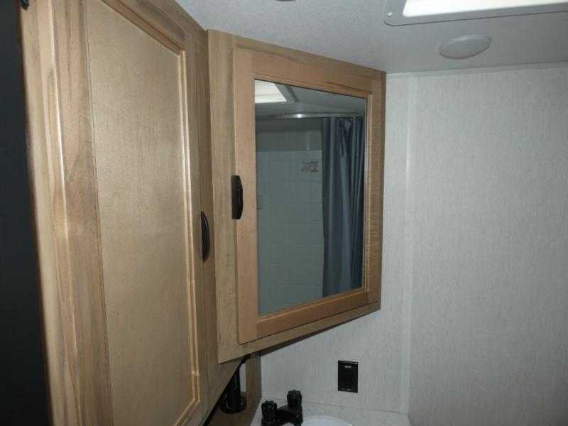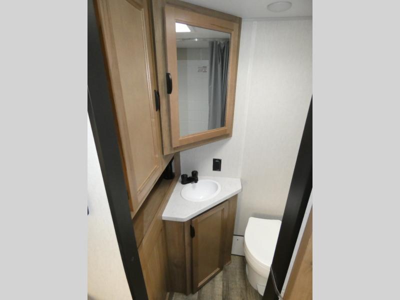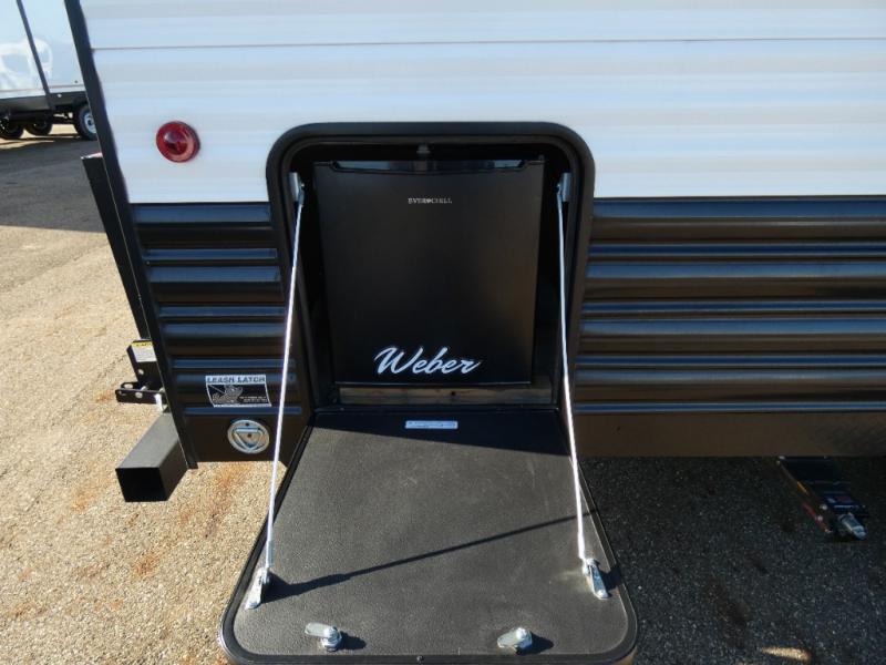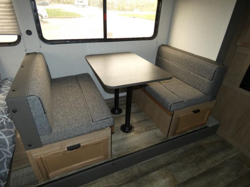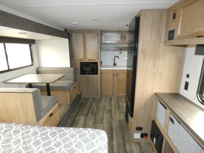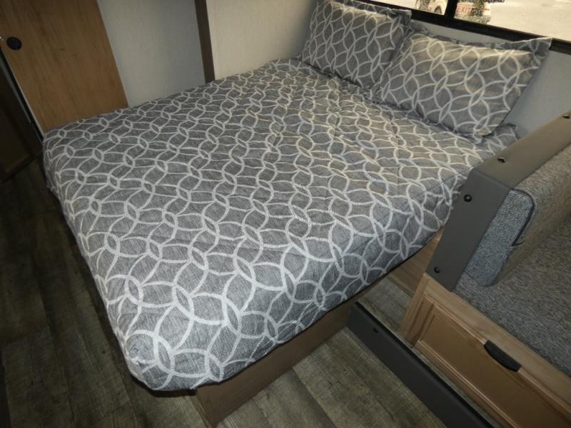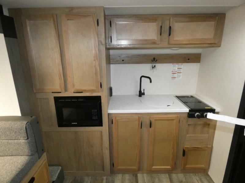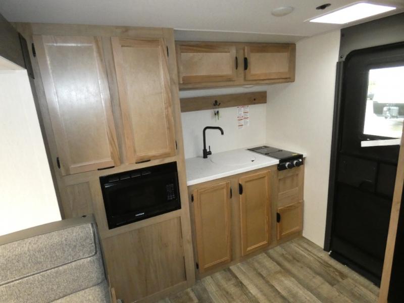Comfortable and cozy is how to describe this couples coach featuring a rear bath and front kitchen layout! The front kitchen offers a large pantry, a round sink for cleaning up, and a flushmount range plus a microwave oven. The refrigerator is just to the left of the entry door and opposite a large slide for added space that includes a bed and booth dinette. You also have an outdoor mini kitchen so when the weather is nice you can enjoy cooking and dining while enjoying your camp surroundings. With a 12' awning and outside TV mount, you could easily make this an enjoyable space to hang out with family and friends in the campground.