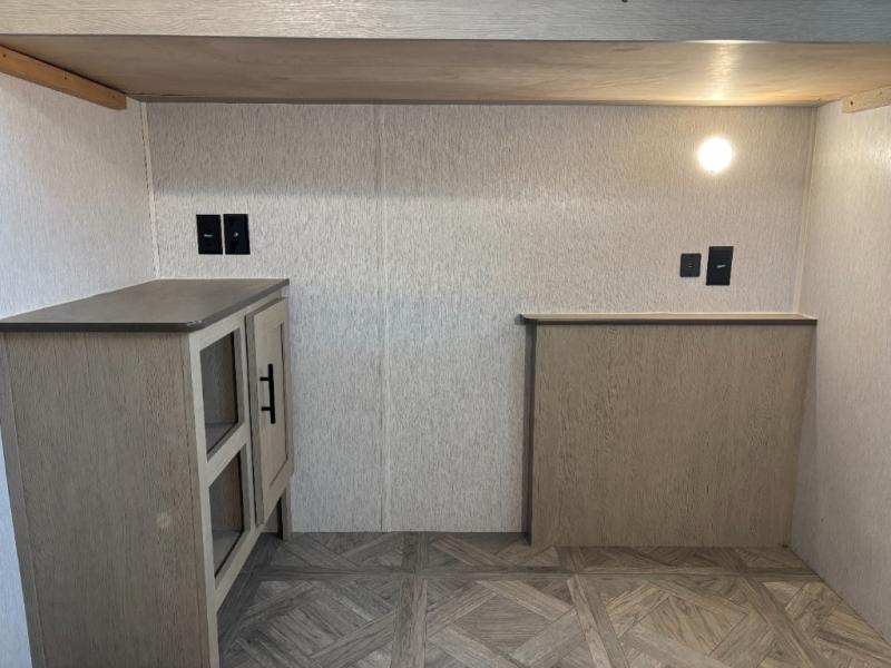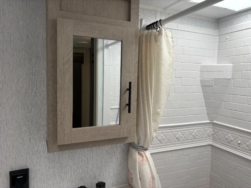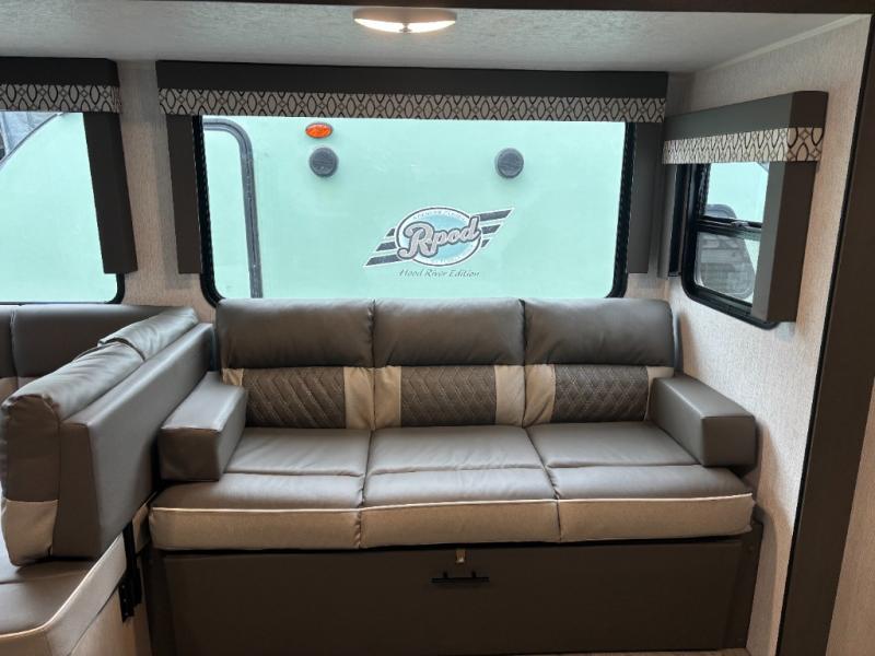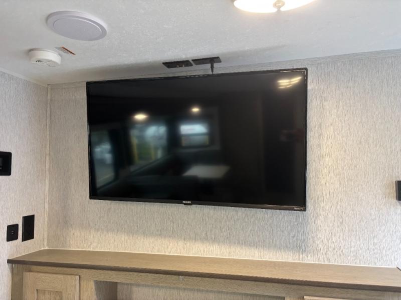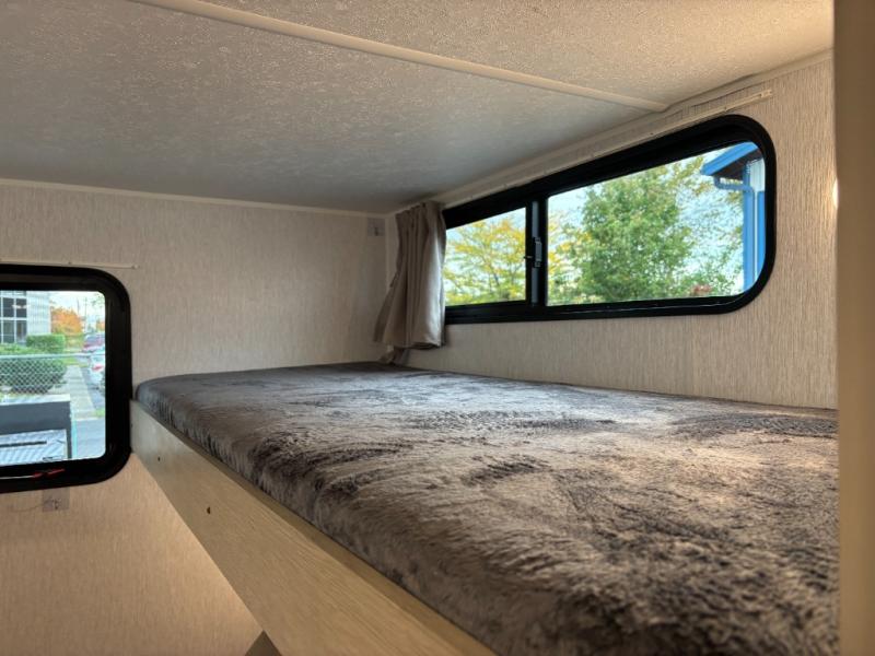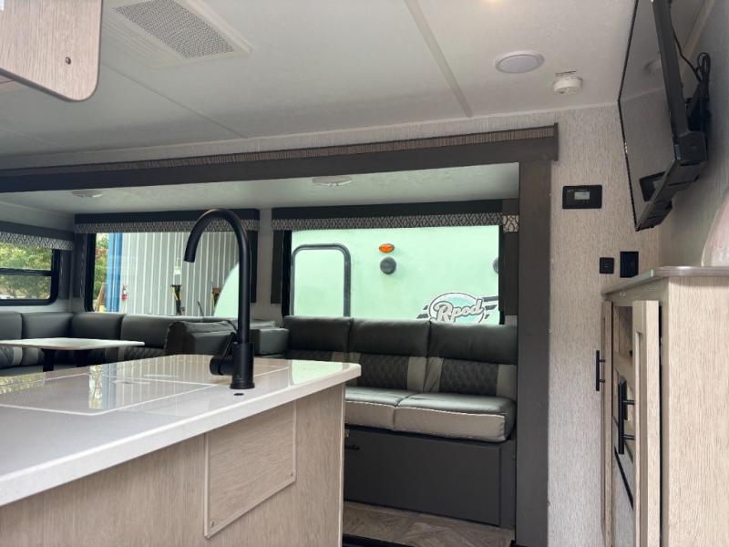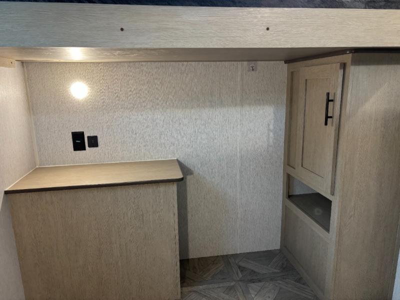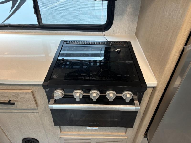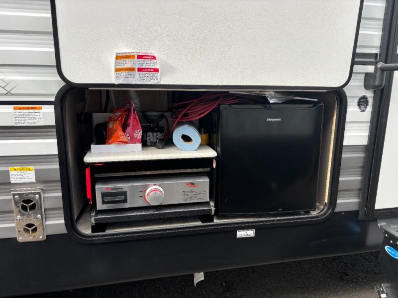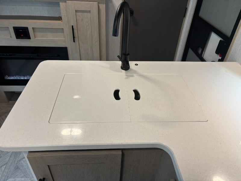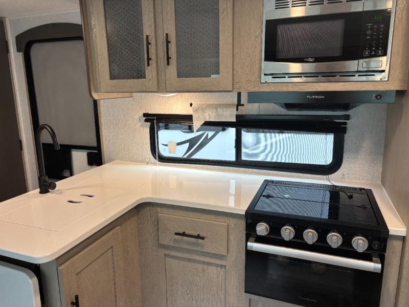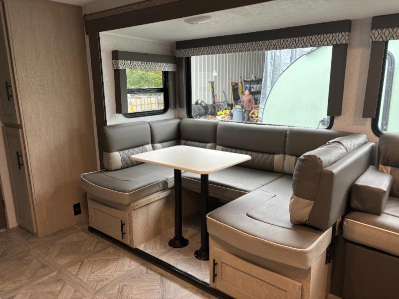 The whole family will love camping in this travel trailer! The rear private bunkhouse has a two bunks above a sofa, one on either side of the unit, and is conveniently next to the full bathroom which has a tub for bath night. The front private bedroom features a queen bed with wardrobes on either side for your clothes. You can even transform the U-shaped dinette and sofa slide into extra sleeping spaces. The chef will have an easy time preparing meals in the kitchen and you can add an optional outside kitchen to breathe in some fresh air while cooking dinner!