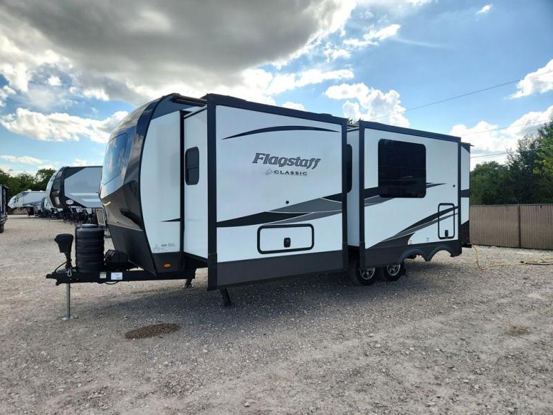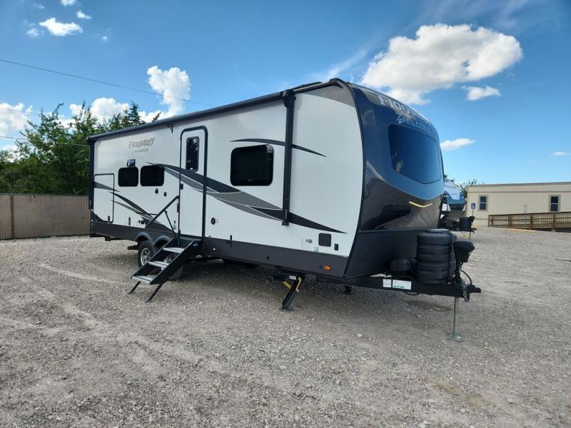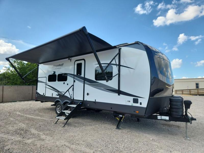 Each one of these Forest River Flagstaff Classic fifth wheels or travel trailers will be your home on wheels! Their quality craftsmanship and attention to detail shines through the surface-coated steel I-beam frame on fifth wheels, the enclosed underbelly, the radius roof with vaulted interior ceilings, and six-sided fully aluminum-framed floor, walls, and roof. Towing your unit will be easy with the torsion axle, Rubber-Ryde suspension, and nitrogen-filled Goodyear Endurance tires. You will even reduce your use of water with the Showermiser water saving system in the bathroom. A few other convenient features you will enjoy include a control panel with WeRV app control, a designer headboard and bedding, and an outside shower with hot and cold water. Come choose your favorite one today!