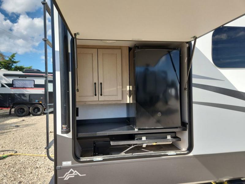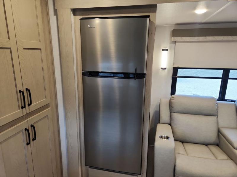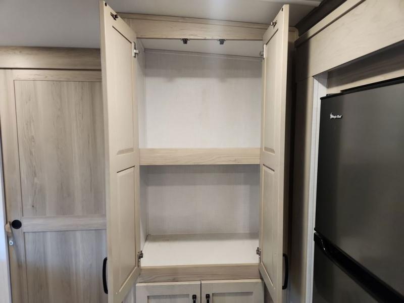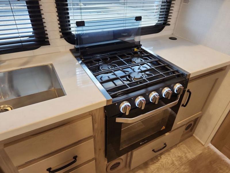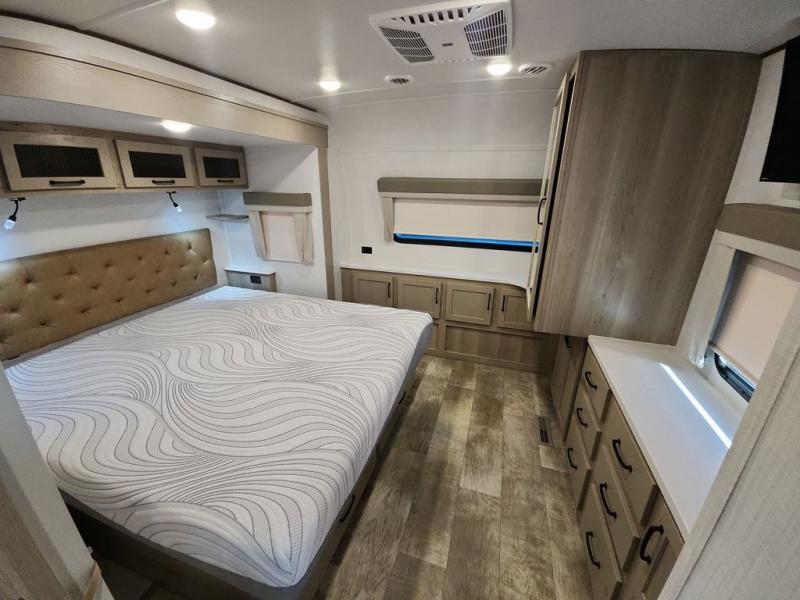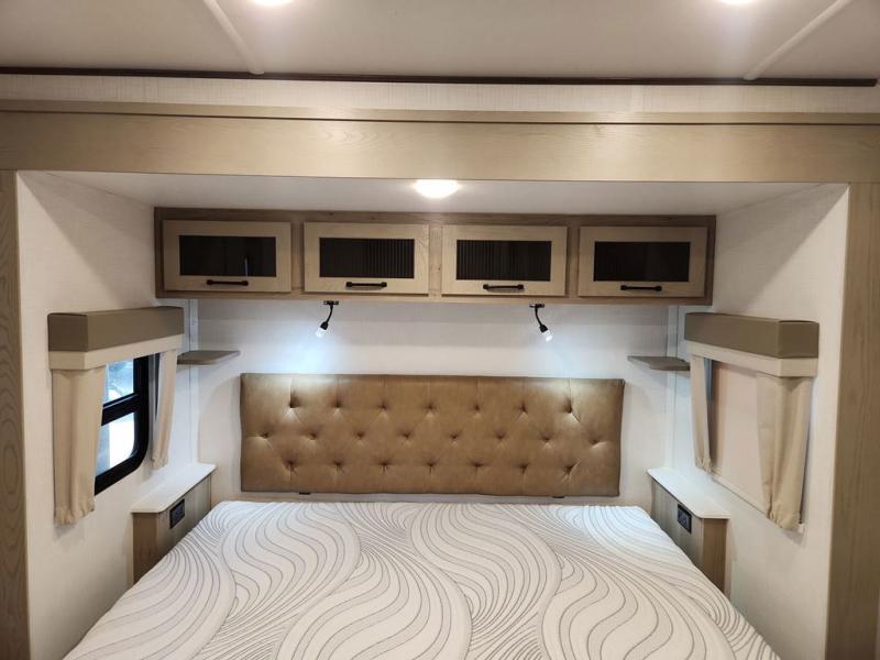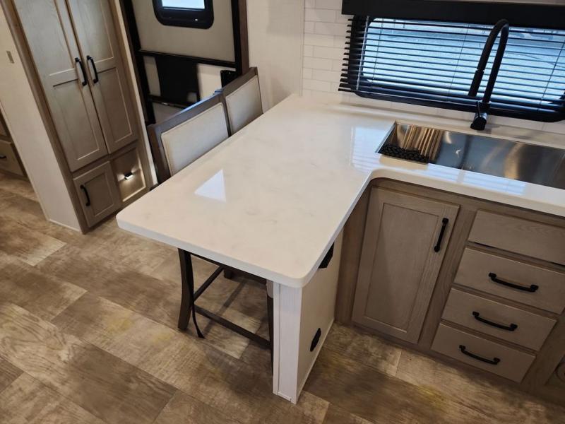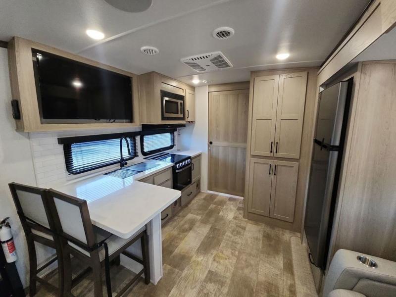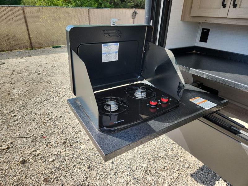 A perfect couples coach to get away featuring dual slides for added interior space. The main entry leads into a combined kitchen and living room providing an L-shaped counter with two-person bar top seating! This is a great place to enjoy your meals and morning coffee inside. Your nights will be spent in true relaxation with the 67" theater seating to watch TV, and a king bed slide in the front bedroom for a great night's rest. The full rear bathroom features a shower with a seat plus overhead skylight, and linen storage. You can also choose to cook outdoors when you have an outside kitchen and griddle, plus a 22' awning. This creates a nice outdoor living area that is perfect both day and night!