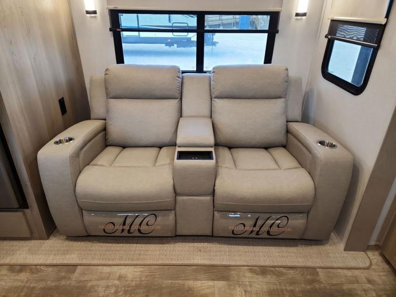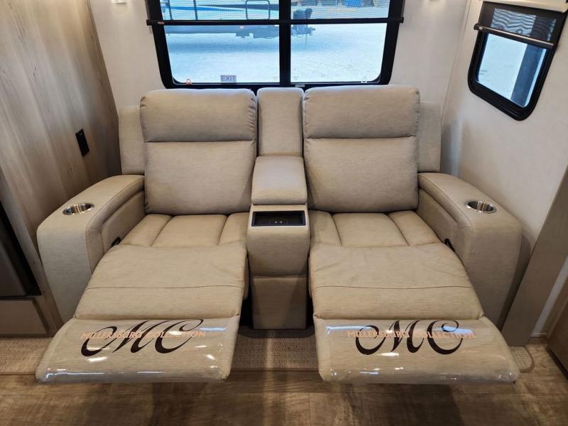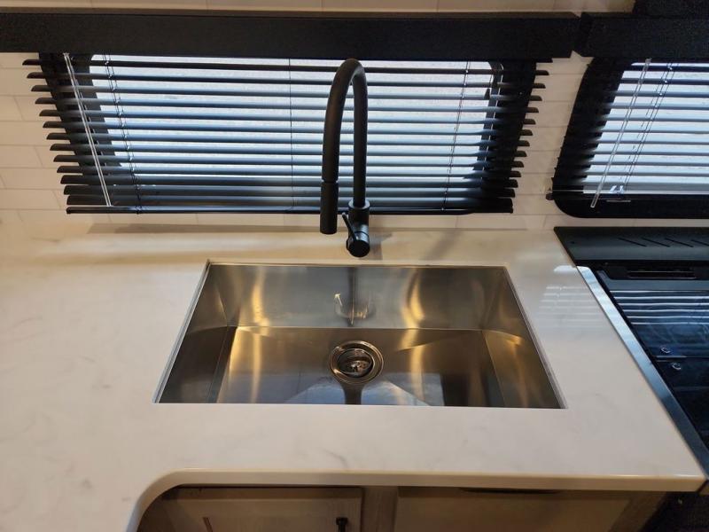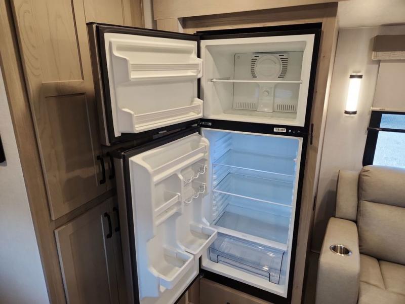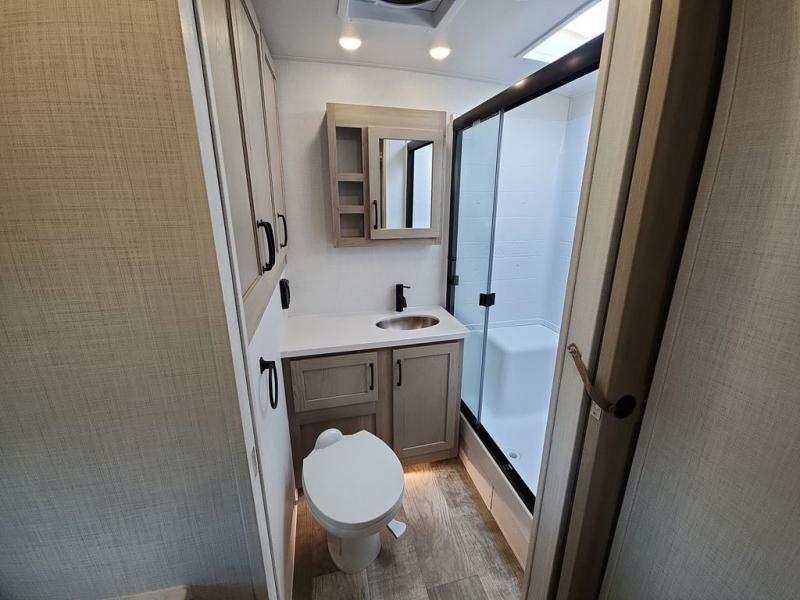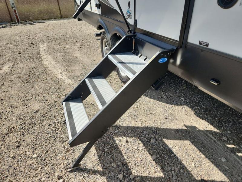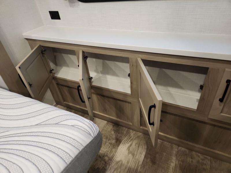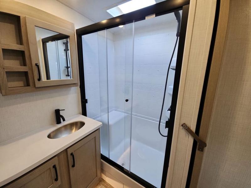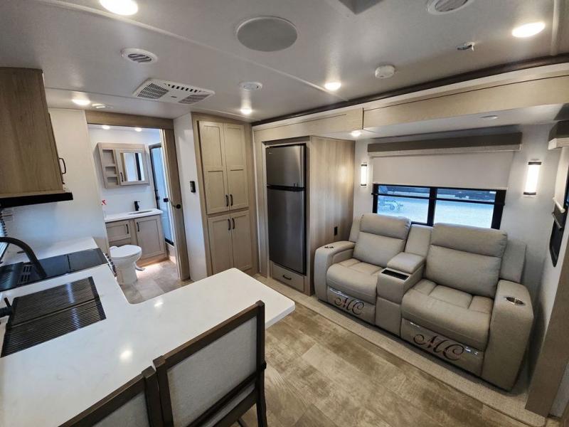 A perfect couples coach to get away featuring dual slides for added interior space. The main entry leads into a combined kitchen and living room providing an L-shaped counter with two-person bar top seating! This is a great place to enjoy your meals and morning coffee inside. Your nights will be spent in true relaxation with the 67" theater seating to watch TV, and a king bed slide in the front bedroom for a great night's rest. The full rear bathroom features a shower with a seat plus overhead skylight, and linen storage. You can also choose to cook outdoors when you have an outside kitchen and griddle, plus a 22' awning. This creates a nice outdoor living area that is perfect both day and night!