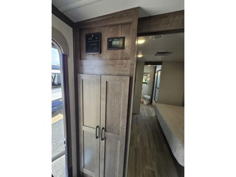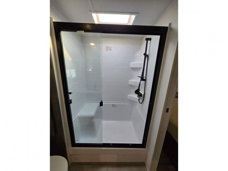 You will love how open this travel trailer will feel with the large front window that you can look out from the two-person bar top seating! The front kitchen has plenty of countertop space for you to prepare your best meals. Your nights will be spent in true relaxation with a 67" theater seating and king bed slide in the bedroom for a great night's rest. The full rear bathroom has a shower with a seat to take a nice, hot shower before bed, and a dual-sink vanity for two to get ready at once in the mornings!