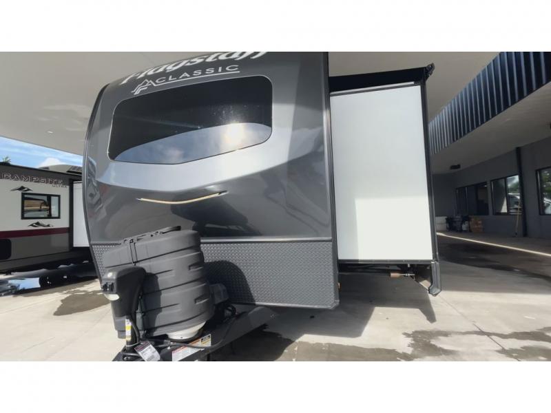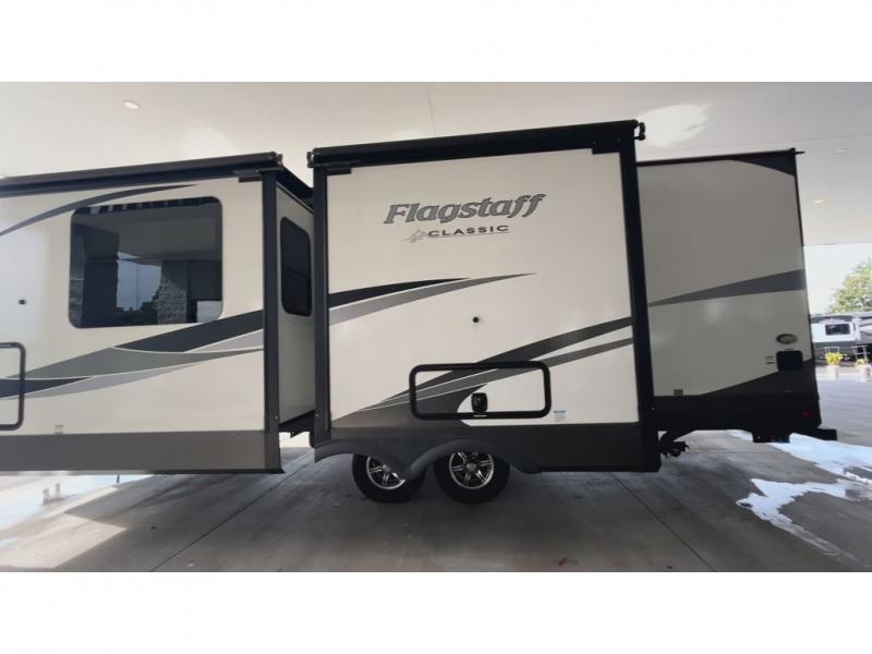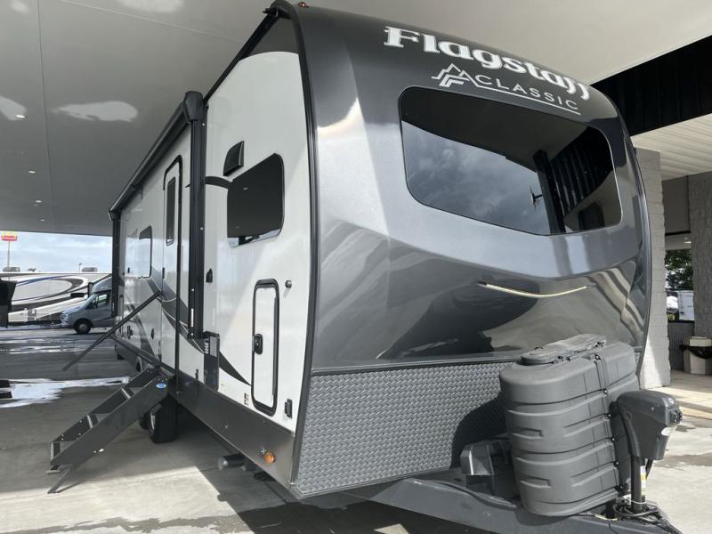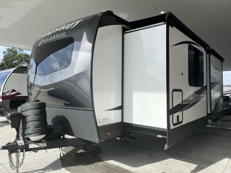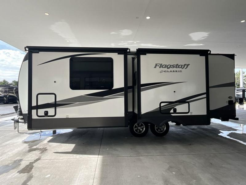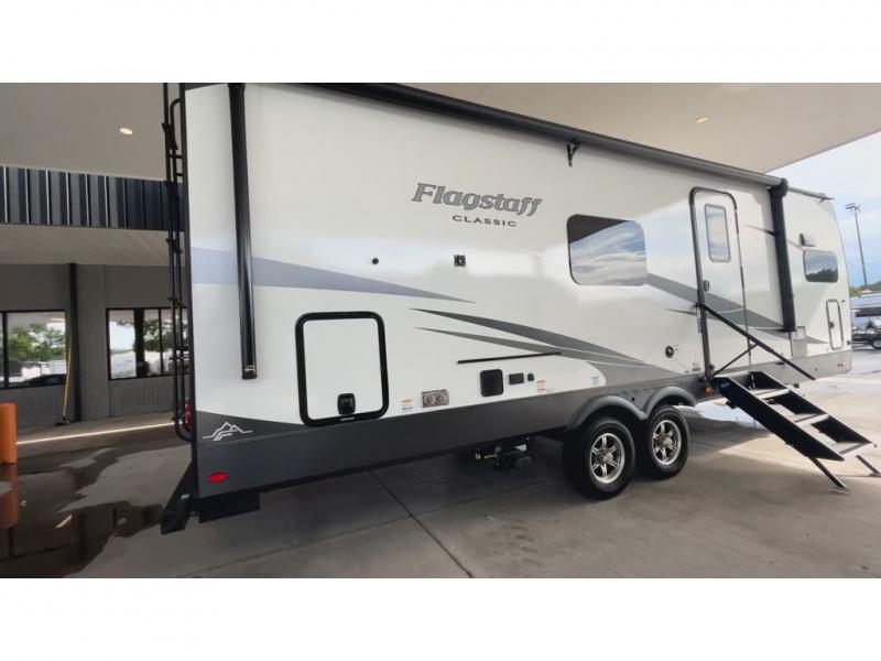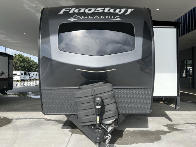 Each one of these Forest River Flagstaff Classic fifth wheels or travel trailers will be your home on wheels! Their quality craftsmanship and attention to detail shines through the surface-coated steel I-beam frame on fifth wheels, the enclosed underbelly, the radius roof with vaulted interior ceilings, and six-sided fully aluminum-framed floor, walls, and roof. Towing your unit will be easy with the torsion axle, Rubber-Ryde suspension, and nitrogen-filled Goodyear Endurance tires. You will even reduce your use of water with the Showermiser water saving system in the bathroom. A few other convenient features you will enjoy include a control panel with WeRV app control, a designer headboard and bedding, and an outside shower with hot and cold water. Come choose your favorite one today!