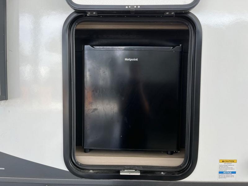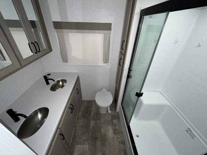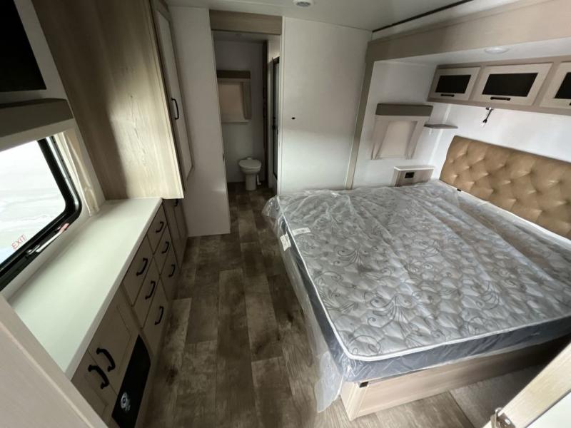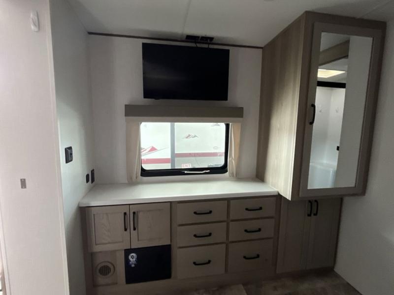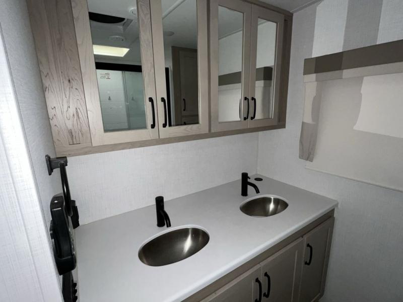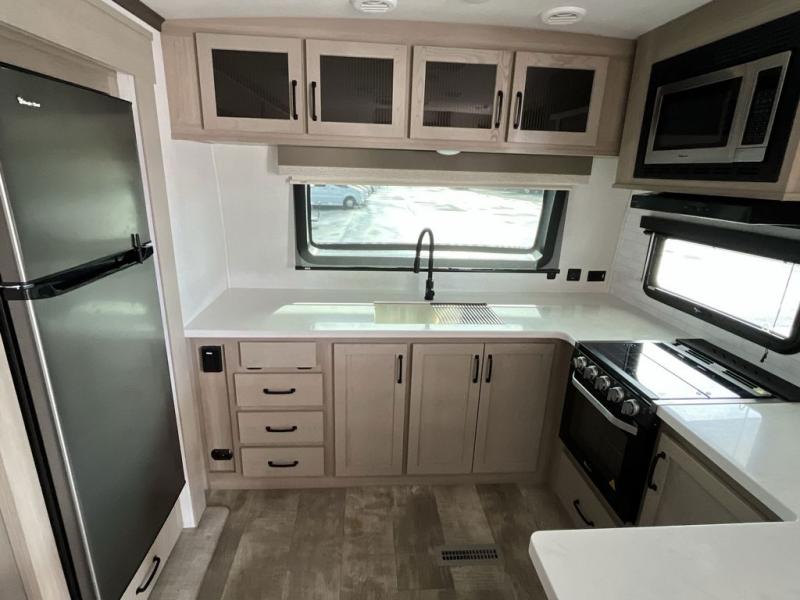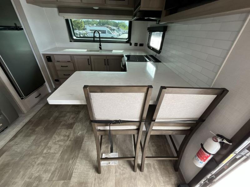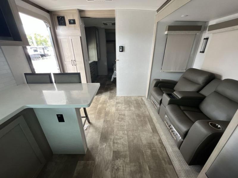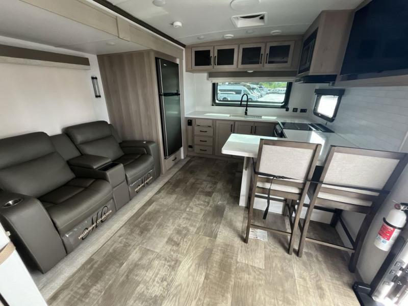 You will love how open this travel trailer will feel with the large front window that you can look out from the two-person bar top seating! The front kitchen has plenty of countertop space for you to prepare your best meals. Your nights will be spent in true relaxation with a 67" theater seating and king bed slide in the bedroom for a great night's rest. The full rear bathroom has a shower with a seat to take a nice, hot shower before bed, and a dual-sink vanity for two to get ready at once in the mornings!
