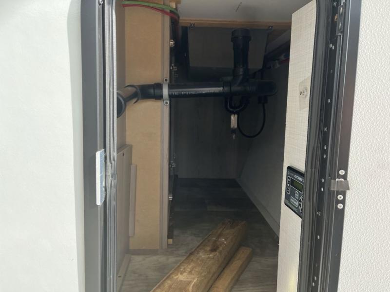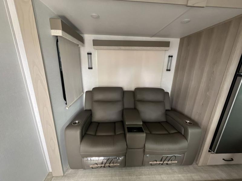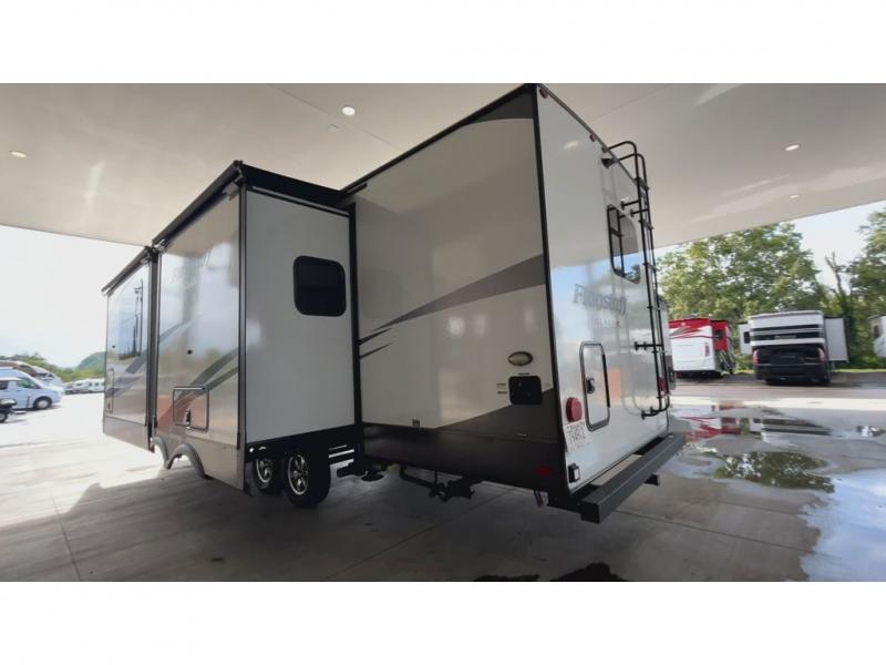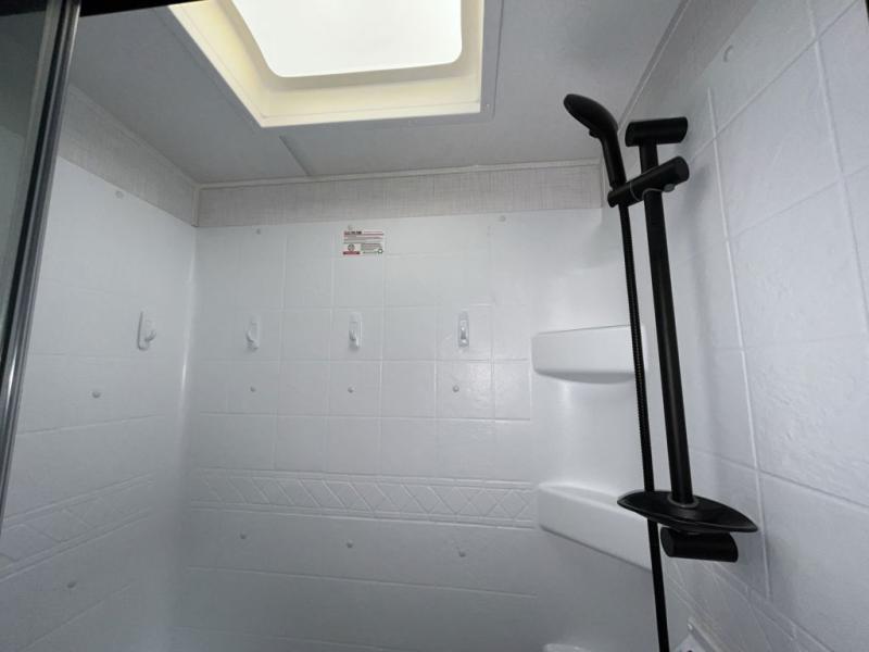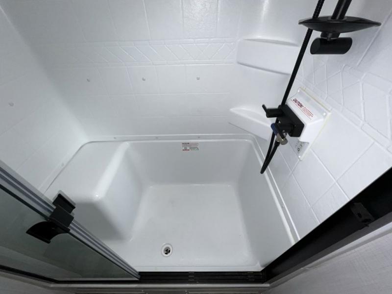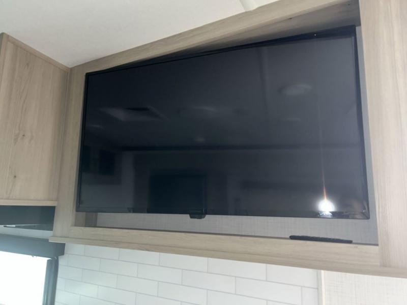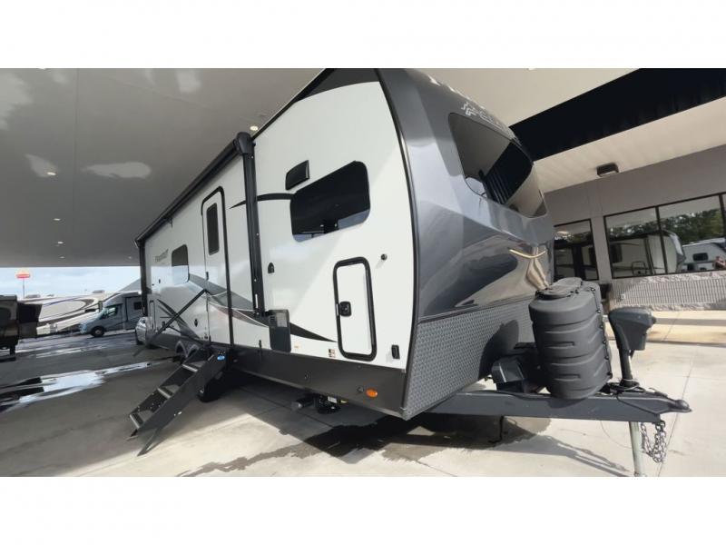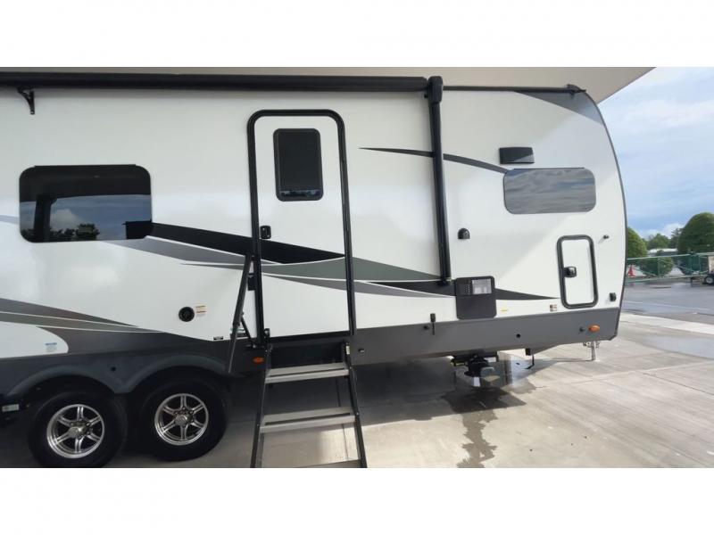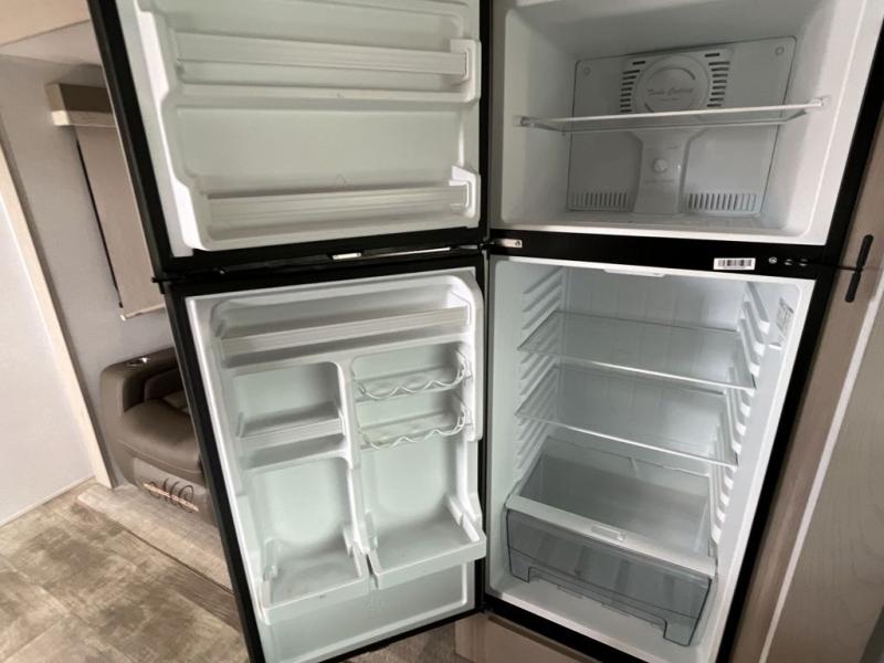 You will love how open this travel trailer will feel with the large front window that you can look out from the two-person bar top seating! The front kitchen has plenty of countertop space for you to prepare your best meals. Your nights will be spent in true relaxation with a 67" theater seating and king bed slide in the bedroom for a great night's rest. The full rear bathroom has a shower with a seat to take a nice, hot shower before bed, and a dual-sink vanity for two to get ready at once in the mornings!