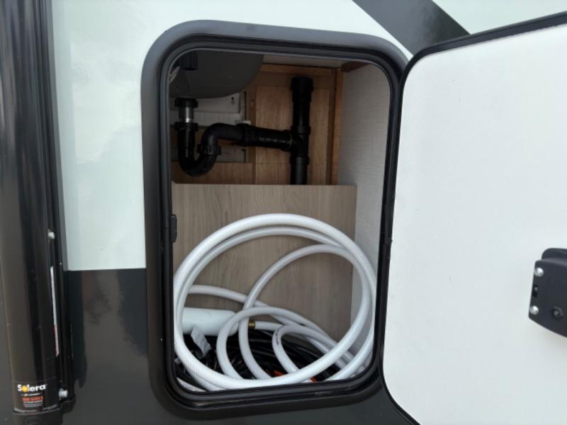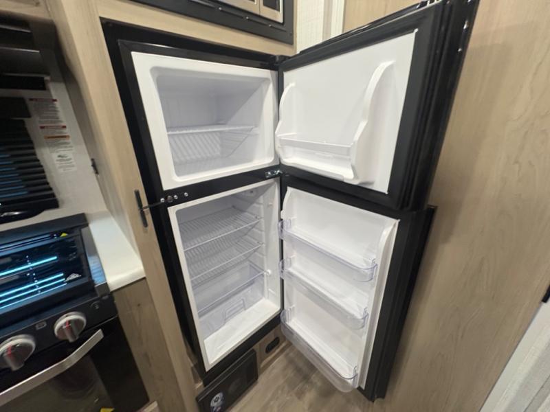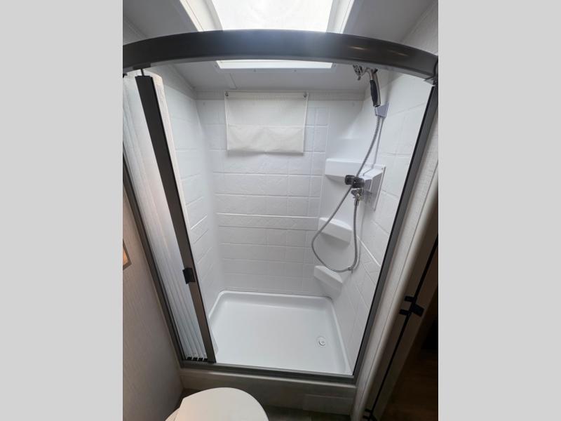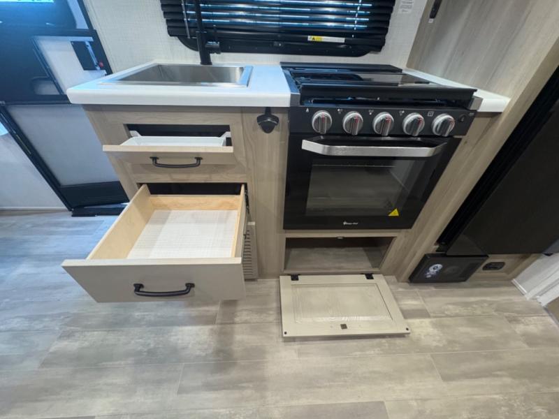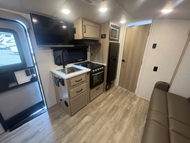 At just over 21 feet long and under 4,000 pounds (dry weight), this travel trailer is towable by many SUVs and smaller trucks, making it accessible for more travelers. The spacious rear bathroom offers a residential-style shower, vanity, and extra storage—perfect for keeping things organized on the road. The slide-out adds valuable living space, featuring a sofa with a table across from the entertainment center, creating a comfortable spot to dine, relax, or work remotely.