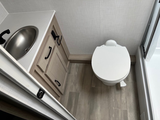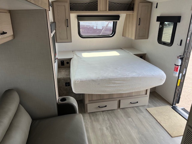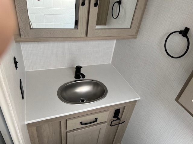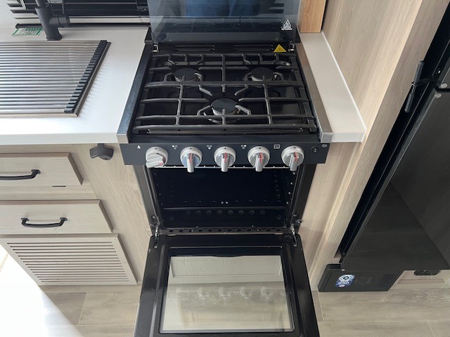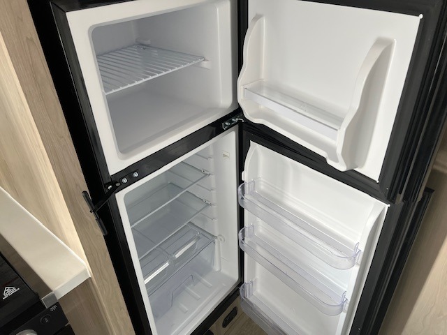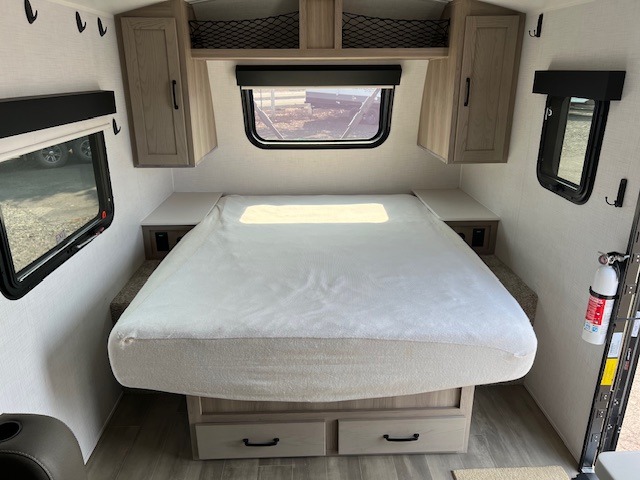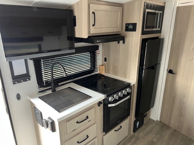Get ready for a spacious and comfortable trip in this trailer, plus you will have a convenient rear full bathroom with an oversized shower and linen storage to utilize instead of using the campground's facilities. The walk-around full bed gives you two sides with wardrobes to claim as your own. And the kitchen offers full amenities to make meals, and the outside griddle gives you even more choices when cooking. You can relax, dine, or even work from the slide out sofa with a 30" x 15" table and watch the 32" TV. You will find storage along the exterior for your outdoor gear, plus a 14' power awning.