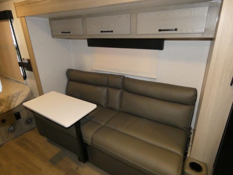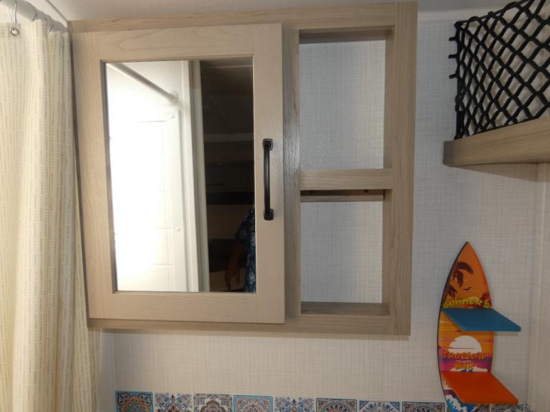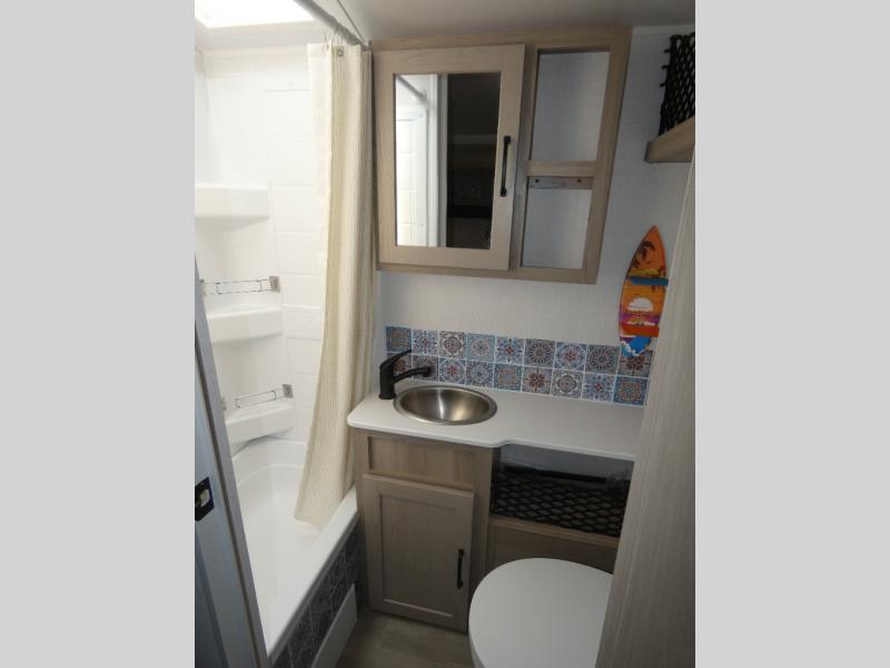 The chef will love cooking in the front kitchen of this travel trailer! It offers plenty of countertop space to meal prep and all of the essentials to cook delicious meals, plus there is even an outside kitchen with a refrigerator, a pull-out stove, and a griddle to fry what you caught that day. Enjoy all of your meals at the 72" sofa slide with a table or pull up a table and chairs under the 15' power awning. The queen bed offers a comfortable place for you to rest up each night and it even has a 26" x 80" flip-up bunk above it for a guest or two to tag along. Store all of your camping essentials in the exterior storage and rinse your feet off with the outside spray port after a fun day at the beach!