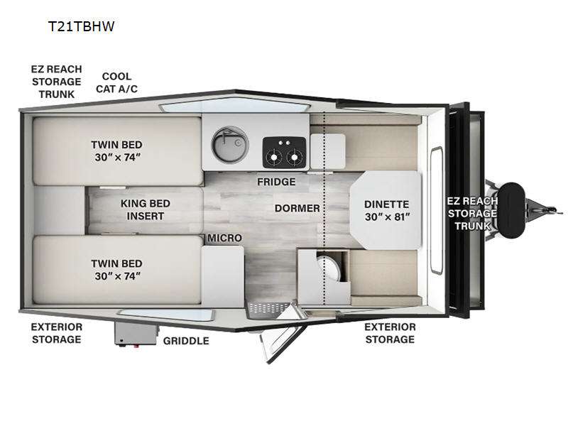 Camping is made easy for you and two others with this Flagstaff Hard Side High Wall camper. There is an abundance of storage with two EZ Reach storage trunks, one in front and one in back, plus additional exterior storage along the curbside in both the front and back as well. An outside griddle is handy for cooking out in the fresh air, and there is even a spray port for rinsing off feet, your furry friends, or muddy hiking boots if needed. On the inside, a set of 30" x 74" twin beds that can be made into a king bed with an insert. There is also a 30" x 81" dinette for enjoying your meals at, and this can be easily made into a bed for one or two more depending on size. With the dormer that pops up you will have plenty of head room in front. You can also cook inside with a two burner cooktop, round sink and microwave oven, and keep perishables fresh in the 1.7 cu. ft. refrigerator under the counter.