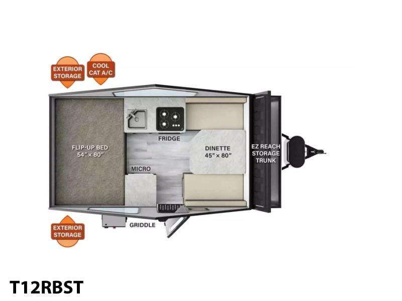 The 2024 Flagstaff T12RBST is a lightweight, hard-sided A-frame camper that combines the convenience of a pop-up with the durability of a travel trailer. It features a flip-up full-size bed, a booth dinette that converts for additional sleeping space, and a front EZ-Reach storage trunk. The interior includes a 3-burner cooktop, microwave, 12V refrigerator, and a hot water package with an outside spray port. Comfort is ensured with an 11,000 BTU A/C and a furnace. Additional amenities include an outdoor griddle, solar prep, LED lighting, and a Create-A-Breeze roof vent fan. With its quick setup and compact design, it's perfect for easy towing and comfortable camping.