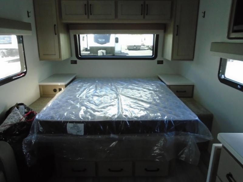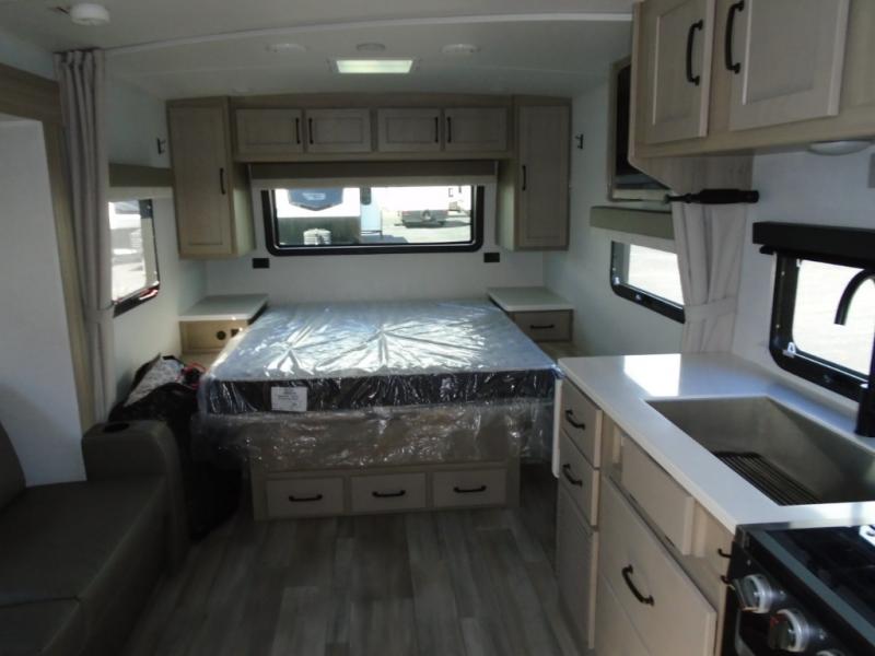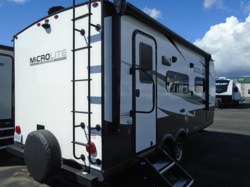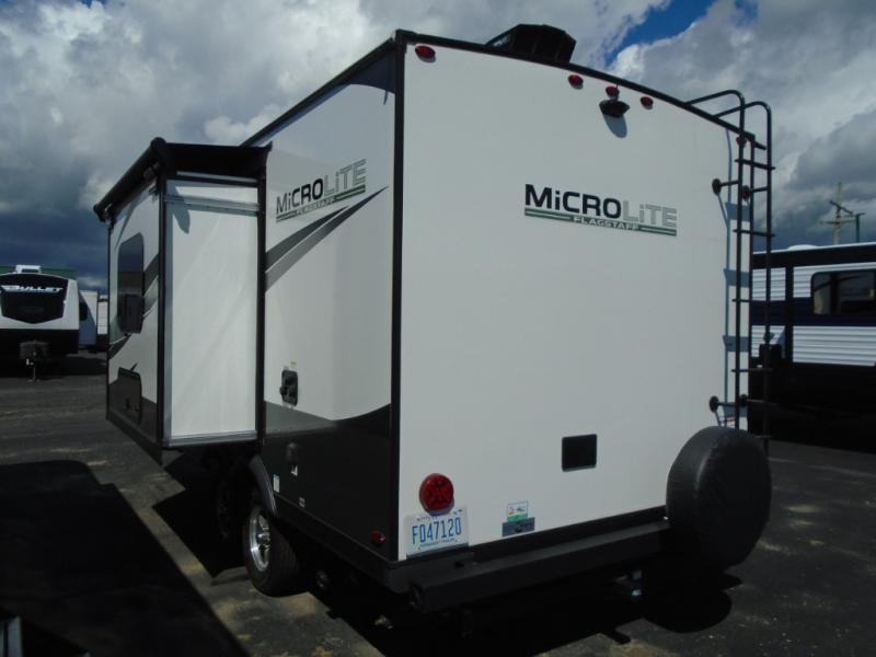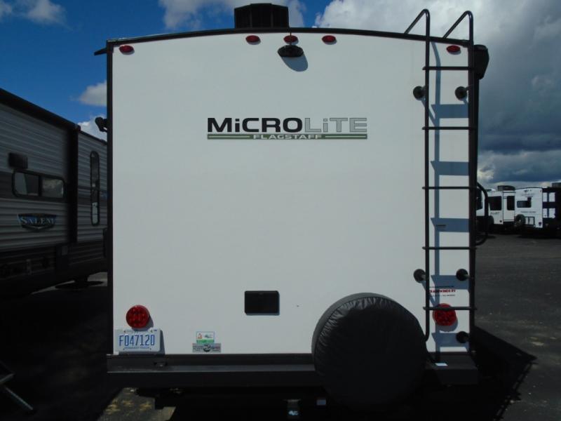 With any Flagstaff Micro Lite travel trailer by Forest River you will enjoy lightweight towing, durable construction, and added interior comforts to make each trip memorable! Each model features a torsion axle, Rubber-Ryde suspension, nitrogen filled, Goodyear Endurance tires, and easy lube axles with Nev-R-Adjust brakes for smooth towing from home to campground. The 6-sided aluminum framed construction provides a strong foundation so you can enjoy your RV for years to come, plus electronically controlled heated holding tanks and an enclosed underbelly will let you camp all year long. Head inside to find hybrid woven flooring in the slide outs, Sedona wood cabinetry, solid surface kitchen countertops, and many more amenities. These travel trailers also include exterior conveniences for hassle-free camping, like the power tongue jack, magnetic compartment door catches, Keyed Alike locks, and rear ladder to name a few!