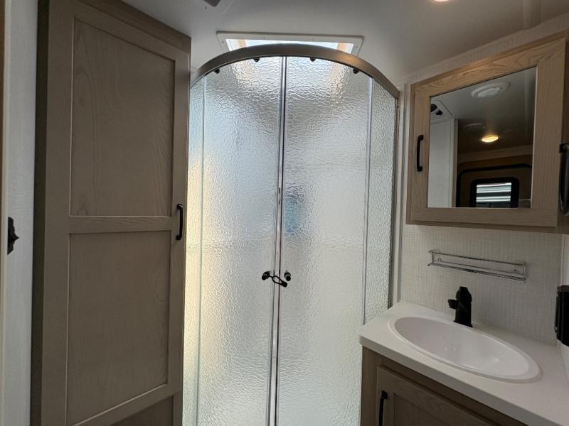 Enjoy home-style cooking with a three-burner range, gas oven, and 12V refrigerator, and unwind in front of the electric fireplace after a day of exploring. The full bathroom features a radius shower, linen closet, and skylight, offering comfort and privacy wherever you roam.