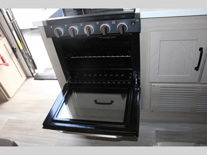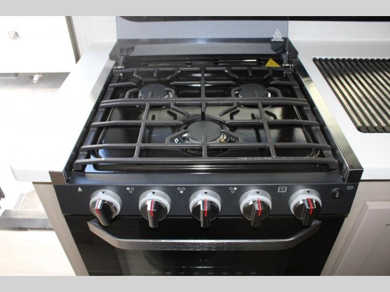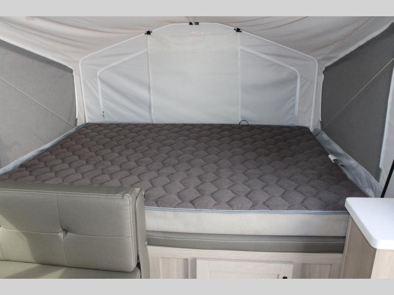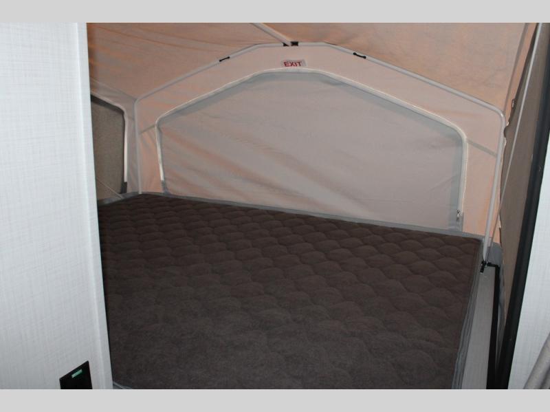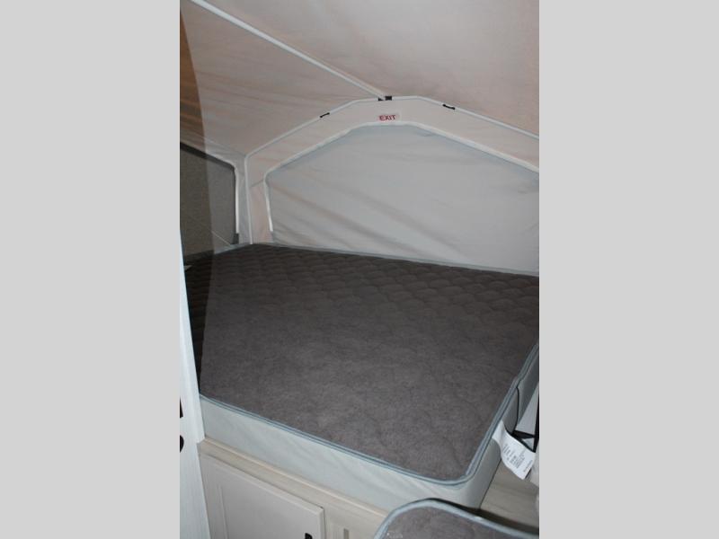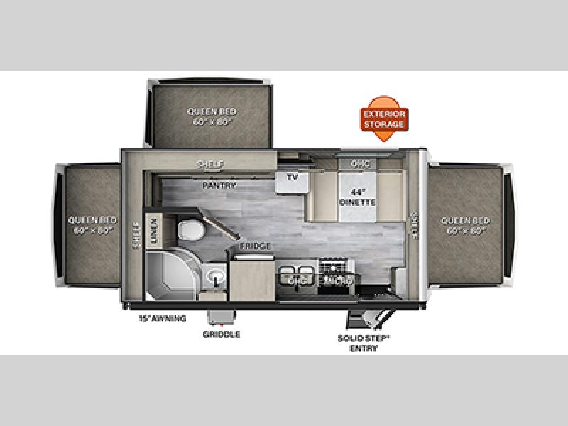 You'll love camping in this convenient trailer with sleeping space for seven thanks to the three queen-size tent end beds and the booth dinette. The full bath is complete with a shower skylight, a Maxxair vent fan and cover, plus a Showermiser water saving system. This model includes tons of storage space, including a pantry and a shelf, overhead cabinets, plus exterior storage for hiking or fishing gear. Since there is a three burner cooktop, a 21" gas oven, and a 12V refrigerator, you will have everything you need to prepare at-home meals each day, plus there is an outside griddle with LP hookup for breakfast outdoors!