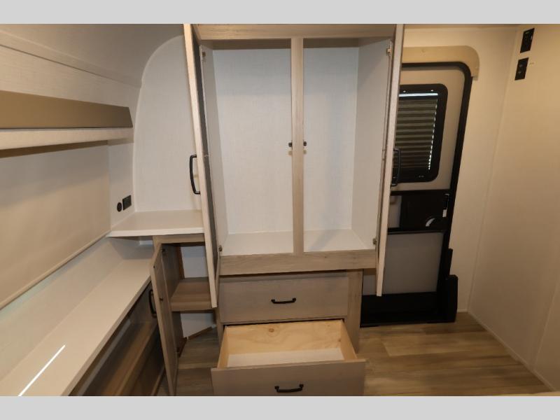 Whether you camp at state parks, national forests or on your friend's land, this trailer offers you plenty of floor space thanks to the two slide outs! As you enter the main entrance near the rear kitchen you can grab a drink from the 12V refrigerator or a snack from the pantry and relax on the 60" theater seating or sit at the booth dinette. The Smart TV offers entertainment while the fireplace will keep you cozy during the cooler months. Everyone will appreciate having a full bathroom to get cleaned up in, and the front bedroom gives you privacy and a queen bed slide, plus storage and the second exterior entry.