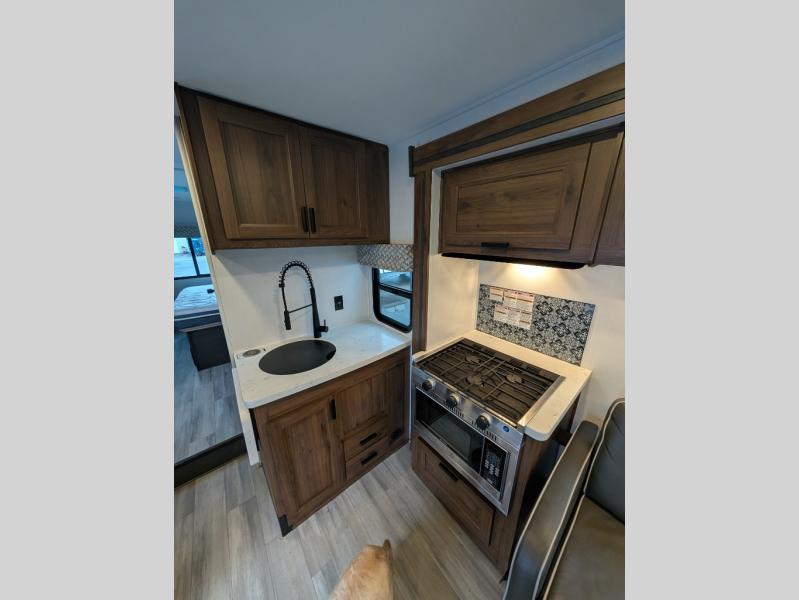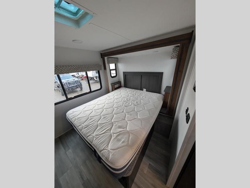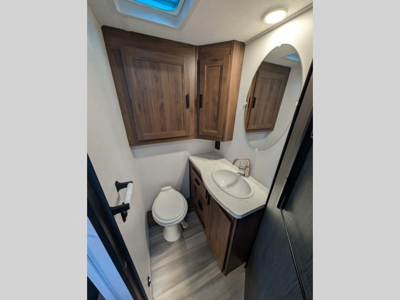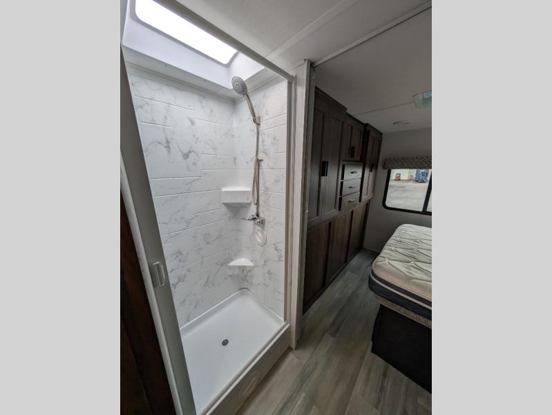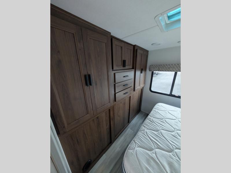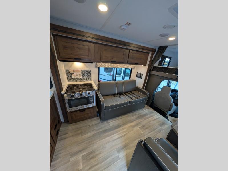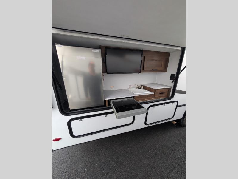 The chef will love cooking with this motorhome! They can choose to cook either indoors with the three burner cooktop and flip-up countertop or head to the outside kitchen to breathe in some fresh air while they grill up some juicy burgers on the cooktop. The separated bathroom makes it easy for one to freshen up in the 24" x 32" shower while another uses the private toilet and sink with medicine cabinet above it. The rear private bedroom has a 60" x 74" queen bed slide with nightstands to set your glass of water and wardrobes on either side of a linen closet with a 12V TV for your entertainment. The booth dinette and sofa also offer comfortable sleeping spaces once converted, as well as the 60" x 80" bunk over cab mat which can be switched out for an optional Trekker cap with a built-in entertainment center!