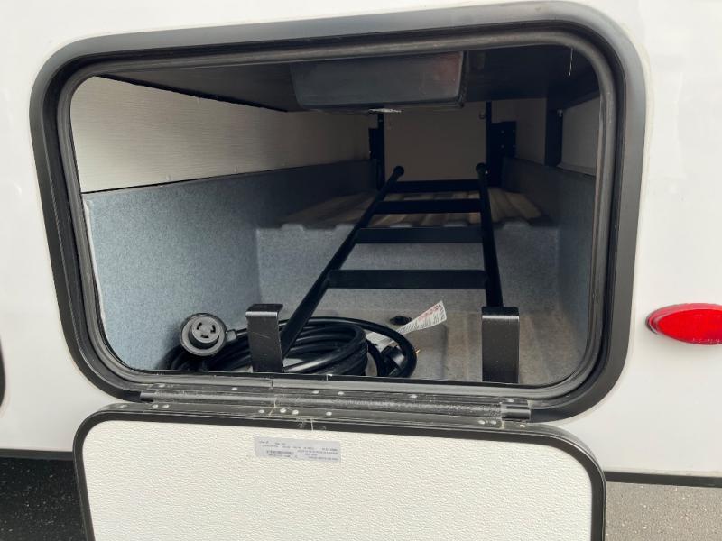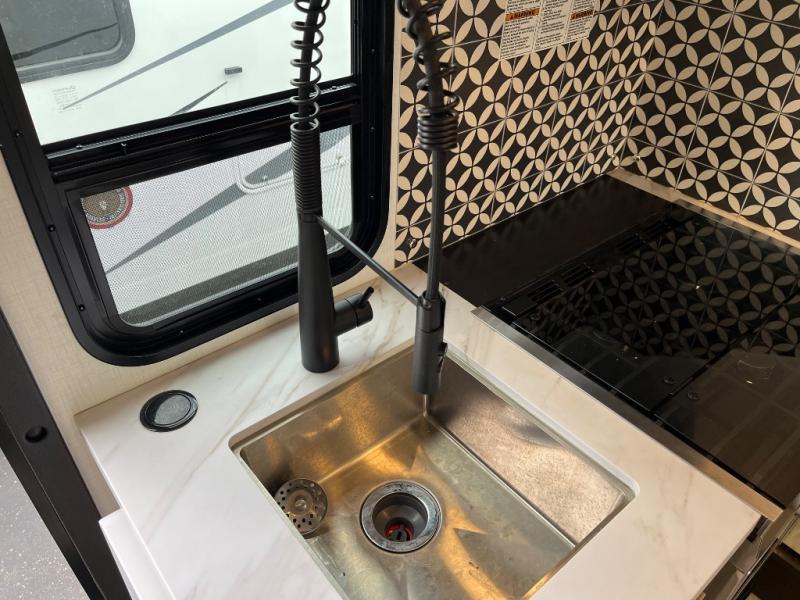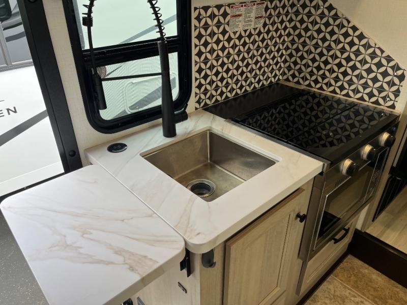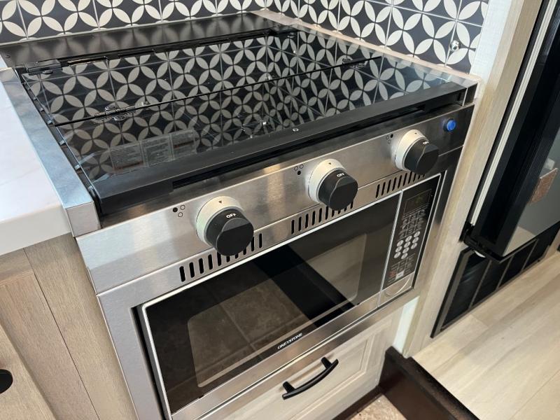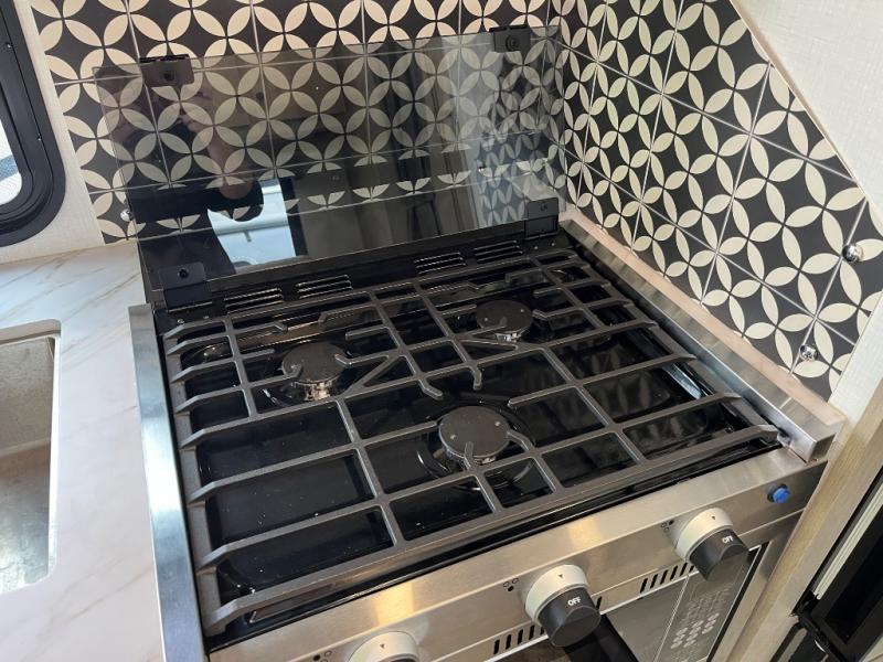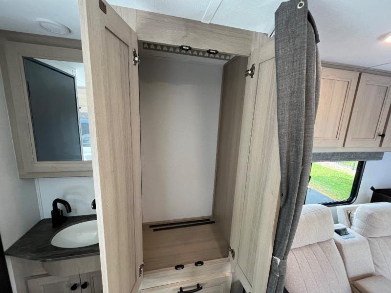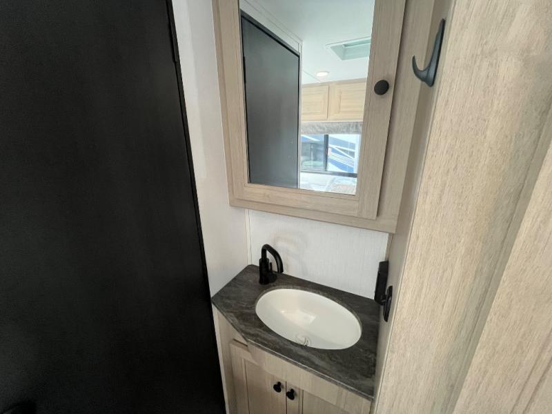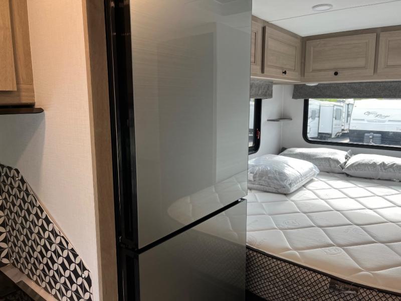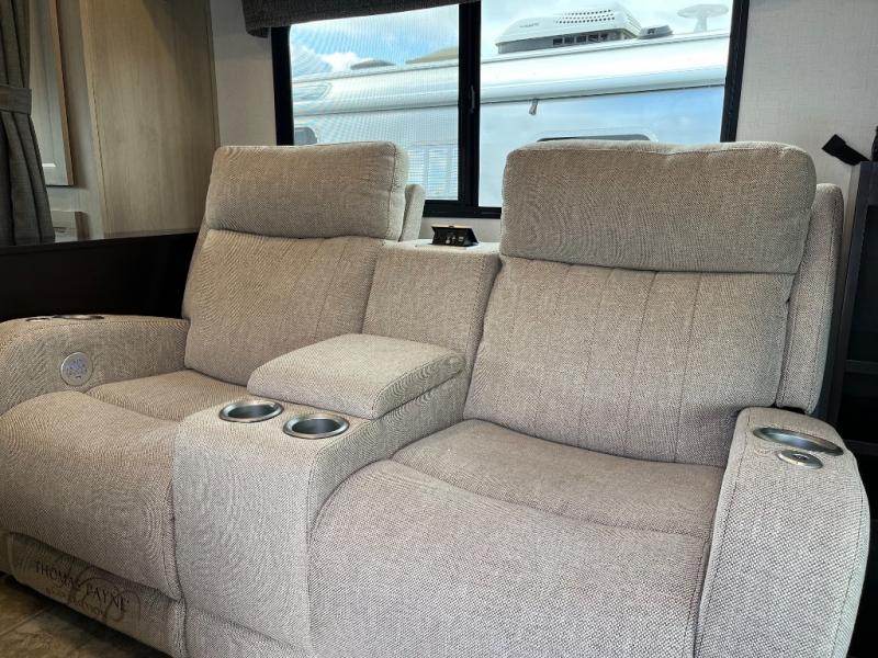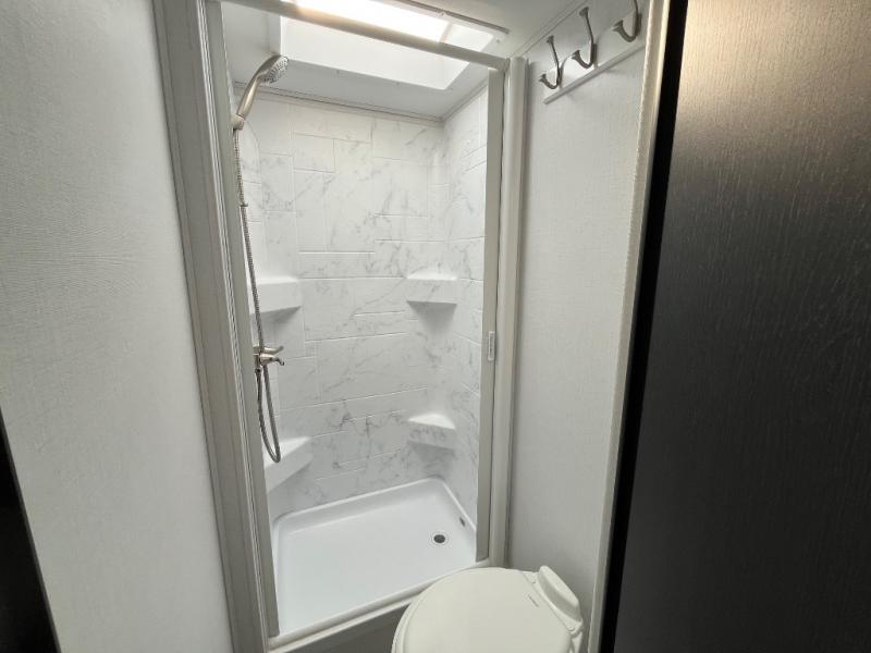 Travel in style with your own accommodations in this coach. You'll find a queen-size cab-over bunk that can be utilized as extra sleeping space or even storage, plus the rear corner offers a queen bed. And don't forget about the U-dinette as extra sleeping space after dining, playing games and relaxing. The kitchen offers a 10.7 cu. ft. 12V refrigerator, a convection microwave, a recessed three-burner range, soft touch self-closing drawer guides and a cordless 12V charging plate. The private toilet and shower room gives you a place to get cleaned up, and the bathroom sink is just outside the door allowing someone else the ability to get ready at the same time.