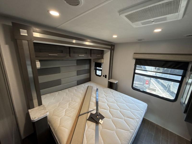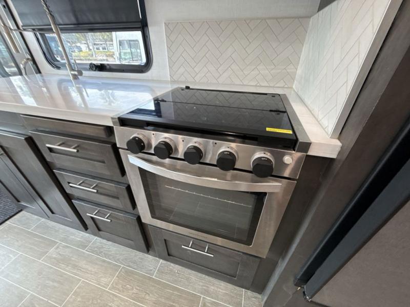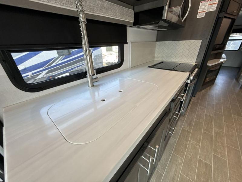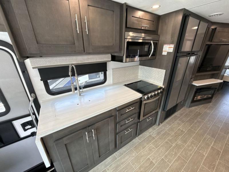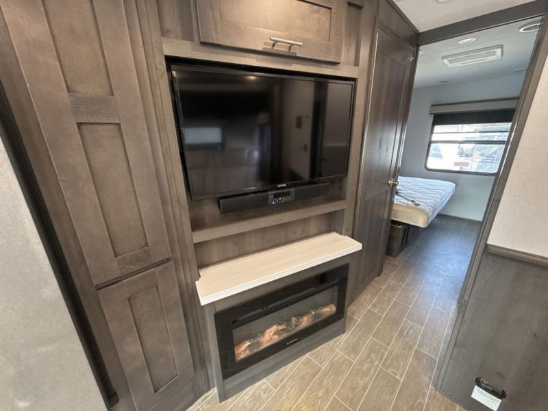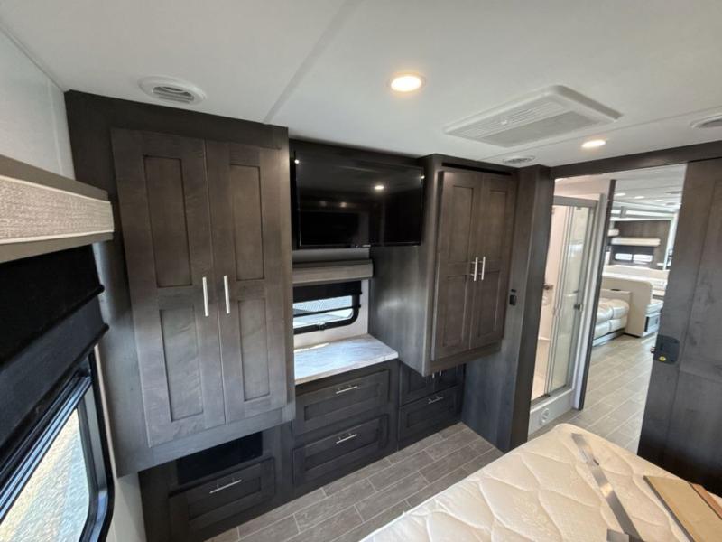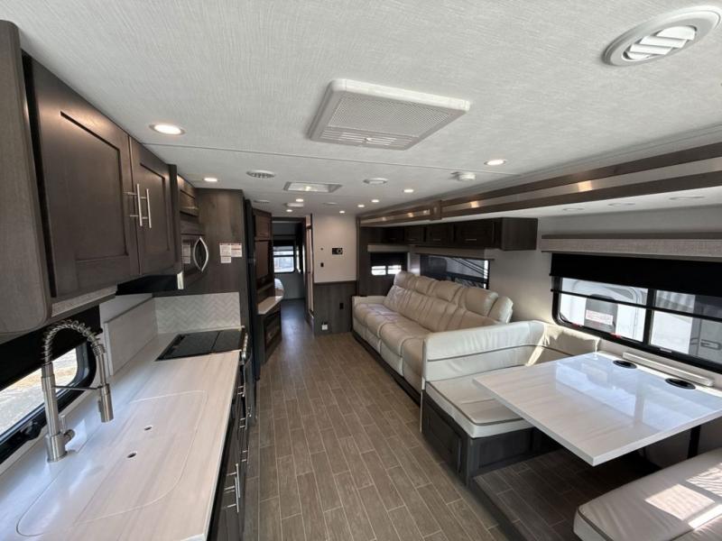 You will love the spacious living entertainment in this motorhome! There is a Thomas Payne 4-person theater seating that reclines with adjustable headrests, heat, massage and has pop-up 110V outlets. There is also a 5,000 BTU fireplace with a 40" LED TV to watch your favorite movies in true comfort. The kitchen has everything you need to prepare your best home cooked meals including a brush nickel designer faucet with a pull out spray wand for easy clean up, and you can enjoy all of your meals at the Dream Dinette. You will appreciate having your own private retreat with the rear bedroom which has a 72" x 80" king bed slide across from a dresser with a 32" LED TV, a wardrobe on one side, and another wardrobe on the other with an optional combo washer and dryer. There is also a power front overhead bunk for more sleeping space!