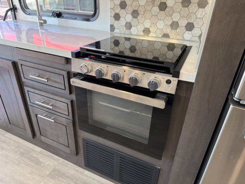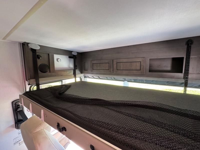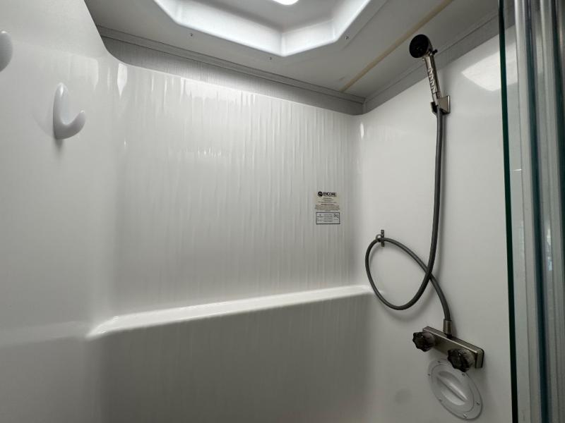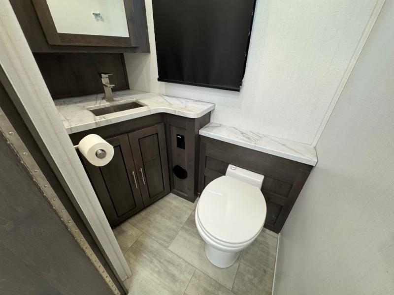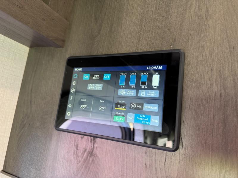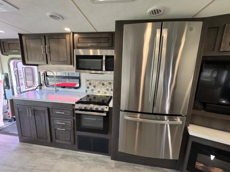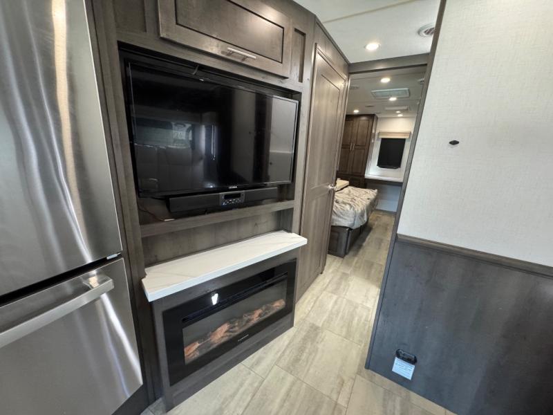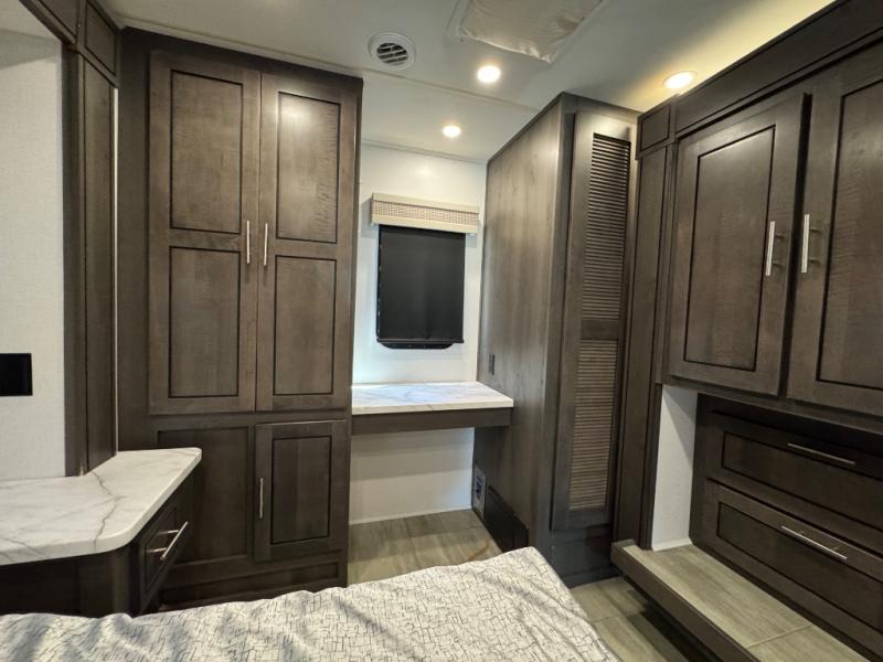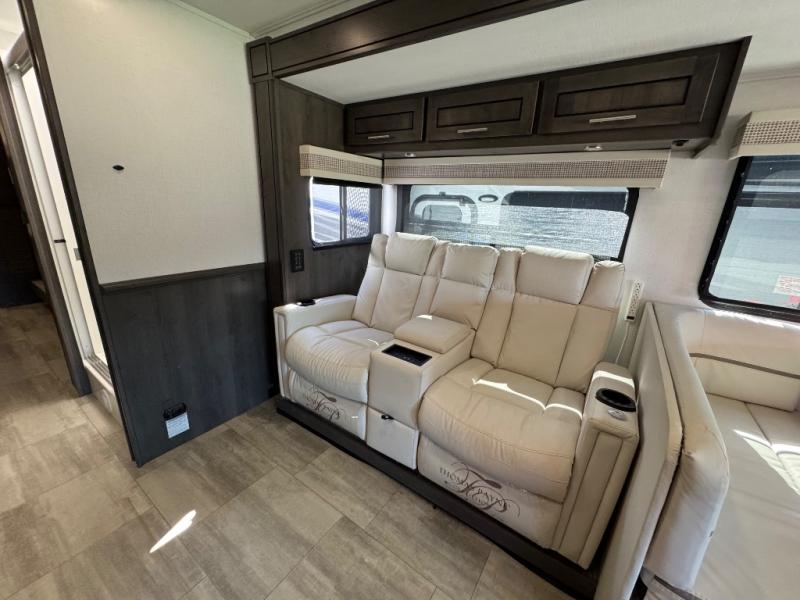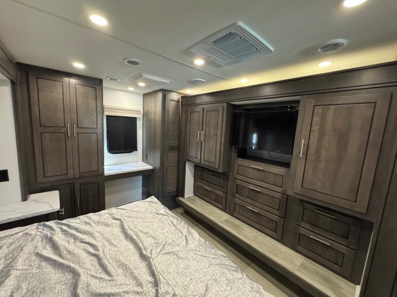 You won't believe all that the rear private bedroom has to offer in this motorhome! It features a 72" x 80" king bed slide with overhead cabinets, a dresser with a 32" TV and overhead cabinets, wardrobes on either side of the dresser, and a desk with wardrobes on either. And one of the wardrobes features an optional stacked washer and dryer for convenience! The split-style bathroom makes it easy for one person to freshen up in the shower with a seat while another uses the private toilet and sink. After a long day of traveling, you can relax on either the Thomas Payne theater seating with heat and massage across from the 5,000 BTU fireplace with a 40" LED TV above it or play a game and eat a meal at the Dream Dinette. There is also a power front overhead bunk for more sleeping space!