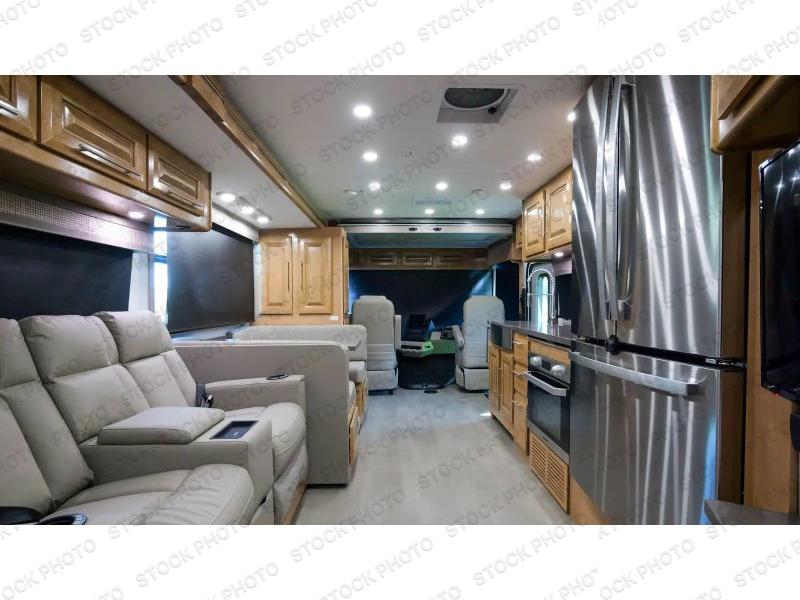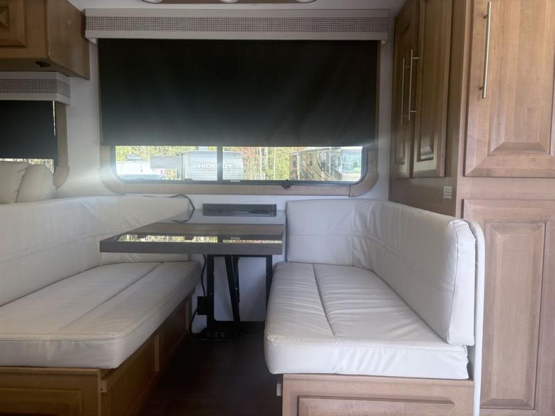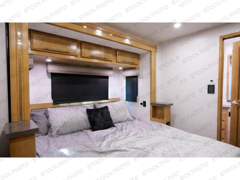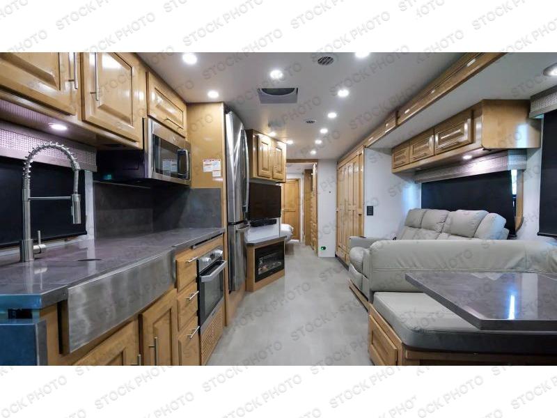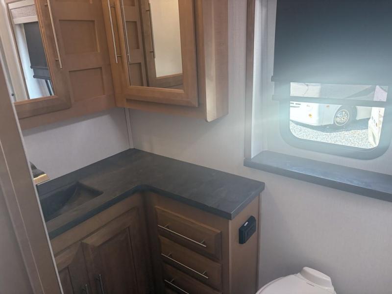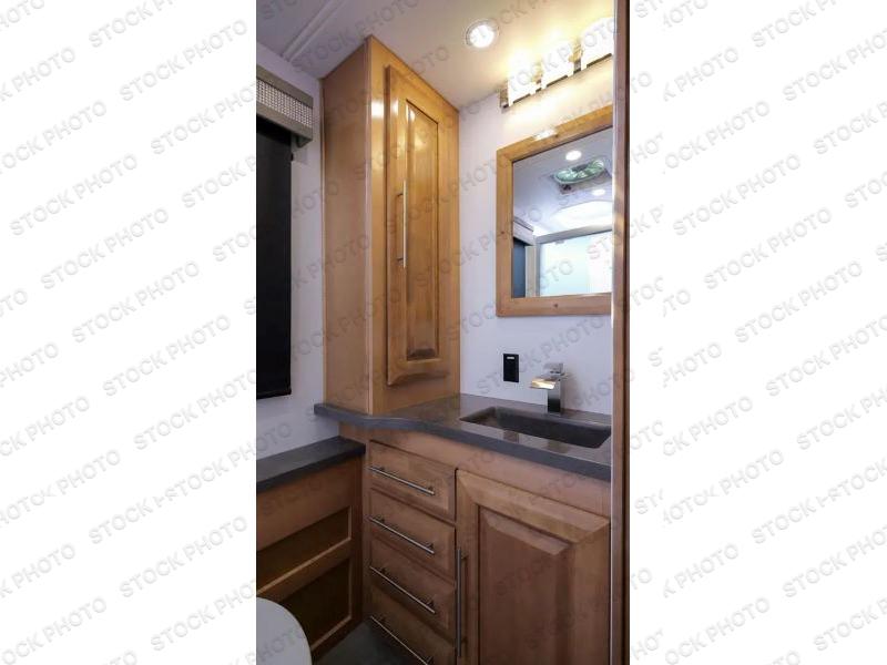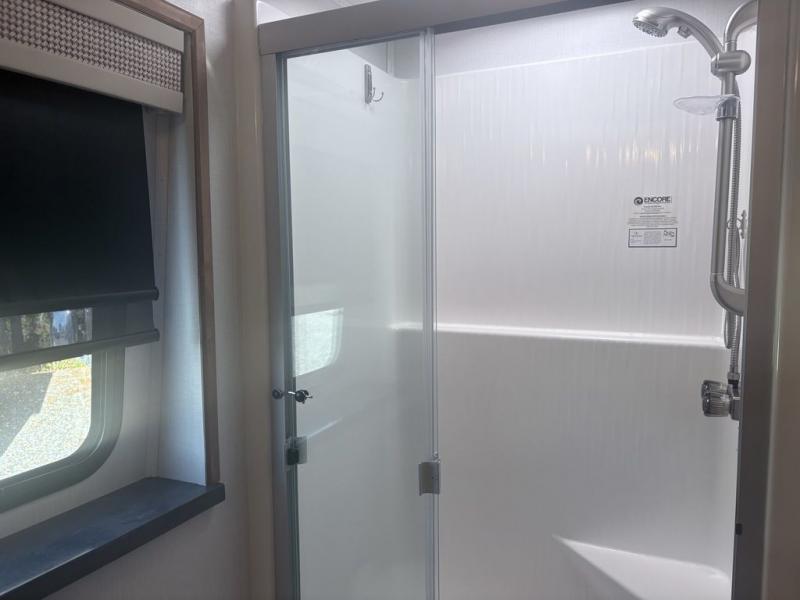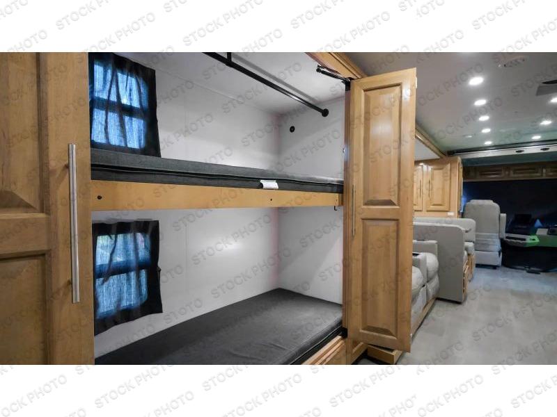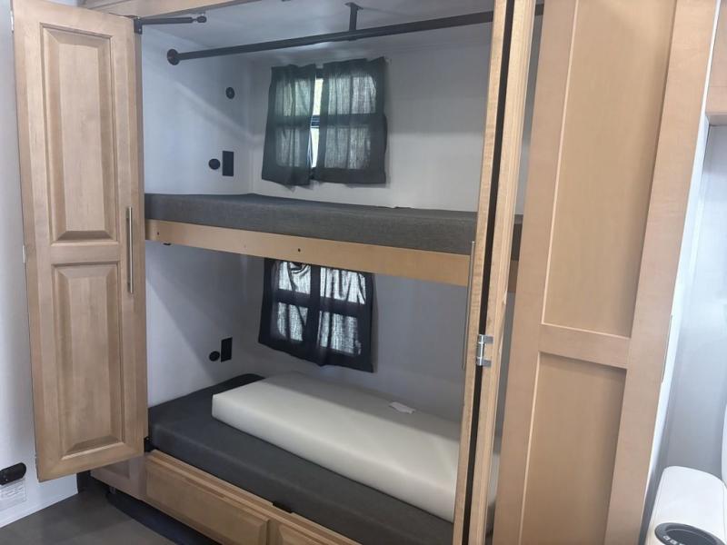 It's a clean decision to take this motorhome on all of your adventures with two full bathrooms! The full rear bathroom has a shower with a seat and creates a master suite with the bedroom which has a 72" x 80" Power Tilt king bed slide across from a dresser with a 32" LED TV and wardrobes on either side of it with one of them with washer and dryer prep. The set of bunk beds are conveniently across from the second full bathroom which will come in handy at night and keep things running smoothly in the mornings with a shower. Prepare your best home cooked meals with the three burner cooktop and enjoy them at the booth dinette then relax on the theater seating!