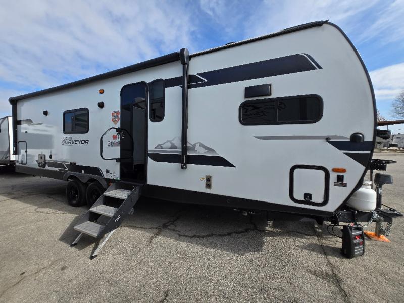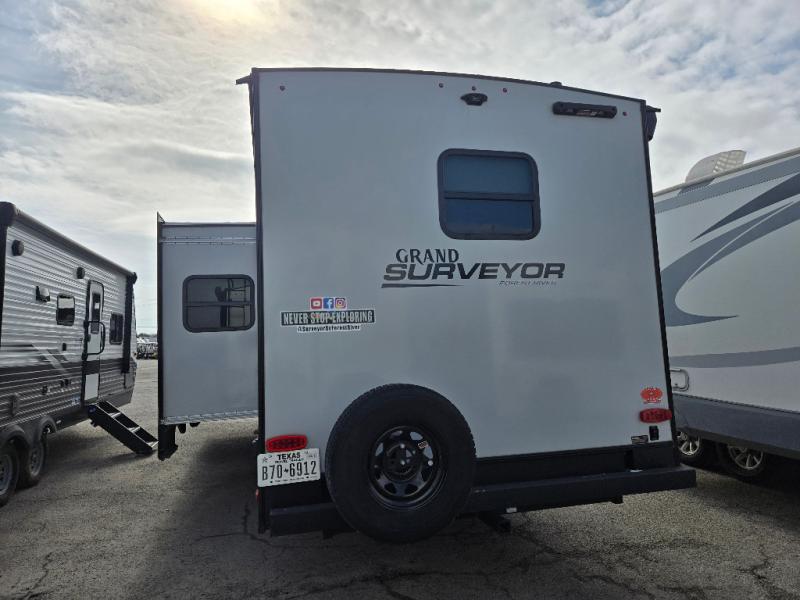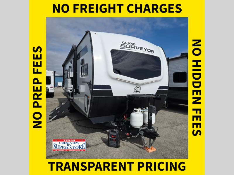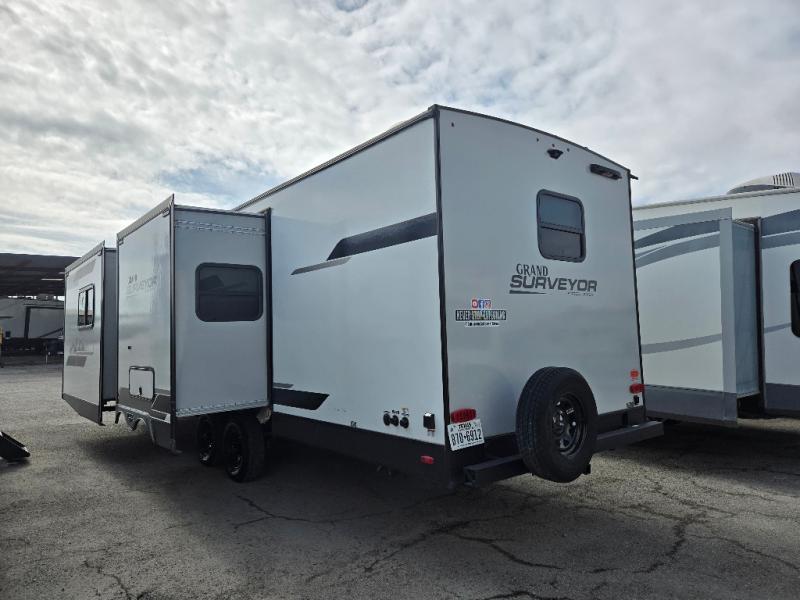 With any Grand Surveyor travel trailer by Forest River you will enjoy turn-key ready-to-go features and quality construction! Each model includes Azdel composite walls and a gel coated fiberglass front cap with an automotive style tinted windshield for a sleek look. There are friction hinge black glass entry door(s), an adjustable platform step with a night light, plus Goodyear tires and a power tongue jack for easy towing. The interior will have you feeling right at home with roller shades, residential faucets, sinks, and bathroom vanity, plus Surf(x) seamless countertops throughout. You can also plan for adventure with a 2" rear accessory and exterior spray port, and there are slam latch baggage doors throughout to keep all your gear secure. Other stand-out features include a central vacuum system, a 200 watt solar panel with a 30 amp controller, a tankless water heater, carpet-free interiors, and the list goes on!