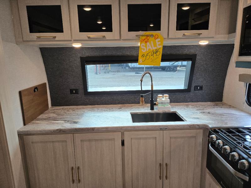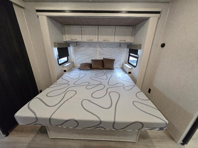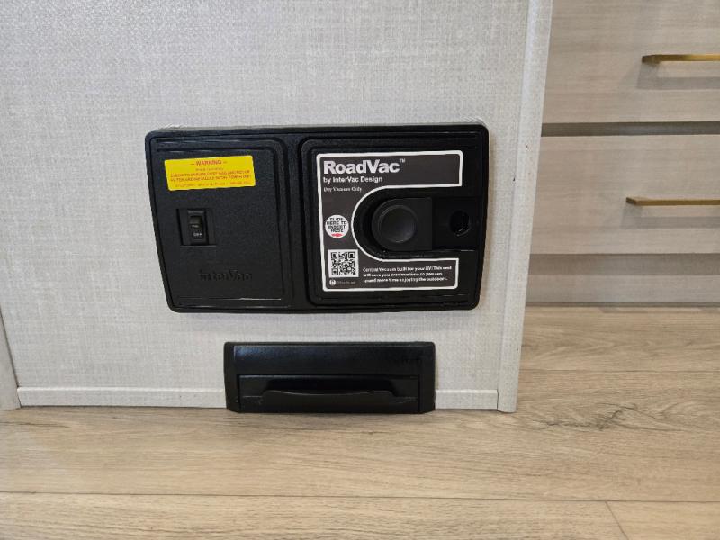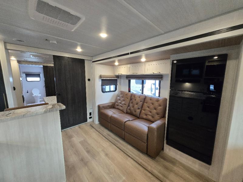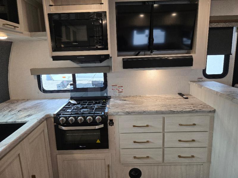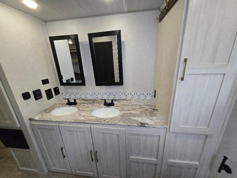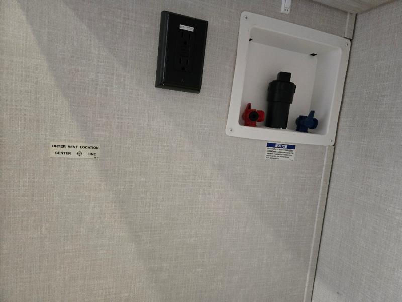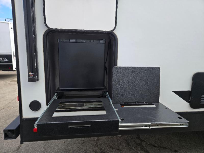 This couple's trailer will be giving you all the glamping vibes! There is a front kitchen with ample counter space, along with a counter with two bar stools, a central vacuum to easily clean up, and a slide out for more space! The second slide out is found in the middle master bedroom where you'll also enjoy a custom king bed across from a bedroom fireplace, a wardrobe, and a dresser with TV prep. Head towards the back and you'll be wowed by the full bath with dual bath sinks, an upgraded slow-close shower door, and a closet with washer and dryer prep. The exterior is just as impressive as the interior with its outside kitchen, 20' power awning with LED lights, pass-through storage, TV coax, and so much more!