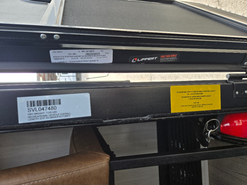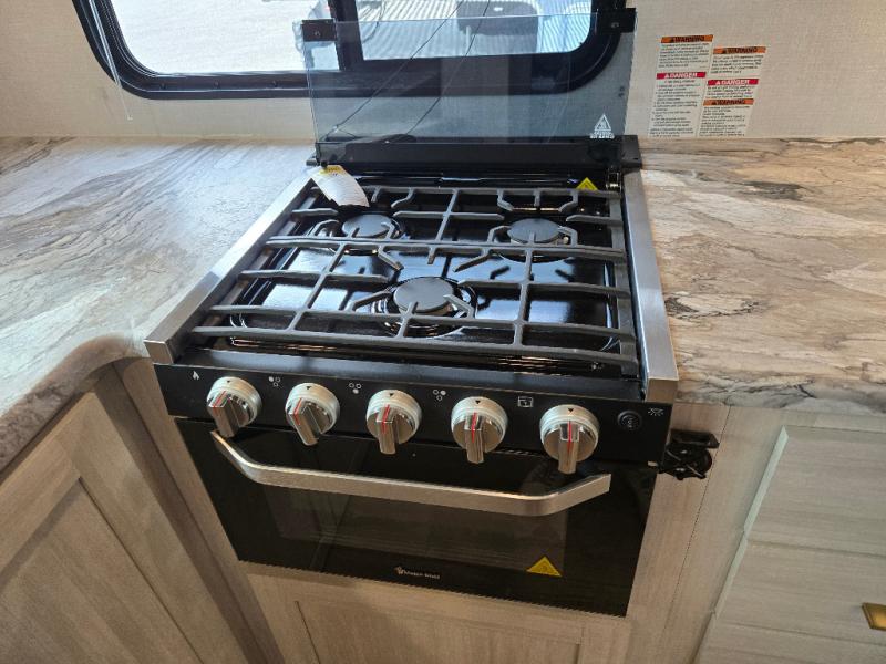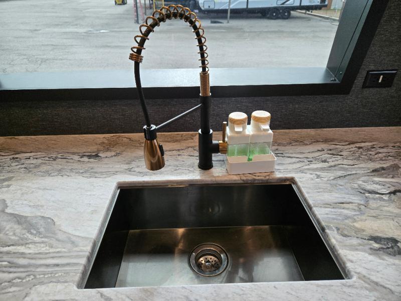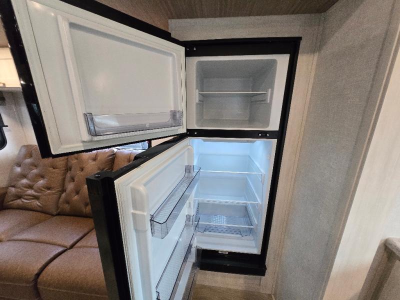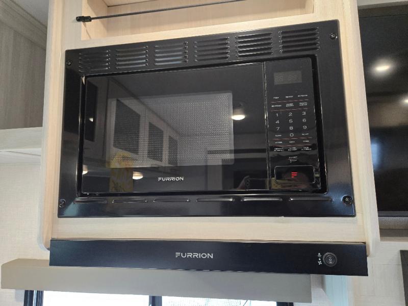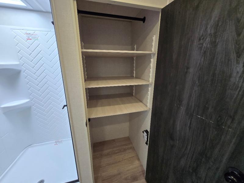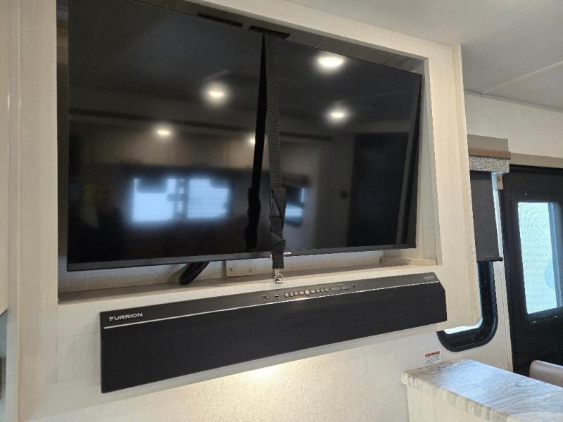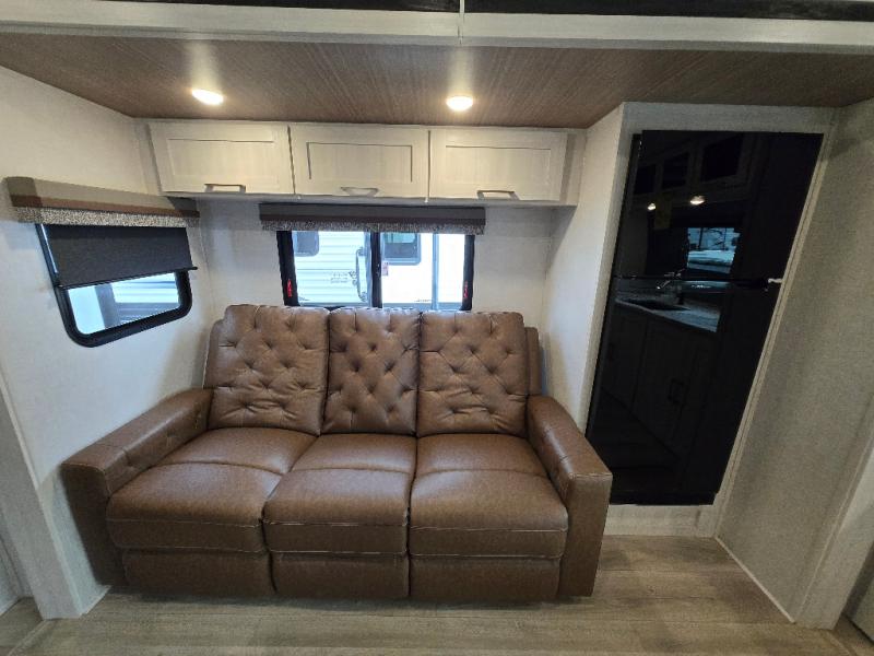 This couple's trailer will be giving you all the glamping vibes! There is a front kitchen with ample counter space, along with a counter with two bar stools, a central vacuum to easily clean up, and a slide out for more space! The second slide out is found in the middle master bedroom where you'll also enjoy a custom king bed across from a bedroom fireplace, a wardrobe, and a dresser with TV prep. Head towards the back and you'll be wowed by the full bath with dual bath sinks, an upgraded slow-close shower door, and a closet with washer and dryer prep. The exterior is just as impressive as the interior with its outside kitchen, 20' power awning with LED lights, pass-through storage, TV coax, and so much more!