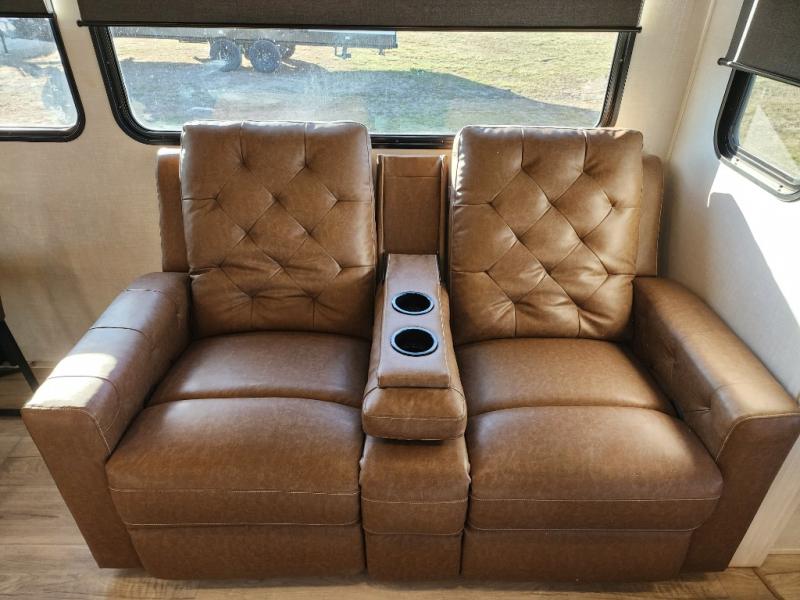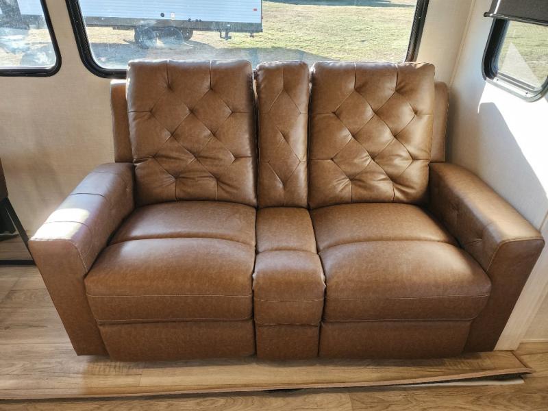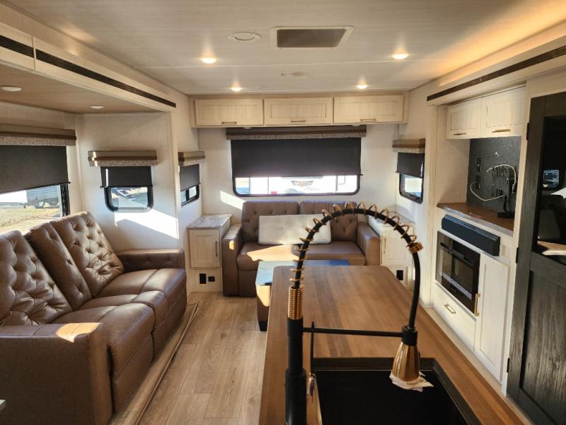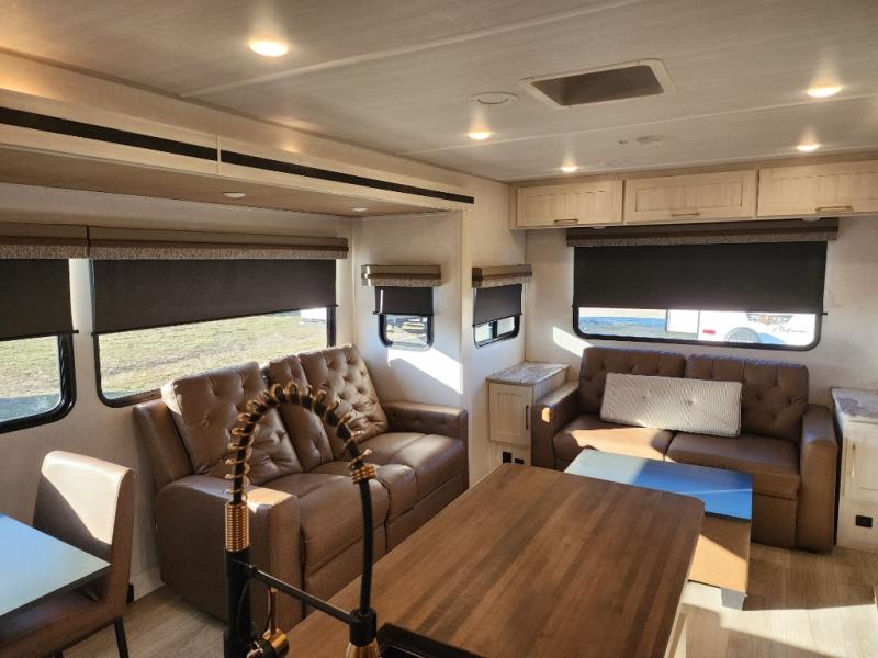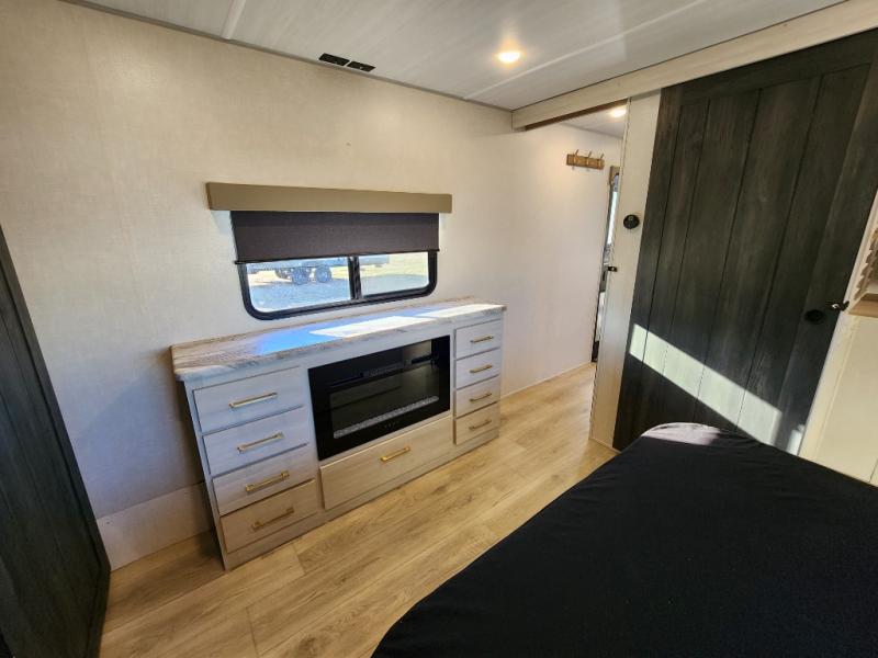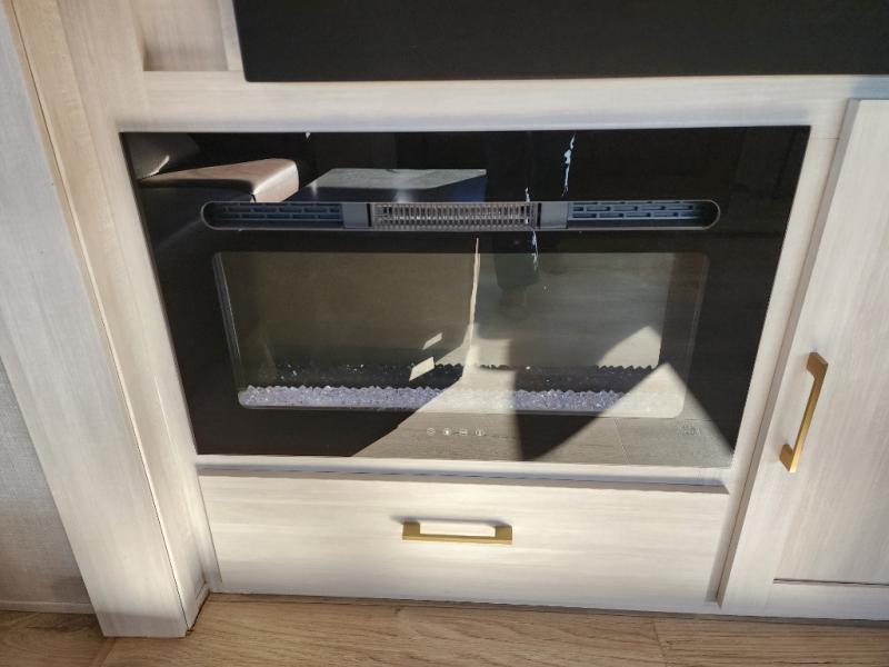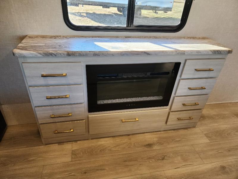 If luxury is what you're looking for, you won't have to search far with this travel trailer! There are triple slides, with dual opposing slides in the main living area for maximum space. The kitchen island gives a more residential feel to this space, plus there is a pantry, a hutch with shelves, a 10 cu. ft. 12V black glass refrigerator, and more kitchen features you are sure to love. The rear living area includes a tri-fold sofa to provide sleeping space for two overnight guests, and there is a theater seat across from the fireplace and HD TV. You'll also enjoy dining at the free-standing dinette with a multi-purpose ottoman! When it's time to call it a night, you can clean up in the spacious full bath, then head to the front master bedroom to retire. There is a custom king bed slide out here, along with a full-wall wardrobe in front, a dresser, a closet with washer and dryer prep, plus a bedroom fireplace!