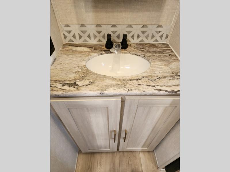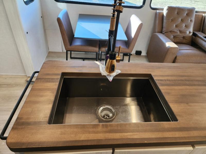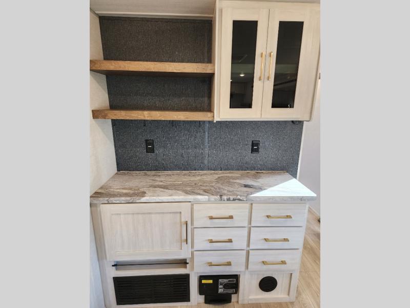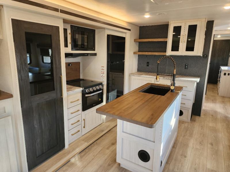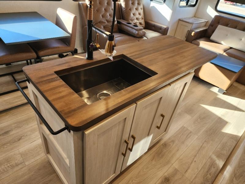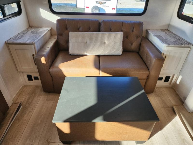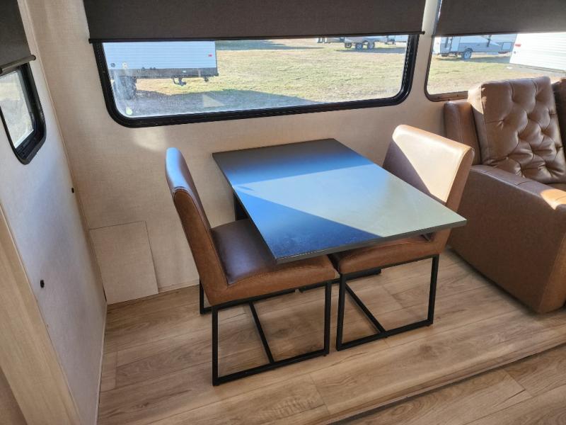 If luxury is what you're looking for, you won't have to search far with this travel trailer! There are triple slides, with dual opposing slides in the main living area for maximum space. The kitchen island gives a more residential feel to this space, plus there is a pantry, a hutch with shelves, a 10 cu. ft. 12V black glass refrigerator, and more kitchen features you are sure to love. The rear living area includes a tri-fold sofa to provide sleeping space for two overnight guests, and there is a theater seat across from the fireplace and HD TV. You'll also enjoy dining at the free-standing dinette with a multi-purpose ottoman! When it's time to call it a night, you can clean up in the spacious full bath, then head to the front master bedroom to retire. There is a custom king bed slide out here, along with a full-wall wardrobe in front, a dresser, a closet with washer and dryer prep, plus a bedroom fireplace!