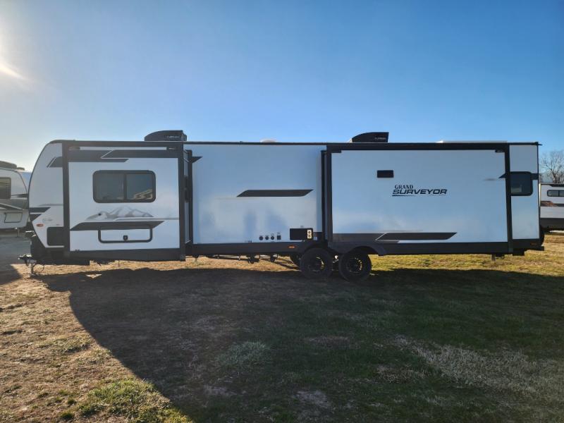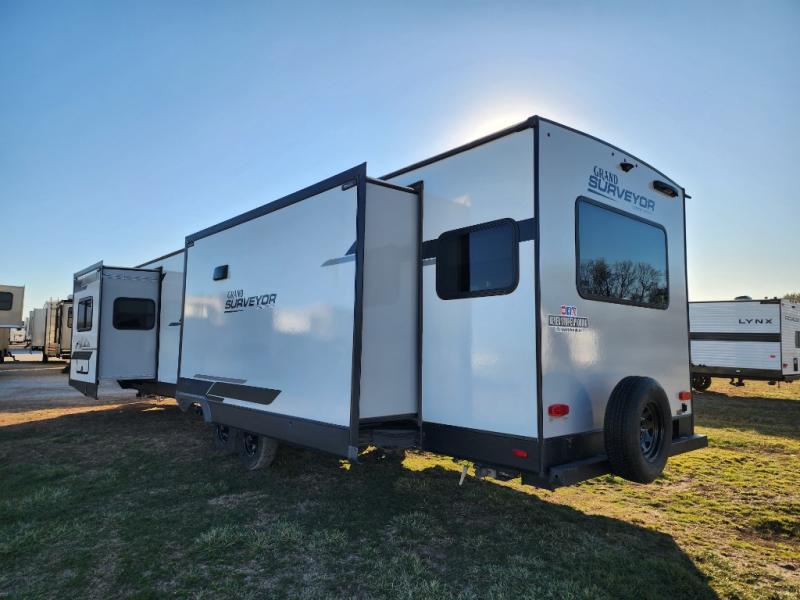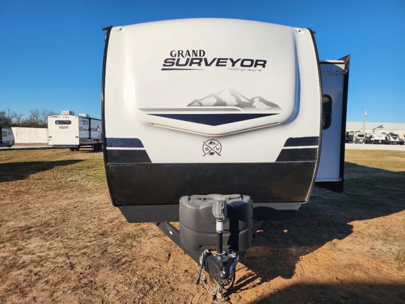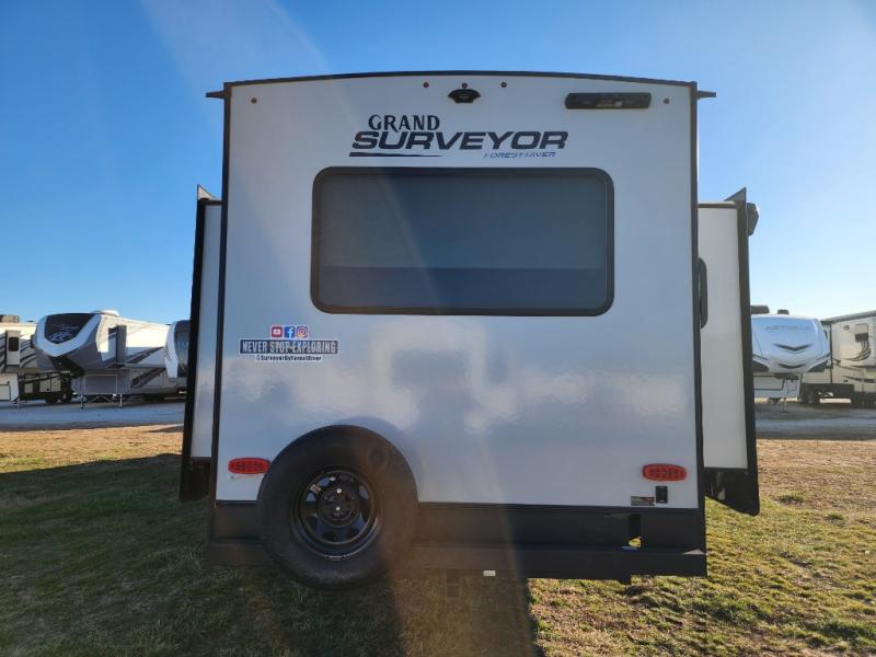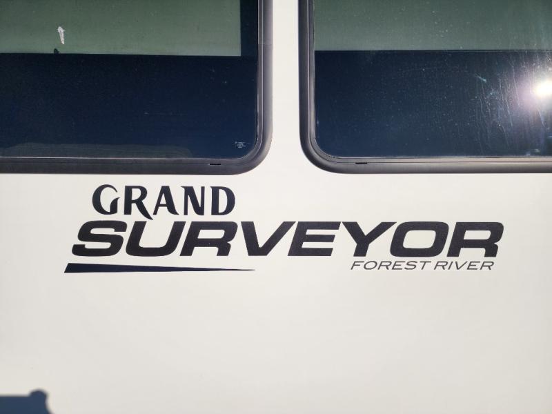 With any Grand Surveyor travel trailer by Forest River you will enjoy turn-key ready-to-go features and quality construction! Each model includes Azdel composite walls and a gel coated fiberglass front cap with an automotive style tinted windshield for a sleek look. There are friction hinge black glass entry door(s), an adjustable platform step with a night light, plus Goodyear tires and a power tongue jack for easy towing. The interior will have you feeling right at home with roller shades, residential faucets, sinks, and bathroom vanity, plus Surf(x) seamless countertops throughout. You can also plan for adventure with a 2" rear accessory and exterior spray port, and there are slam latch baggage doors throughout to keep all your gear secure. Other stand-out features include a central vacuum system, a 200 watt solar panel with a 30 amp controller, a tankless water heater, carpet-free interiors, and the list goes on!
