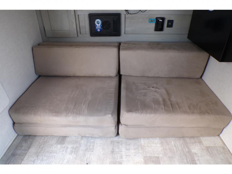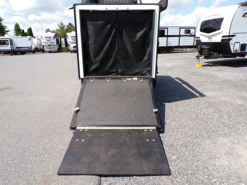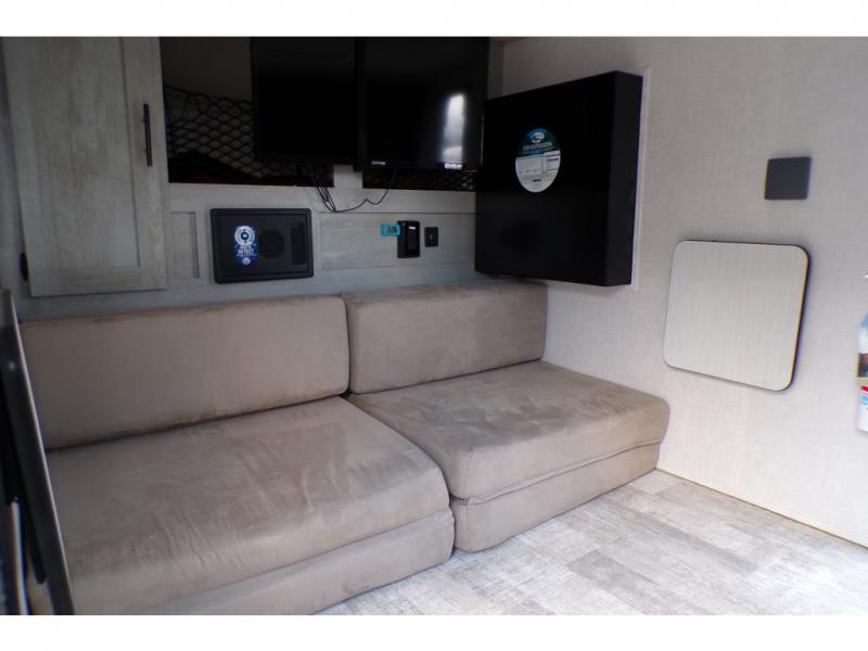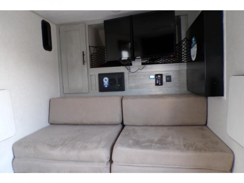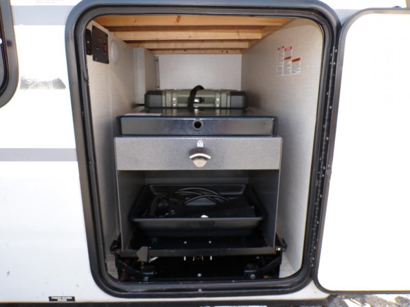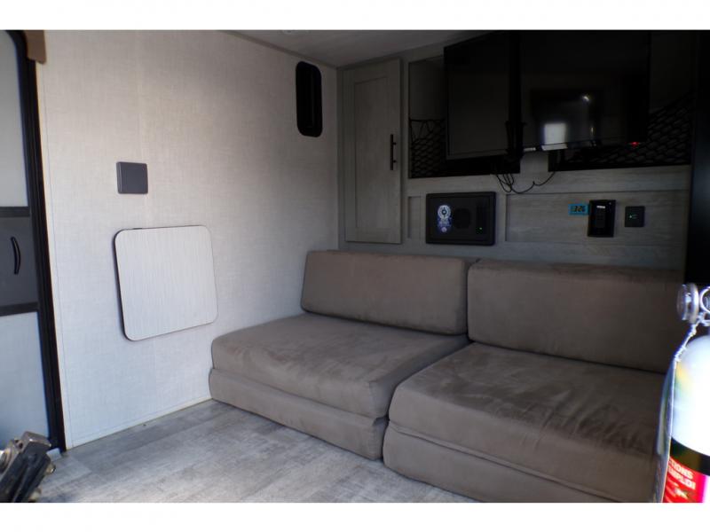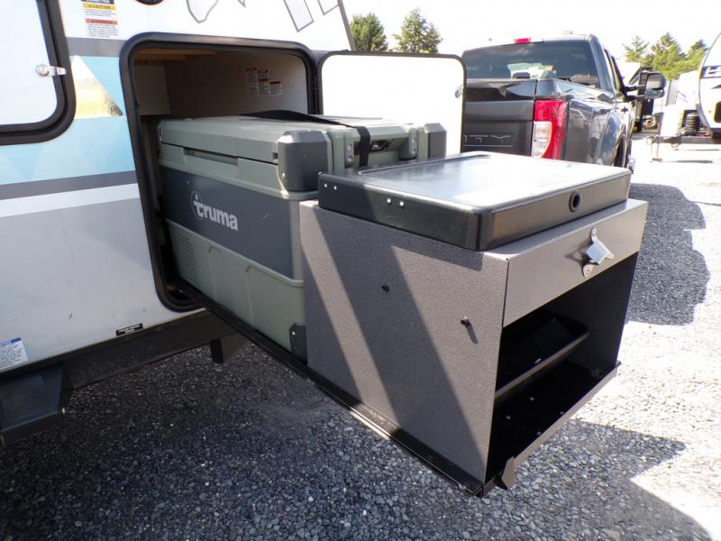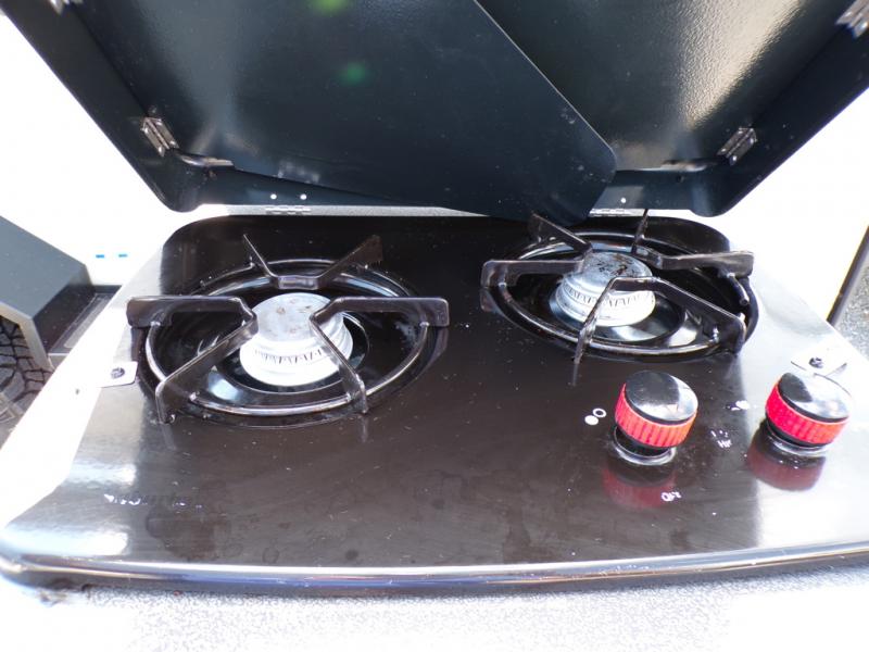 Enjoy lightweight towing and comfort with this dual entry travel trailer! Once you arrive at the campsite, you can grab your hiking boots from the storage and head out to find a trail or two. The queen-sized bed/sofa combo will provide a place to relax and sleep each night, plus a roof top tent! In the morning you can make breakfast at the outside kitchen that includes a refrigerator & a two burner cooktop.