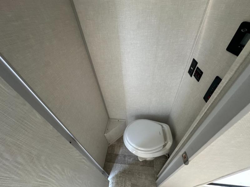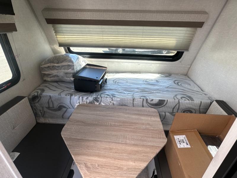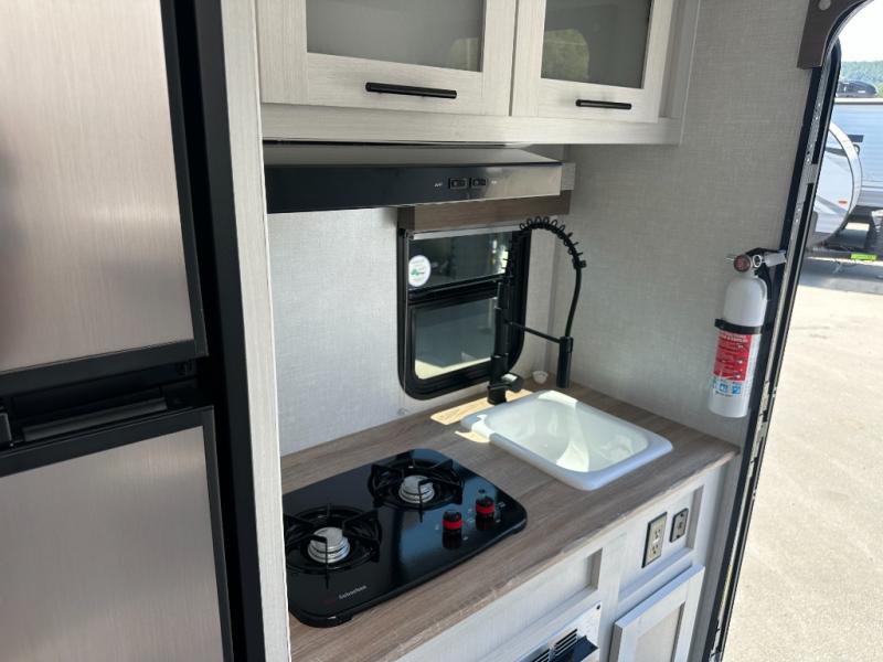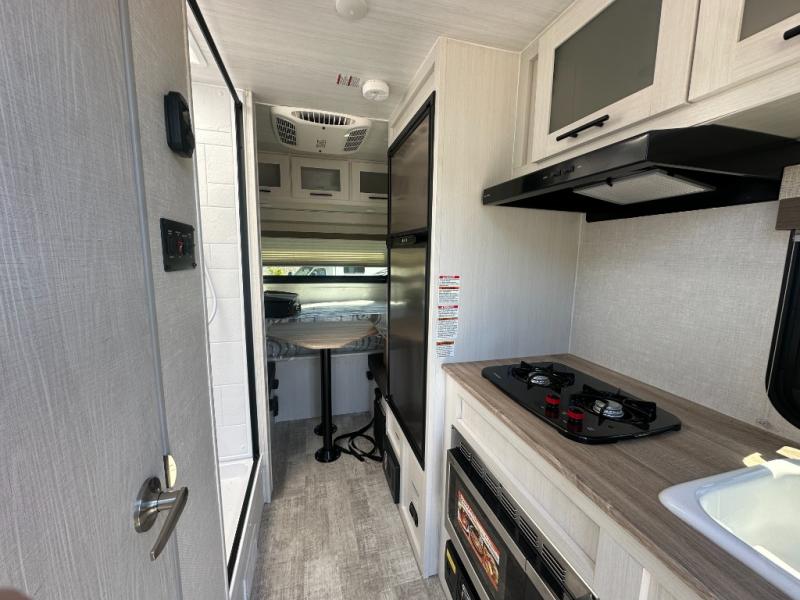 This is the perfect couples unit that features everything that you need to enjoy traveling and exploring yet keeping your tow length and weight down. The unique rear entry makes this unit easy to access, and just inside the rear door there is a private toilet area for quick access when you are outside and you need the bathroom. A front queen bed that is 60" x 74" provides a great night's rest, and can easily convert to a booth dinette when needed for inside seating and meals. The two burner cooktop, sink, and refrigerator allow you to make easy camp meals inside if you'd like.