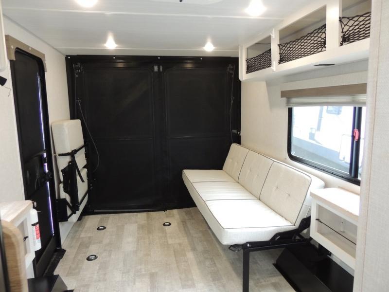 You'll be all set for your next adventure with this No Boundaries toy hauler! Not only do you have plenty of space to store your four-wheelers and dirt bikes in the 10' 7" garage, but you also have space to sleep on a queen-size bed, clean up with the full bathroom, create meals with the kitchen amenities, and relax with the flip-up sofa. If you want more space to spread out while you relax, just head outside to your camp chairs and pull out the 16' awning. There is also storage space on this trailer with the pantry, refrigerator, and overhead cabinets. Add the optional Unplugged package to take your camping experience to a whole new level.