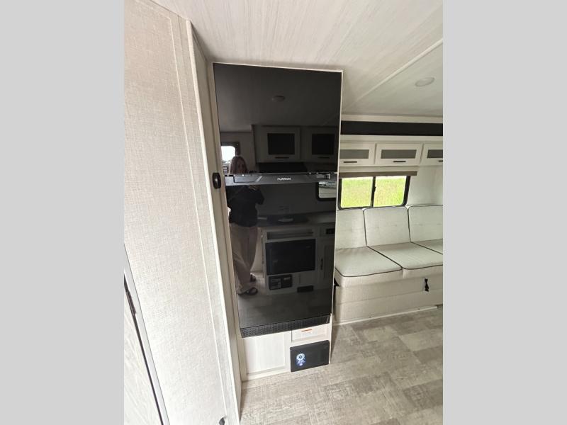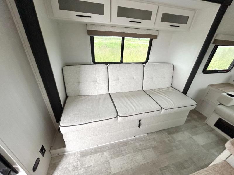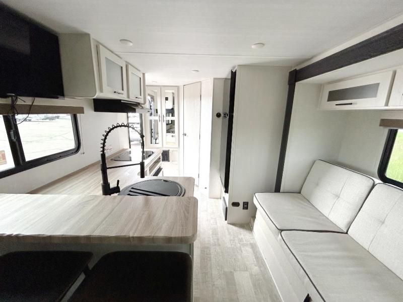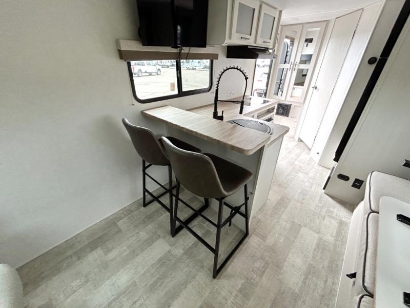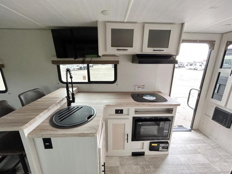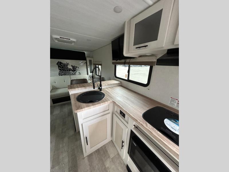 Make your camping dreams come true with this No Boundaries travel trailer! As you enter this unit, you'll notice an entryway closet/pantry that you can use to store your coats and scarves, and the full bathroom is also right in front of the entry door for easy access when you need it. The kitchen has great amenities, like a two-burner cooktop, a refrigerator, and a sink, and there is a breakfast bar with two stools where you can sit down with a fresh plate of eggs each morning. When you fold away the Murphy bed in the morning, you'll have a sofa to rest on throughout the day, plus an additional sofa within the slide out. And you can use the JBL FLIP portable Bluetooth speaker to listen to some music while you enjoy the day. Add the optional Unplugged package to take your camping experience to a whole new level.