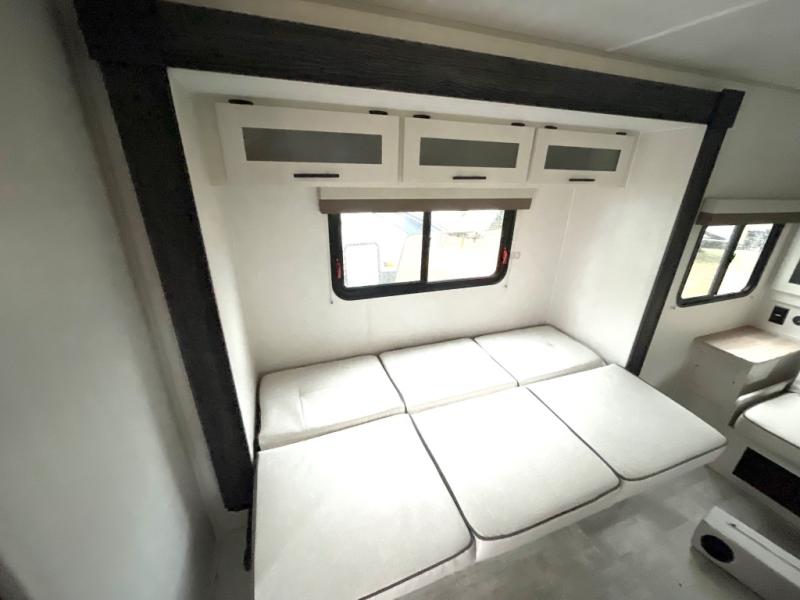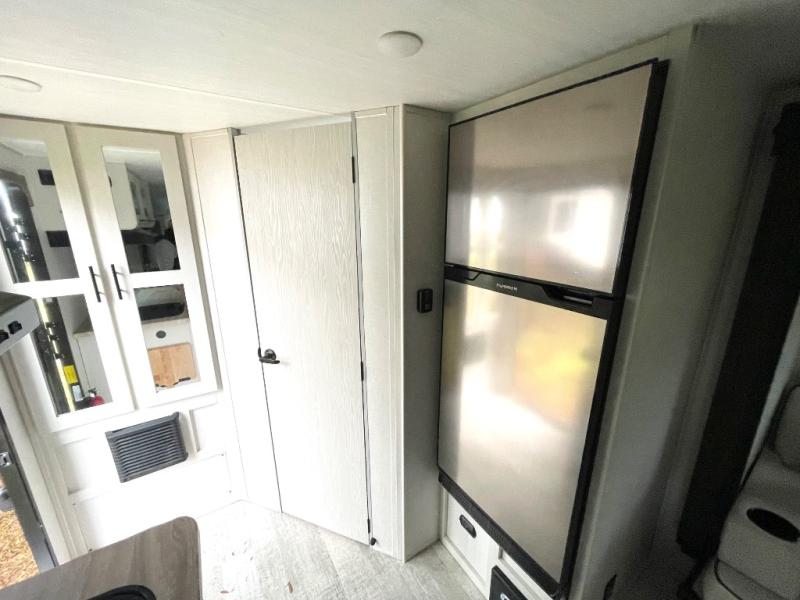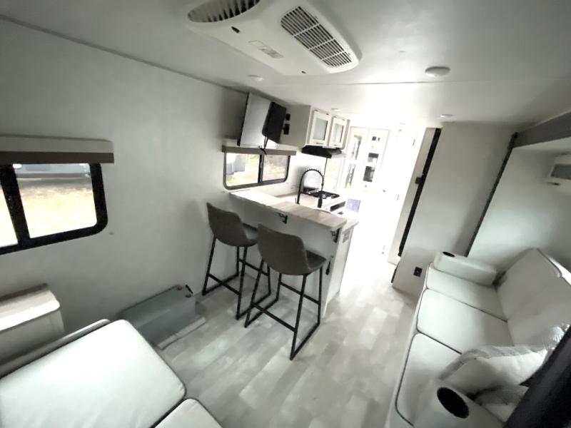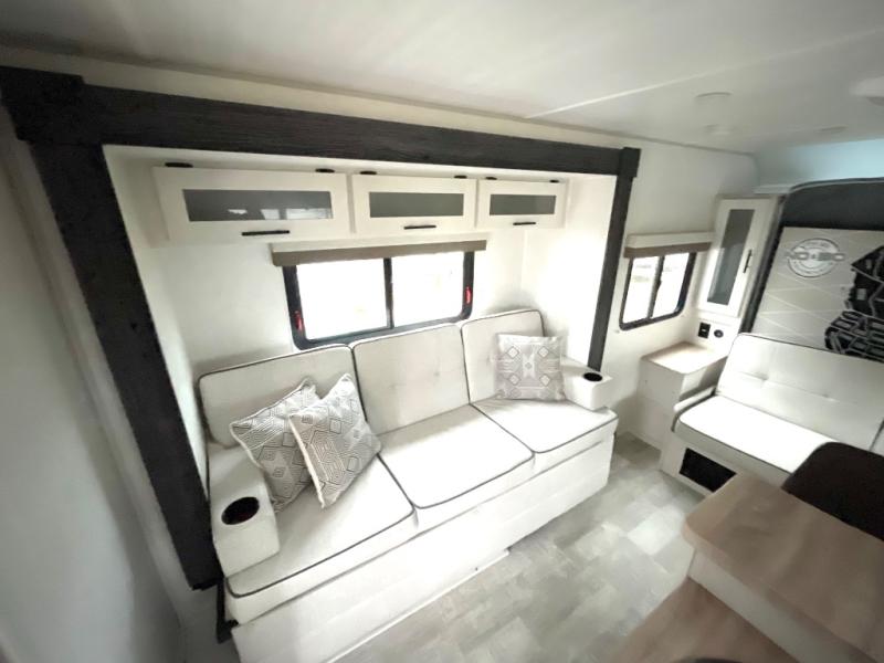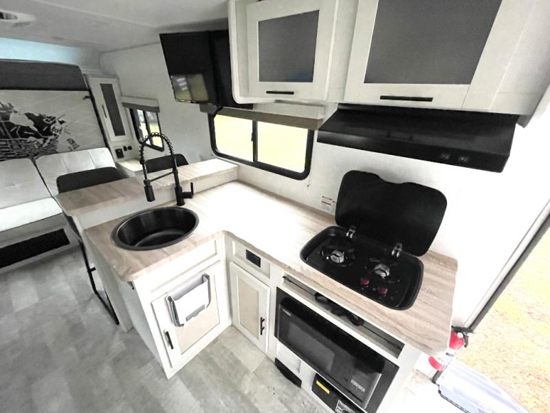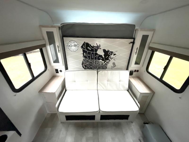 Make your camping dreams come true with this No Boundaries travel trailer! As you enter this unit, you'll notice an entryway closet/pantry that you can use to store your coats and scarves, and the full bathroom is also right in front of the entry door for easy access when you need it. The kitchen has great amenities, like a two-burner cooktop, a refrigerator, and a sink, and there is a breakfast bar with two stools where you can sit down with a fresh plate of eggs each morning. When you fold away the Murphy bed in the morning, you'll have a sofa to rest on throughout the day, plus an additional sofa within the slide out. And you can use the JBL FLIP portable Bluetooth speaker to listen to some music while you enjoy the day. Add the optional Unplugged package to take your camping experience to a whole new level.