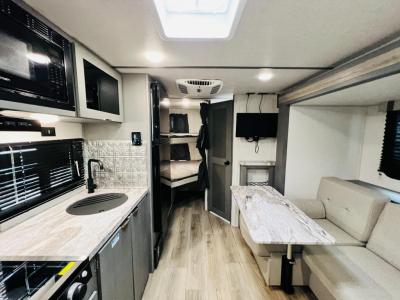 You can create the perfect oasis with this Ozark travel trailer! The exterior is outfitted with a 14' power awning to protect you from the hot summer sun and rain. On the interior, there is extra roominess thanks to the single slide. This slide holds the convertible chaise lounge with a table where you can dine at. The Murphy bed is especially useful when you are trying to be frugal with your space because it can fold away to reveal a sofa during the day allowing more space to move about. The double-size bunks provide plenty of sleeping space, and the panoramic window and shower skylight let the sunshine in.