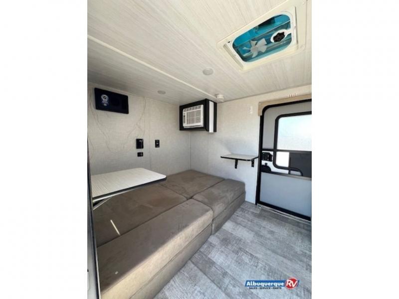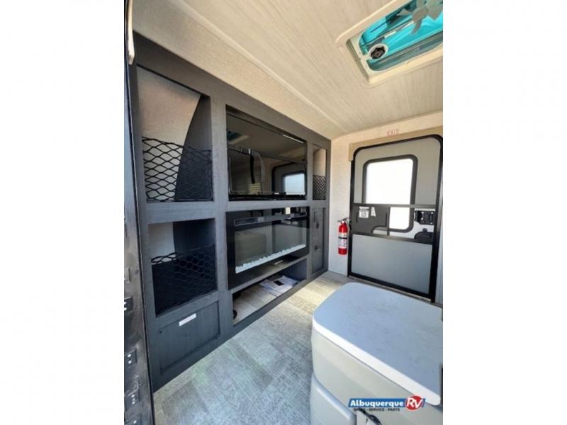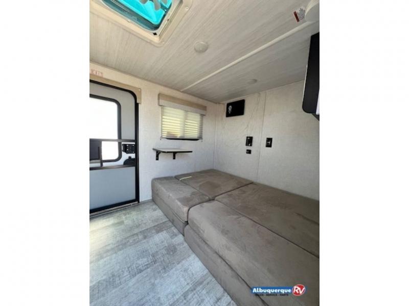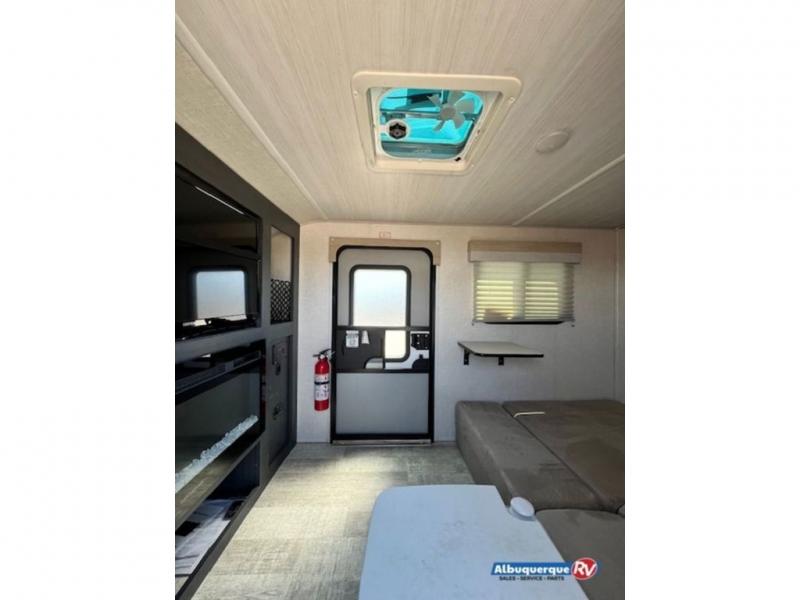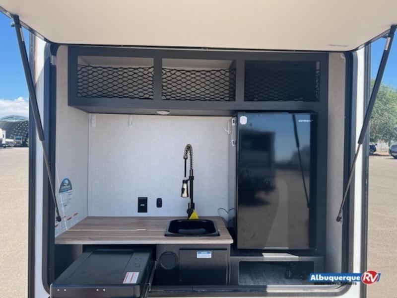 Enjoy lightweight towing and comfort with this dual entry travel trailer! Once you arrive at the campsite, you can grab your hiking boots from the storage and head out to find a trail or two. The queen-sized bed/sofa combo will provide a place to relax and sleep each night, and there is even a fireplace here to make this area more cozy. In the morning you can make breakfast at the rear outside kitchen that includes a refrigerator, a two burner cooktop, and a sink.