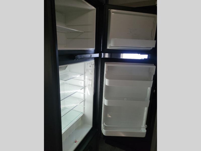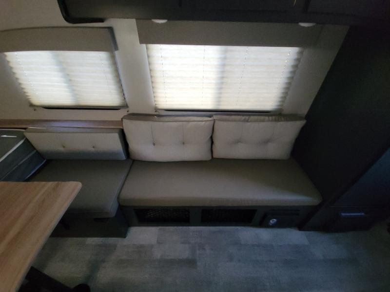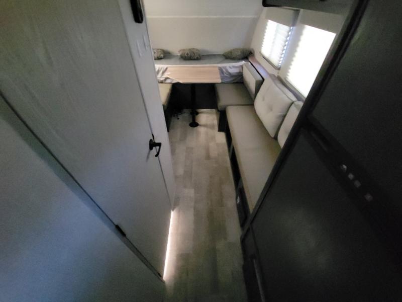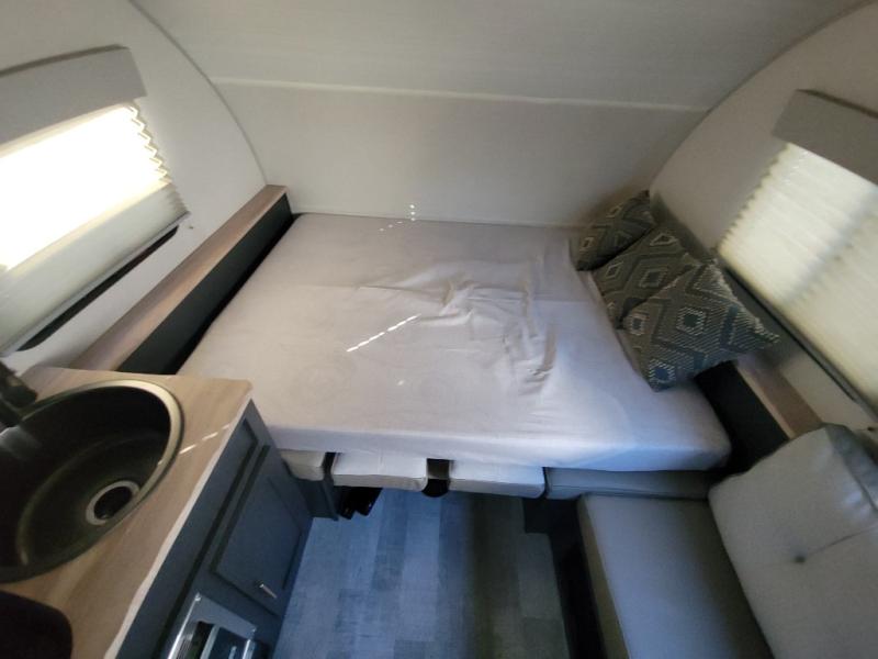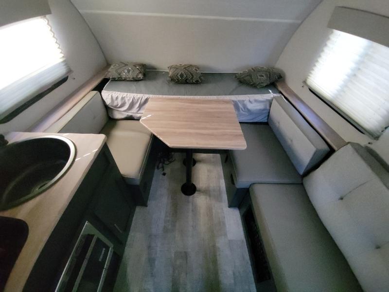 Weekends at the lake just got sweeter in this cozy R Pod travel trailer. You can prepare your meals each day on the two burner recessed cooktop, or in the convection microwave. There is a sofa to relax on with a good book, plus a booth dinette up front that features a Murphy bed you can fold down at night. This model also includes a refrigerator to keep your perishables fresh, and a pantry to store snacks and dry goods.