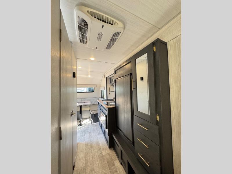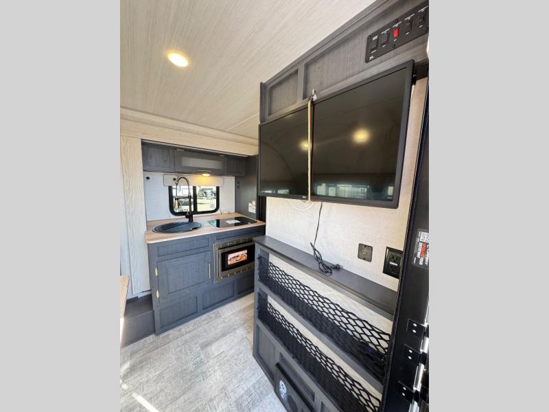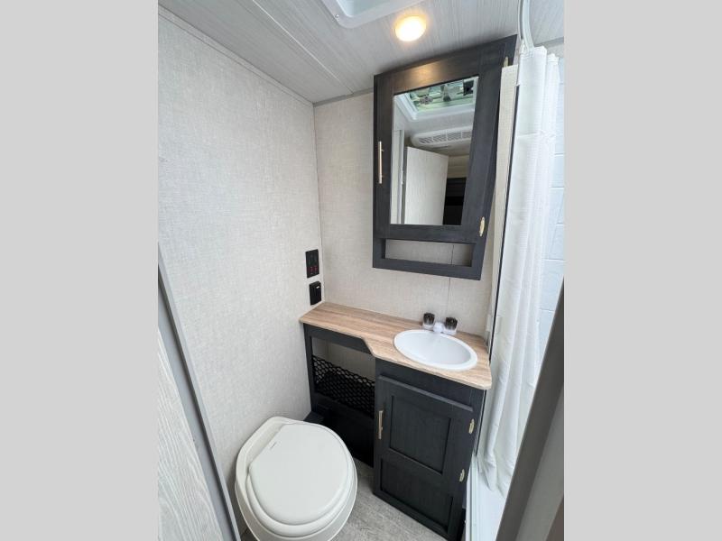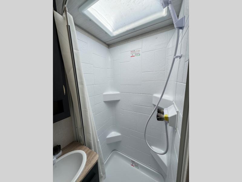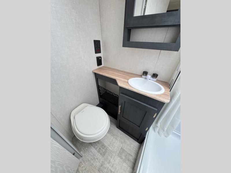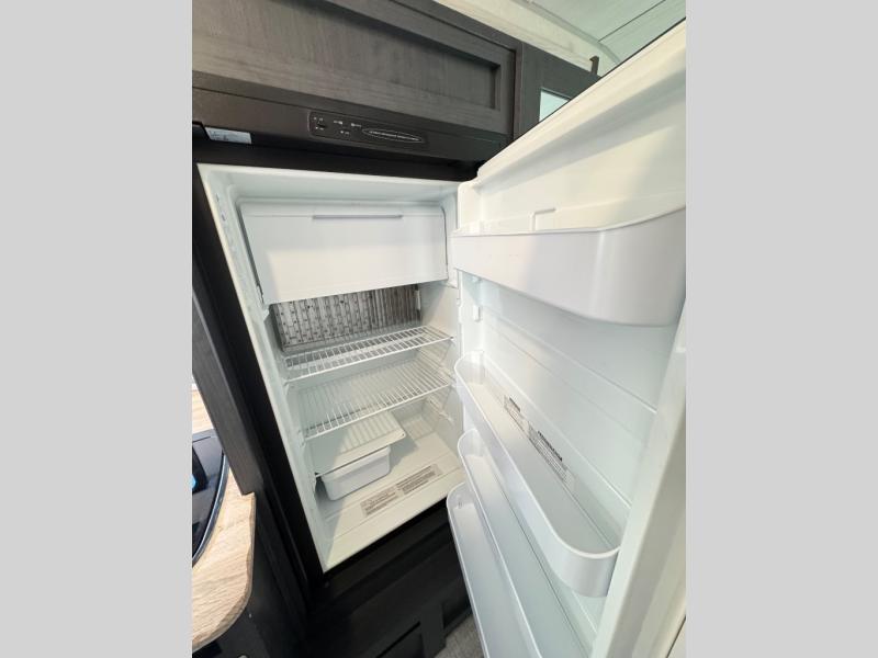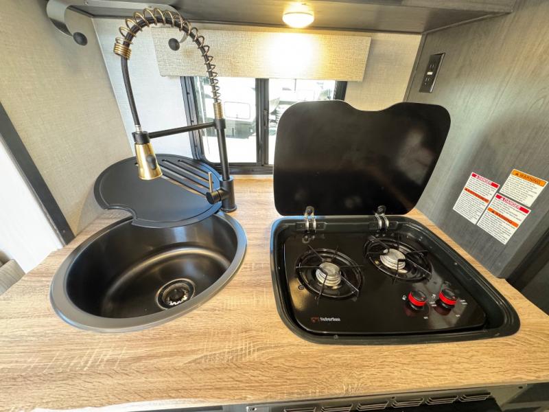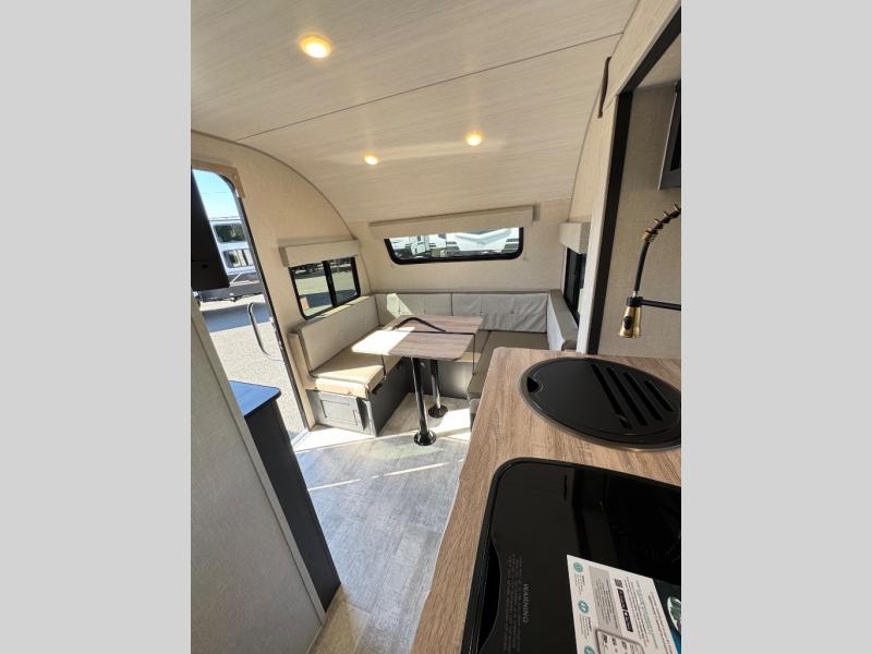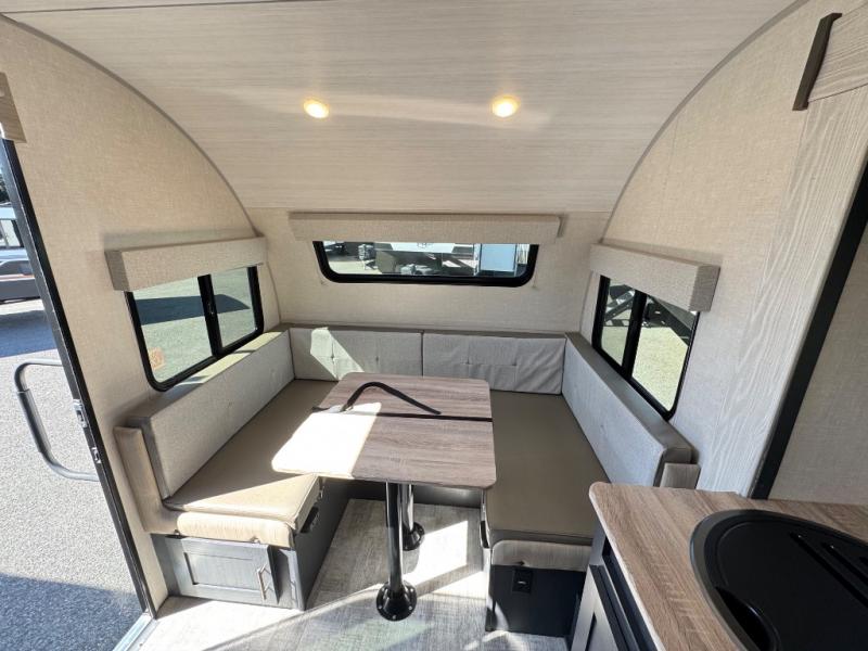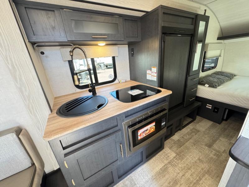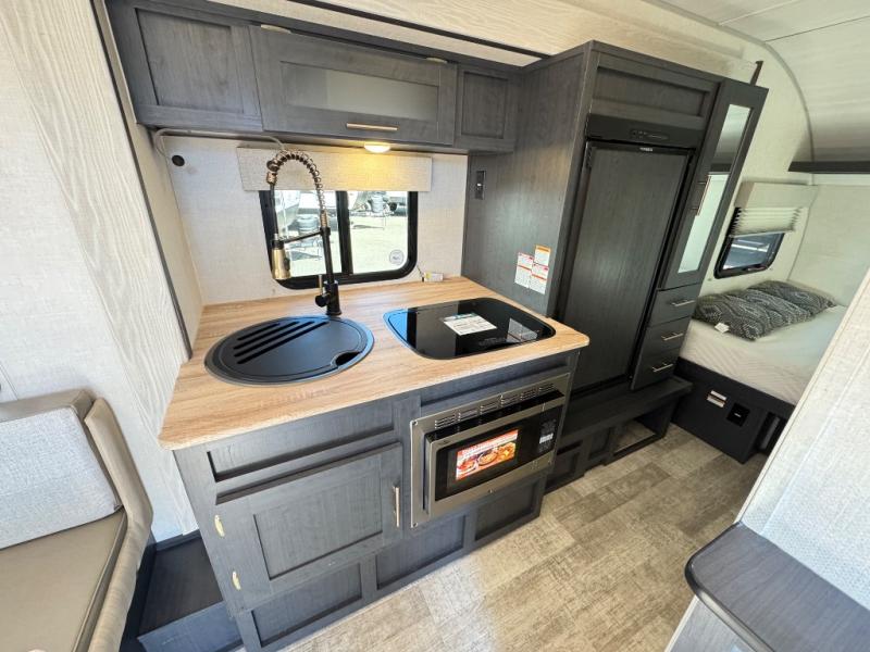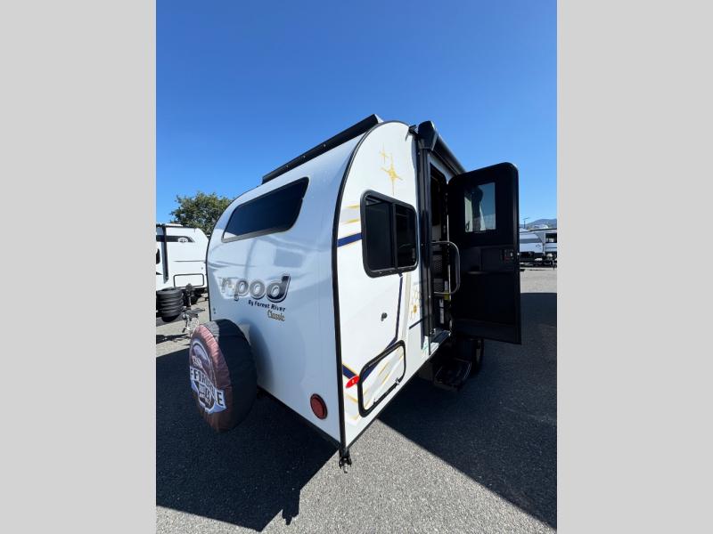 With any R Pod Classic travel trailer by Forest River, you will enjoy at home-comforts and lightweight towing. There are magnetic door catches that will easily keep the door open when you're packing hiking gear or bringing in your luggage. Each model includes 30 Amp service with a detachable power cord, a 20 lb. propane tank with a cover, and a high efficiency roof-mounted air conditioner that will keep you cool during the summer camping months. Inside, you'll find a two burner recessed cooktop with a flush mount glass cover, a convection microwave, and new Cosmetic Graphite interior for a modern look you will love.