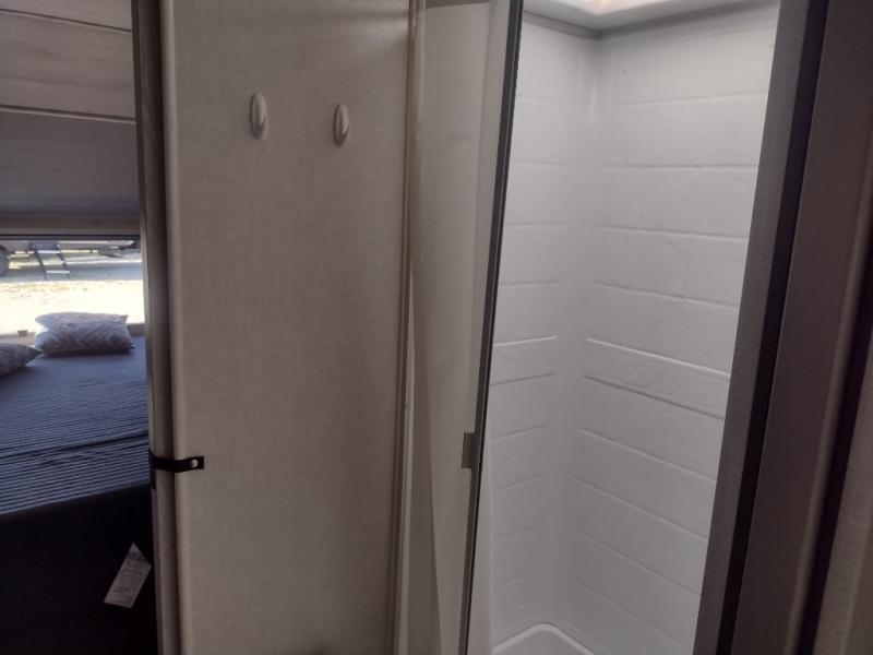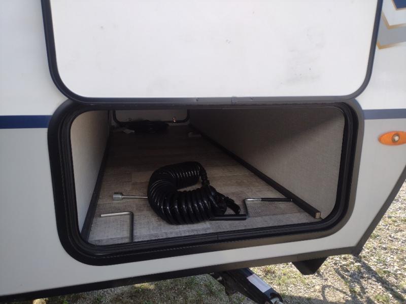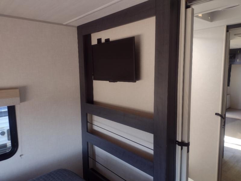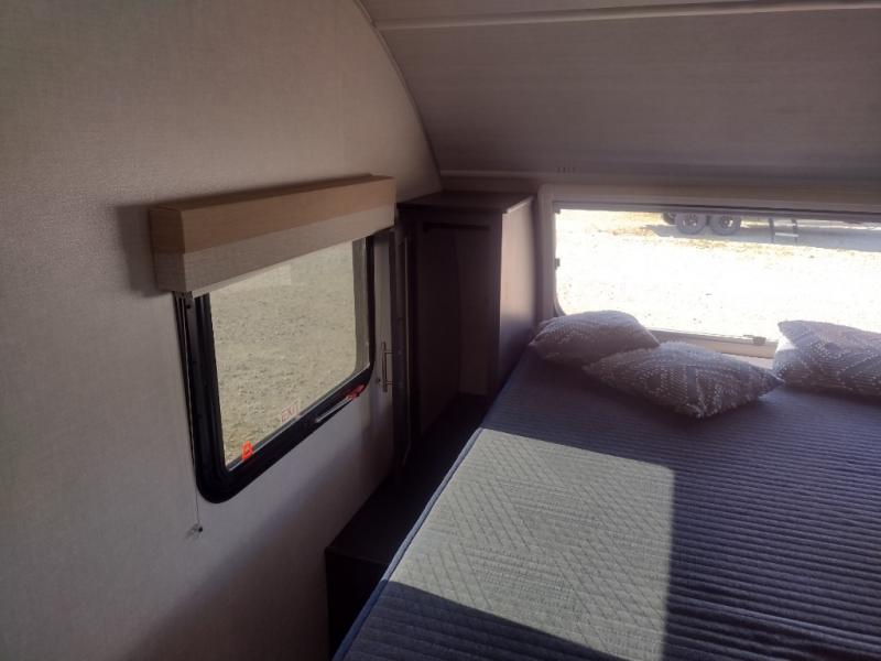 This R Pod travel trailer has quite a few features that will attract your attention! First of all, there booth dinette in front of the LED TV so that you can view your movies in comfort. The walk-through bath gives you an entrance door on both sides, and it also allows you to directly enter the bathroom from the front bedroom. Underneath the RV queen bed in the bedroom, there is under-bed storage so you can keep some sweaters and boots hidden away without taking up any walking space in the bedroom.