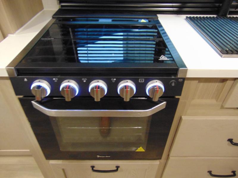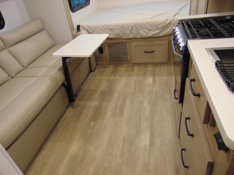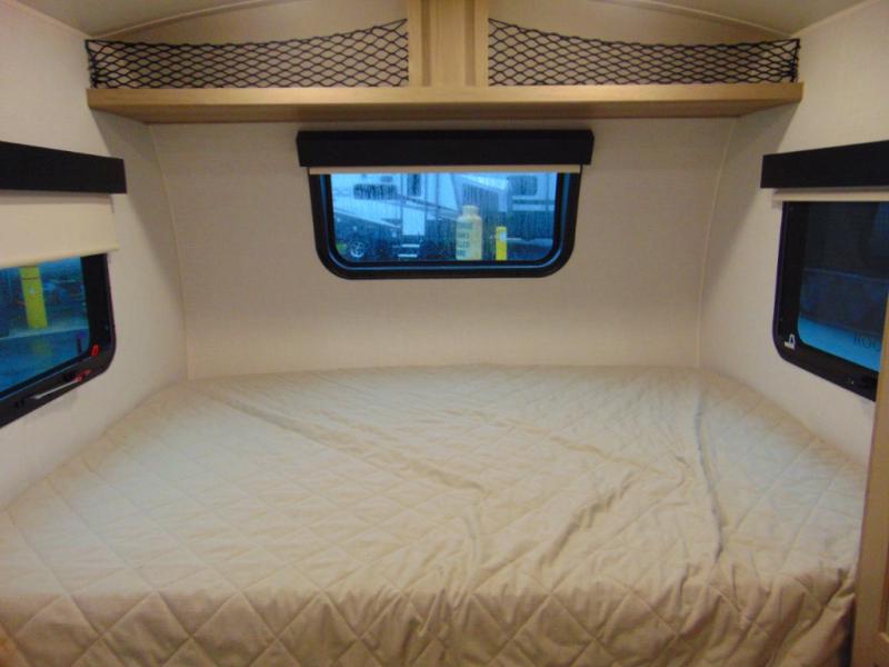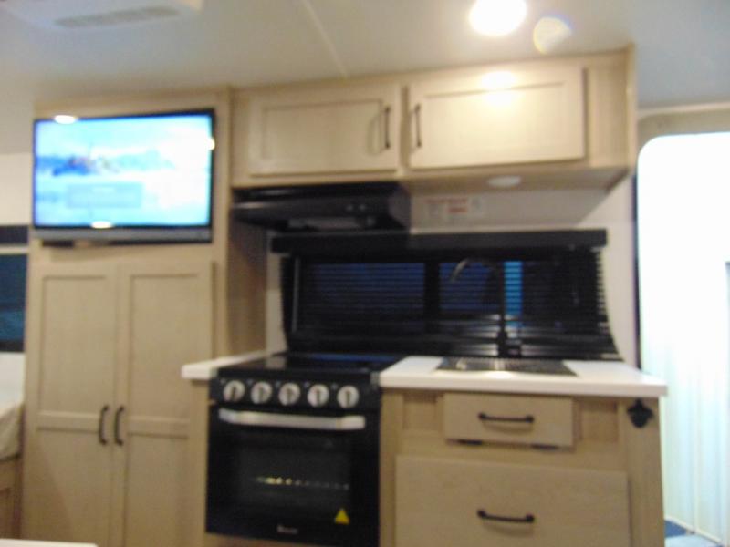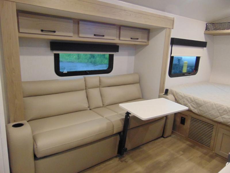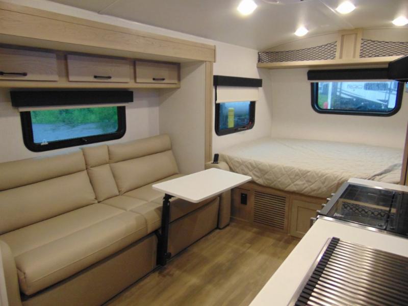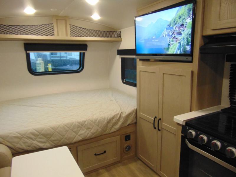 This is the perfect couple's trailer, so sneak away for a weekend in the woods. There is a 72" sofa with cupholders with a table that will be perfect for meals times and relaxing. This model includes a 32" 12V TV to keep you busy on those rainy days, and the queen bed will provide a great night's rest. This model also includes an outside griddle and an 11' power awning so you can enjoy those nice days outdoors!