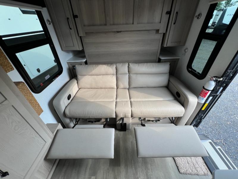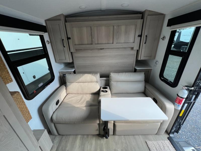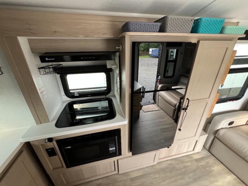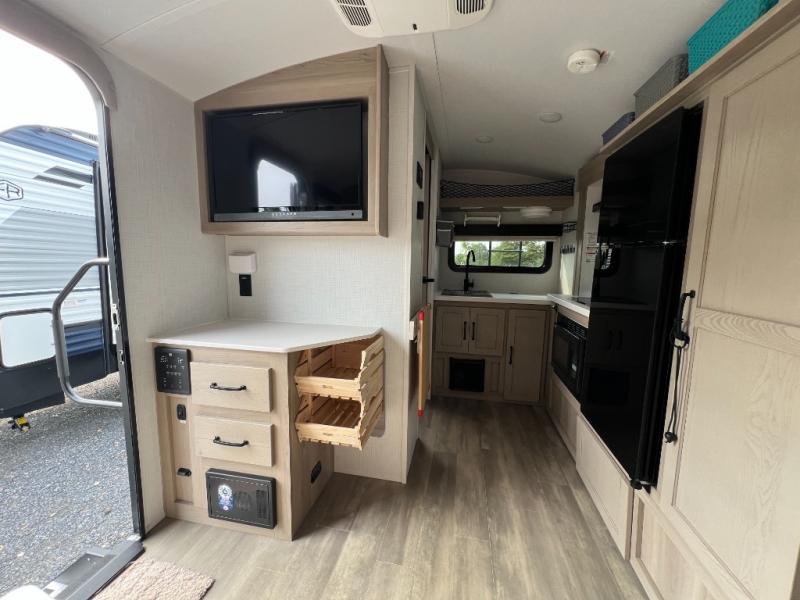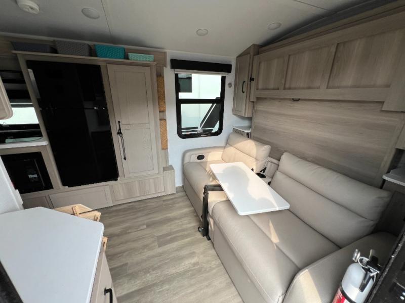Pack your bags and head to your local state park in this travel trailer! You will love the extra space you have thanks to the kitchen slide out, and the jack knife sofa can fold away at night so you can sleep on the Murphy bed! This model includes a 32" 12V TV to keep you entertained on those rainy days, and the full bath will let you get cleaned up if you decide to hike despite the weather. There will be plenty of storage space for your belongings and gear since there is a pass-through storage and additional exterior storage, and don't overlook the exterior griddle for breakfast outdoors!