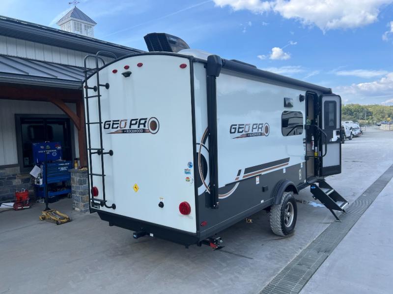 With any Rockwood GEO Pro travel trailer by Forest River you will enjoy easy towing, durable construction, and off-road capabilities with larger 15" tires and a lift kit! Package A includes a 200W solar panel and an 1800W inverter to go off-grid when you want, a tire pressure monitoring system and Key Alike door and compartment locks, plus a power awning to relax outdoors. Each model is constructed with complete composite wall construction for added strength and durability, and the torsion axle, Rubber-Ryde suspension will make towing easier than ever. Inside, you'll find sleek roller shades and hidden hinge cabinet doors, a 12V refrigerator and a microwave, plus a 20,000 BTU furnace to keep you warm during the colder camping months.
