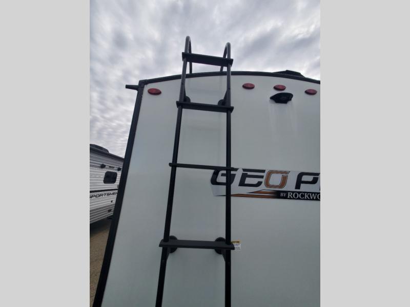 With any Rockwood GEO Pro travel trailer by Forest River you will enjoy easy towing, durable construction, and off-road capabilities with larger 15" tires and a lift kit! Package A includes a 200W solar panel and an 1800W inverter to go off-grid when you want, a tire pressure monitoring system and Key Alike door and compartment locks, plus a power awning to relax outdoors. Each model is constructed with complete composite wall construction for added strength and durability, and the torsion axle, Rubber-Ryde suspension will make towing easier than ever. Inside, you'll find sleek roller shades and hidden hinge cabinet doors, a 12V refrigerator and a microwave, plus a 20,000 BTU furnace to keep you warm during the colder camping months.